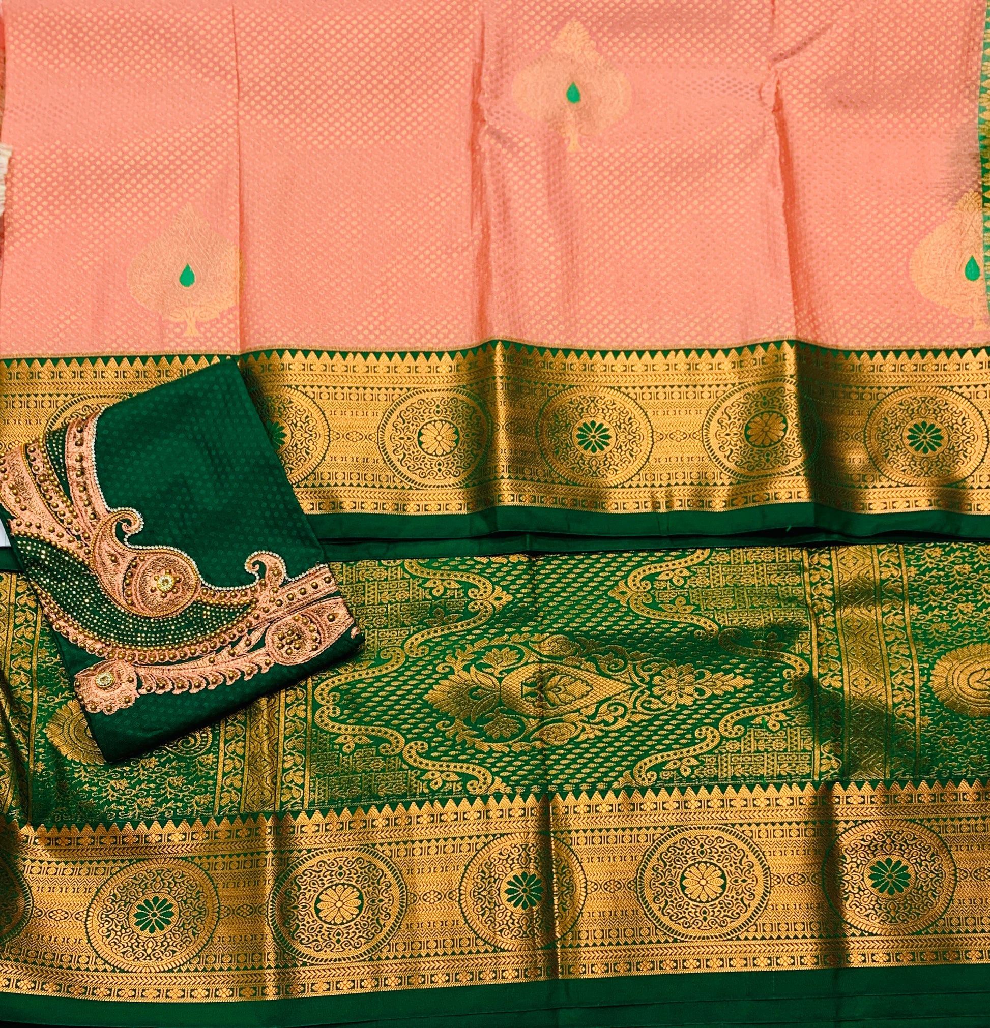 Bridal Vegan Silk Saree Sandal Colour with Green Border with Unstitched blouse in Aari work.