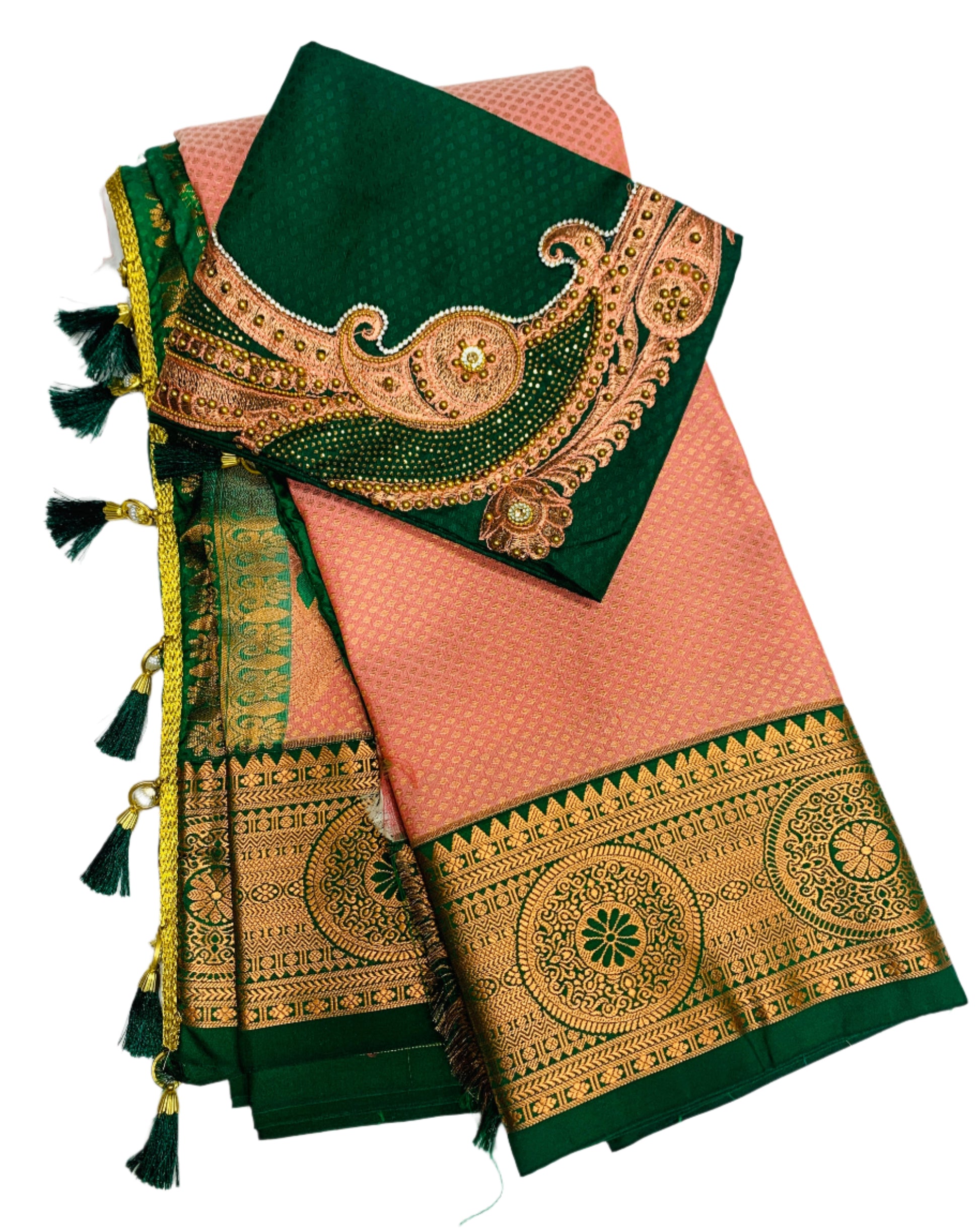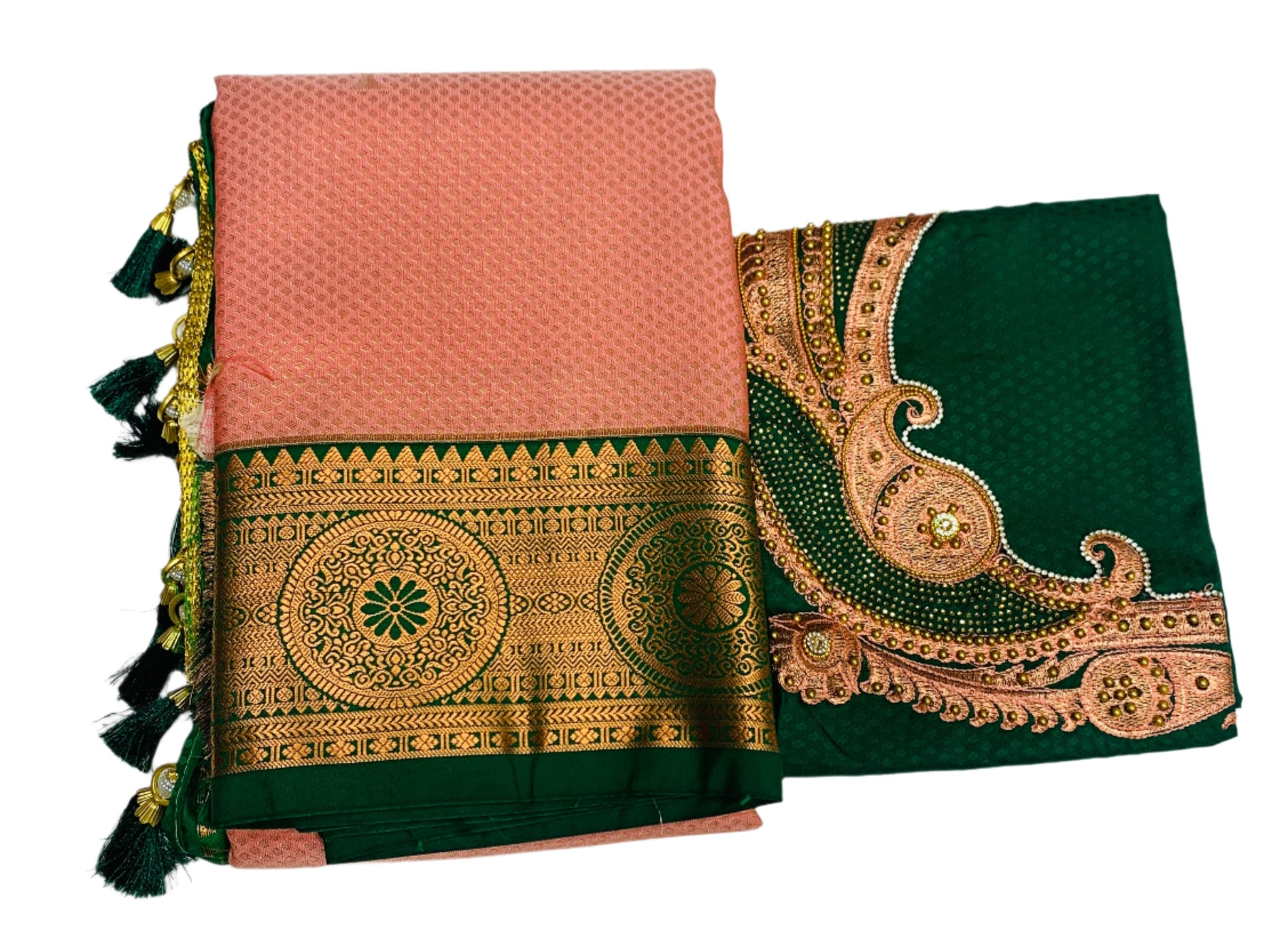 Bridal Vegan Silk Saree Sandal Colour with Green Border with Unstitched blouse in Aari work
