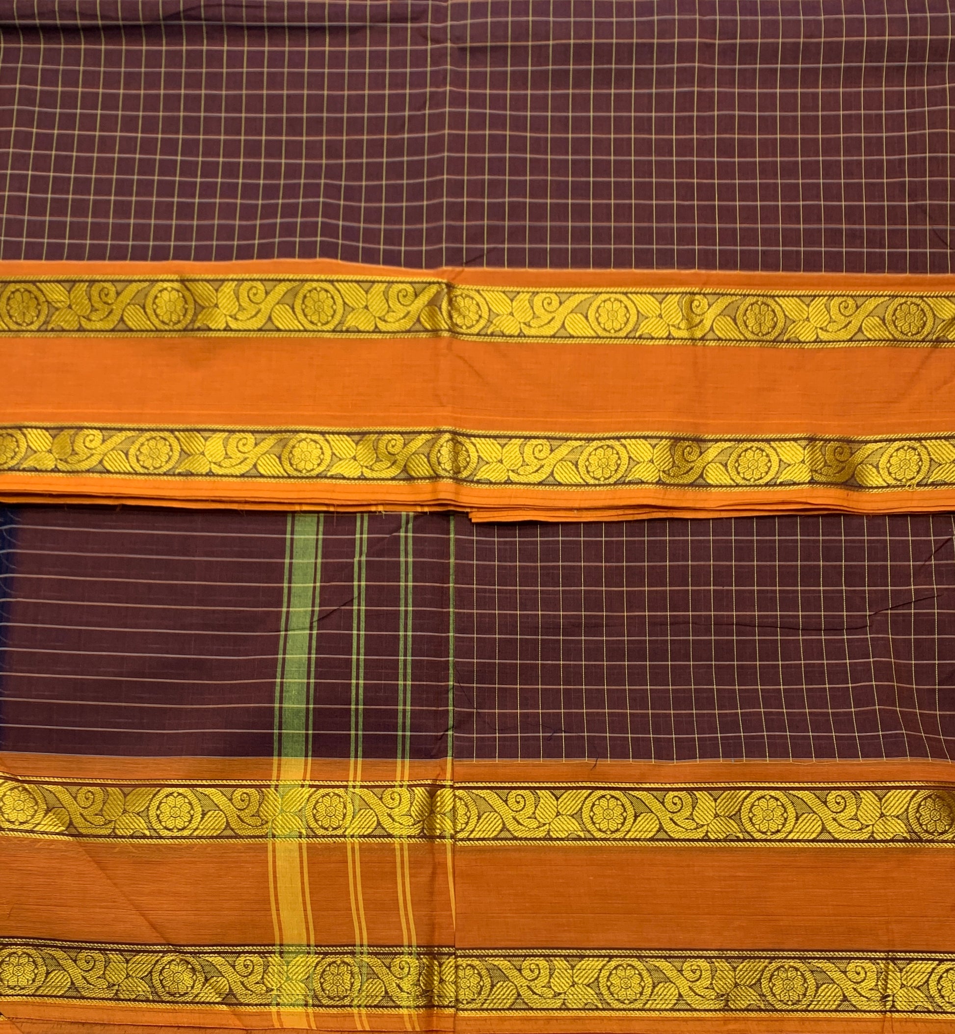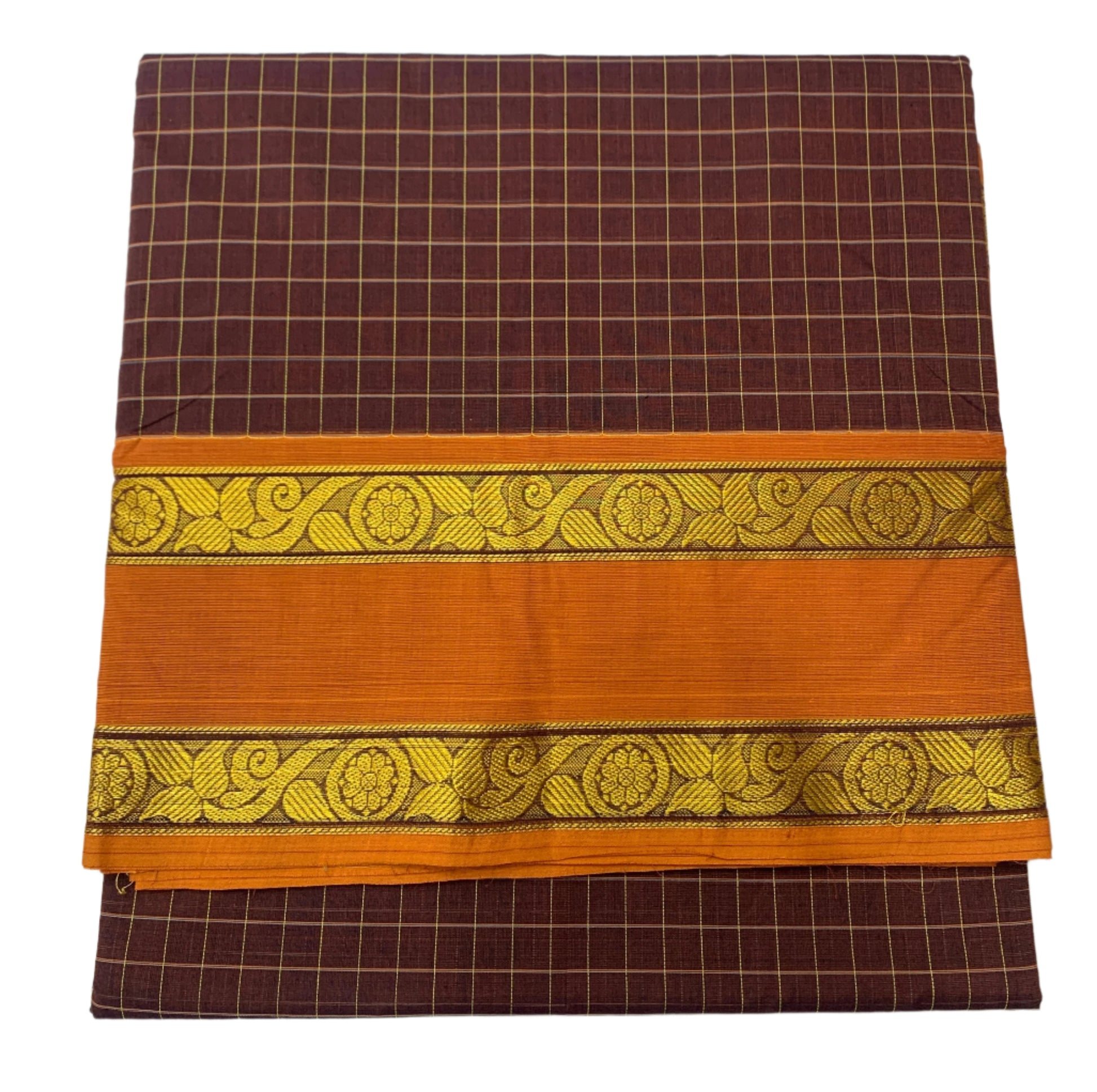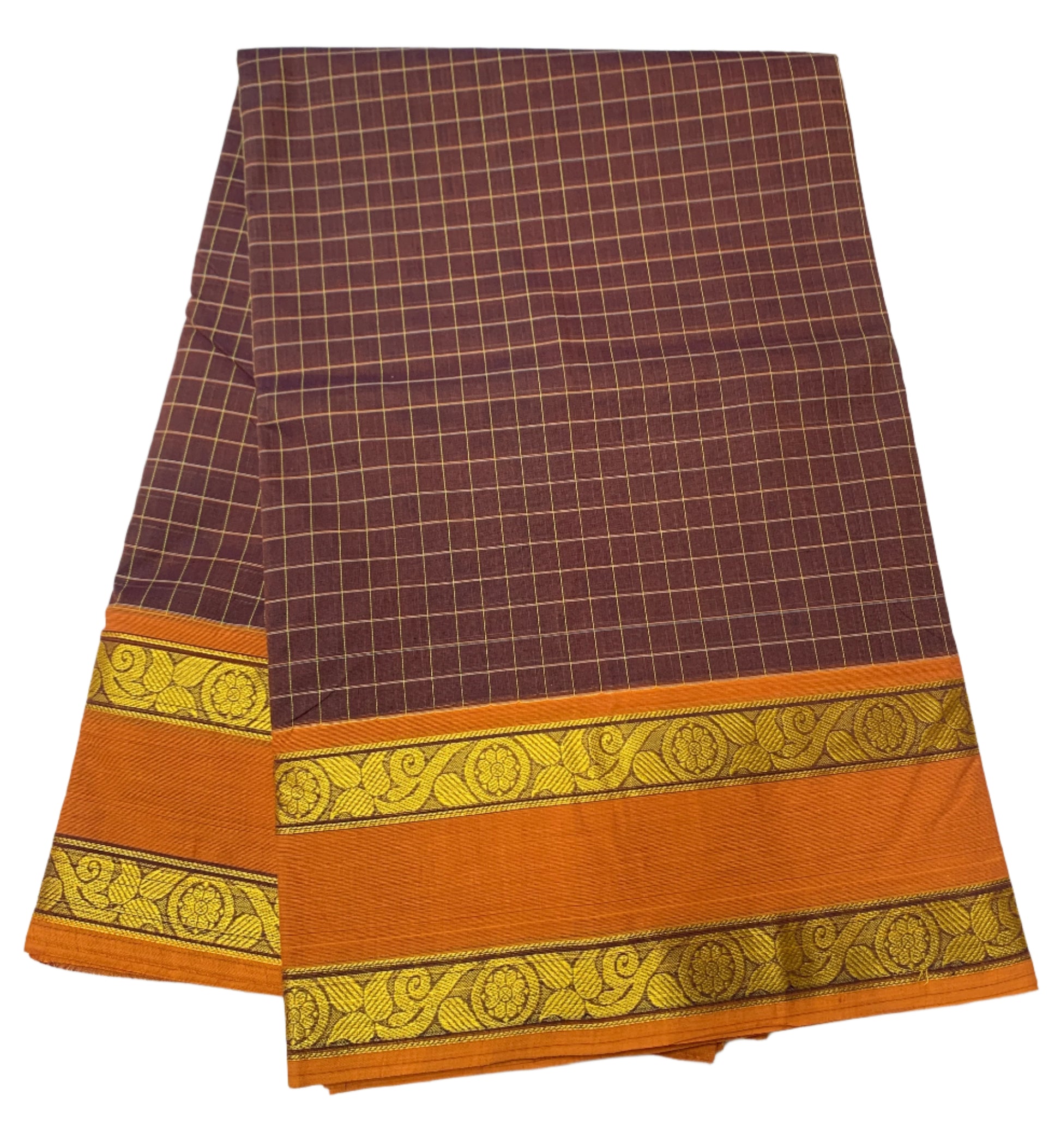 9 yards Cotton Saree Brown Colour with Orange Border.