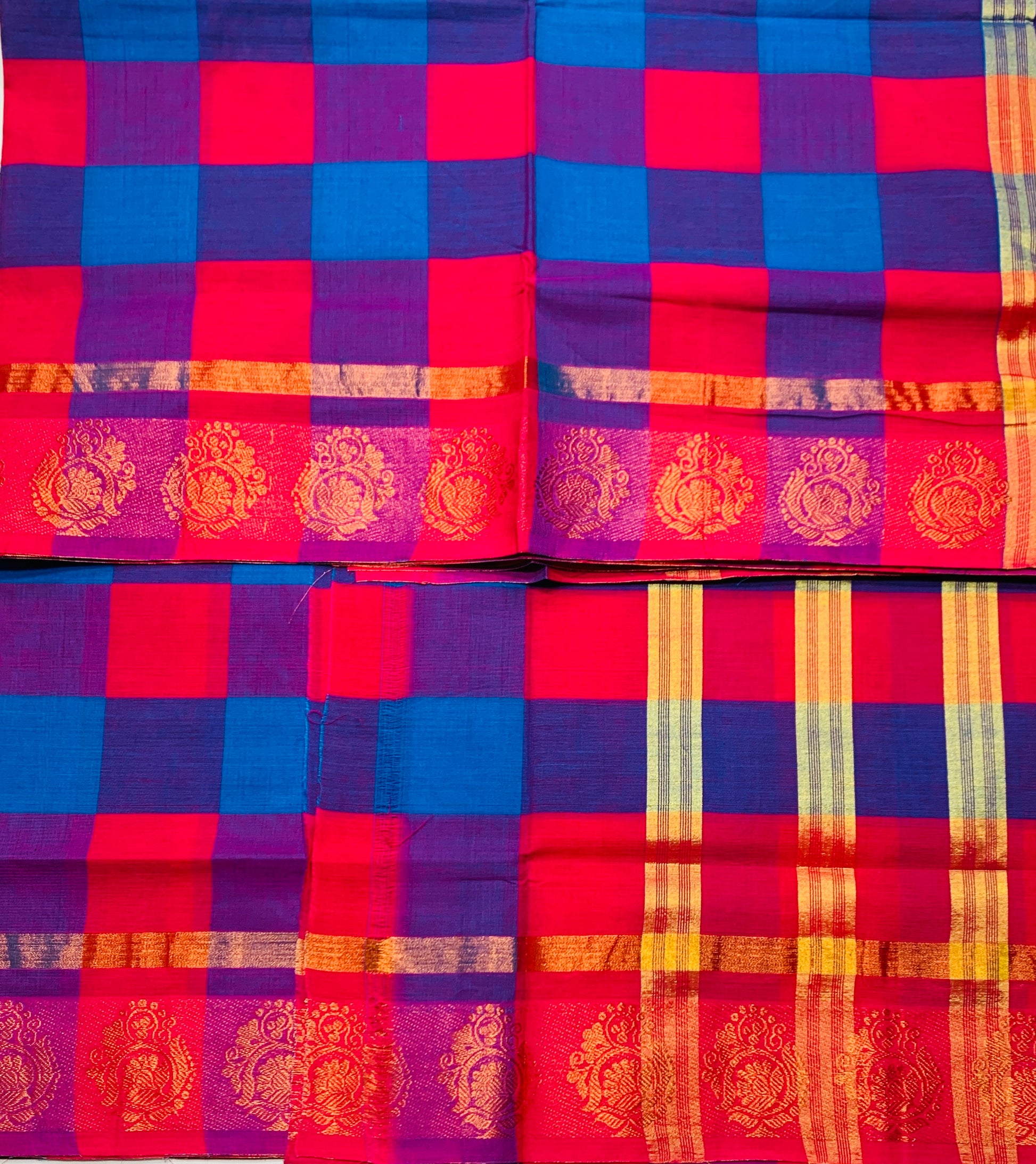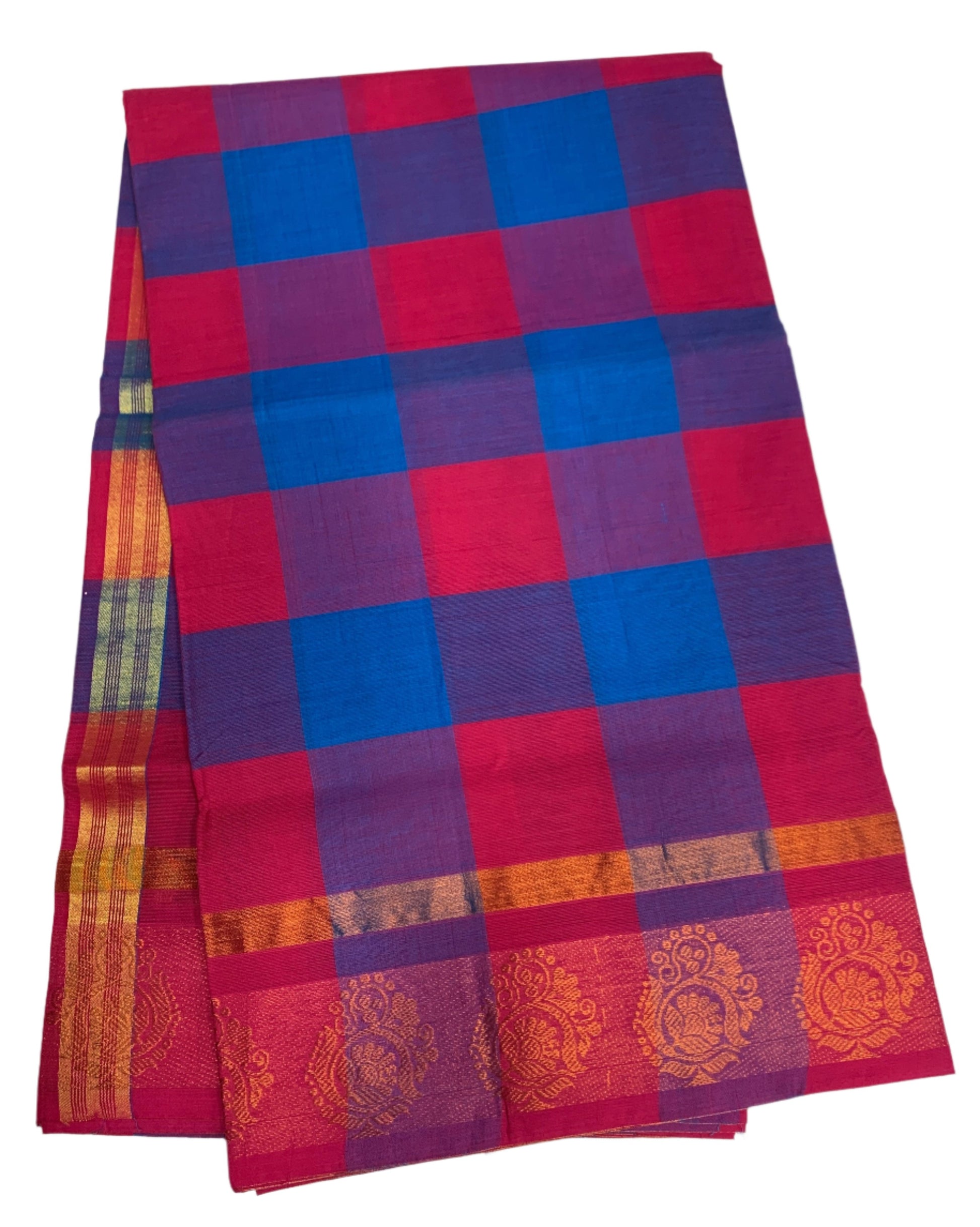 Chettinad Cotton Saree Pink and Blue Colour with Checked Design .Light weight and easy to drape.