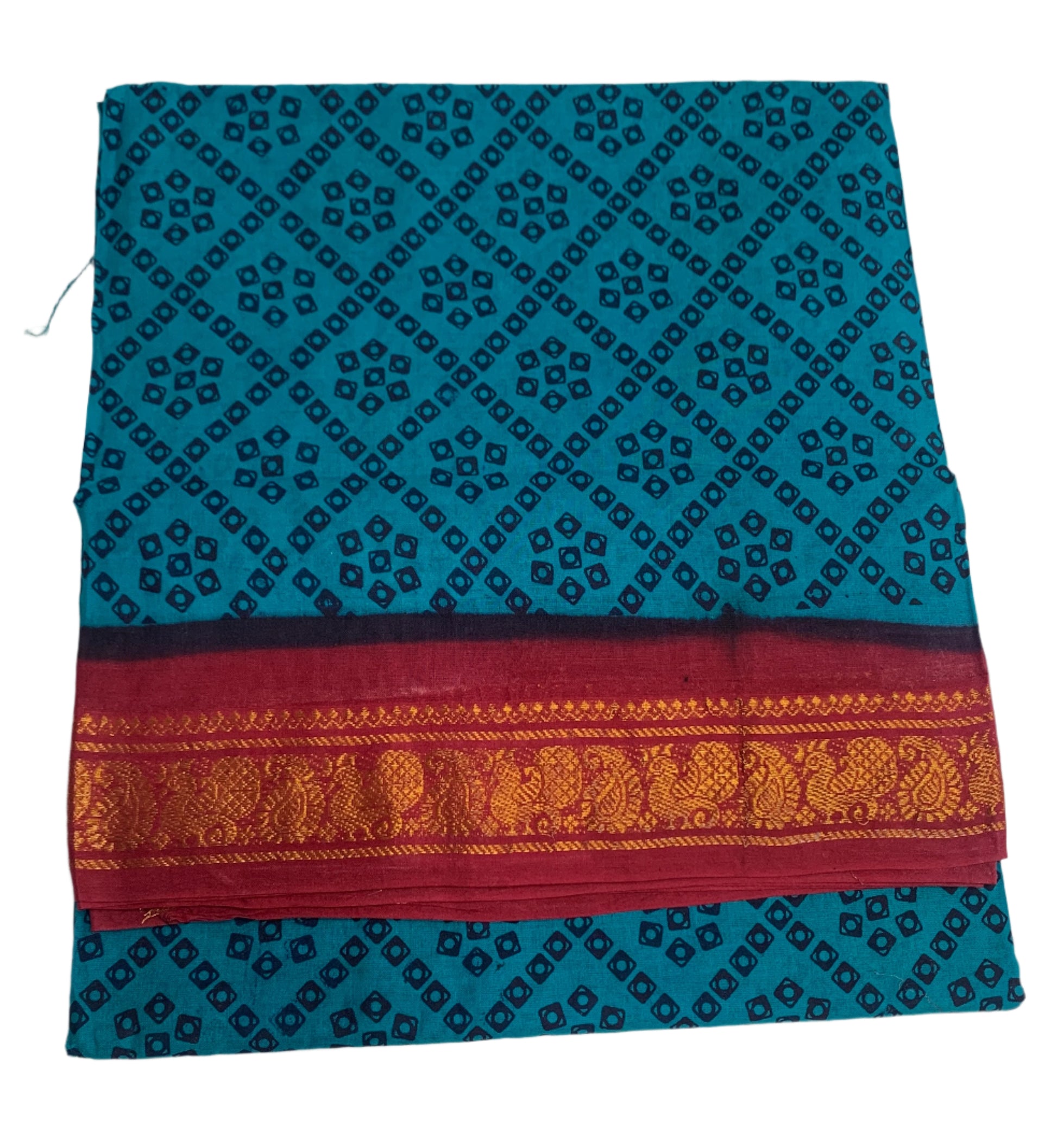 Chettinad Sungudi Cotton Deep Aqua Blue Colour with Printed Saree with Maroon Colour with Annam and Mango Design. Light weight and easy to drape.