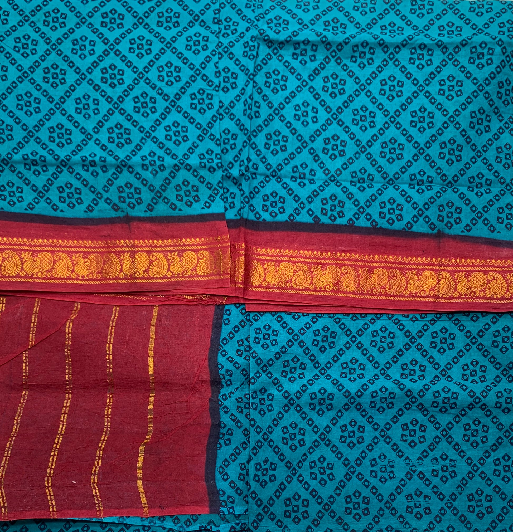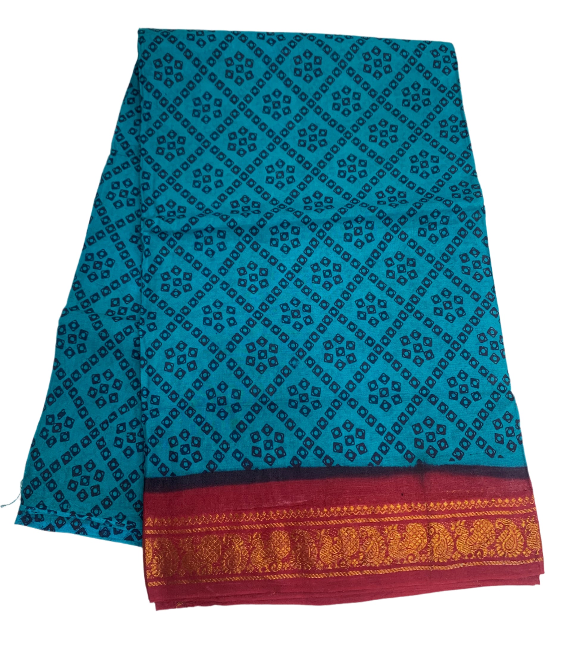 Chettinad Sungudi Cotton Deep Aqua Blue Colour with Printed Saree