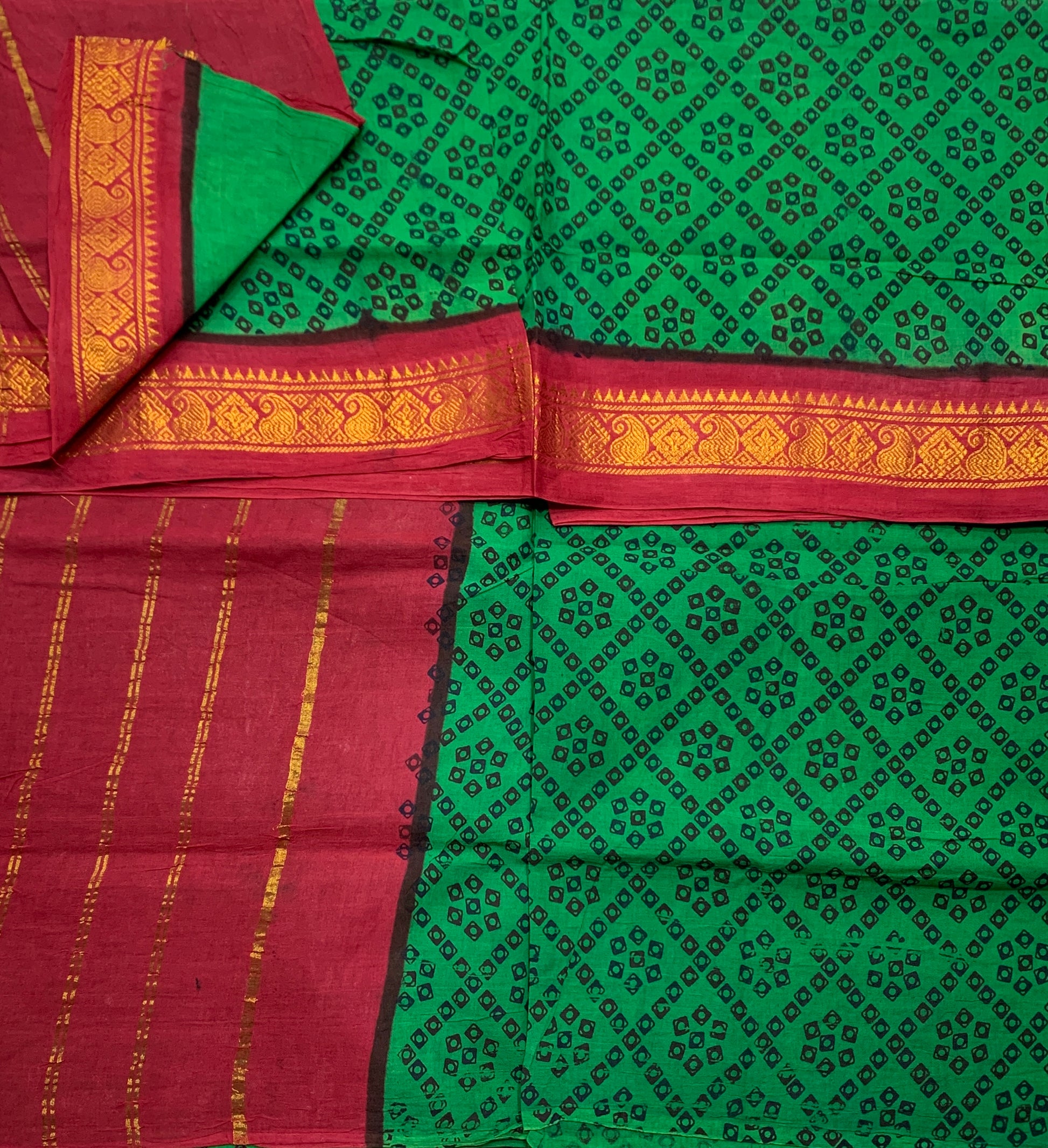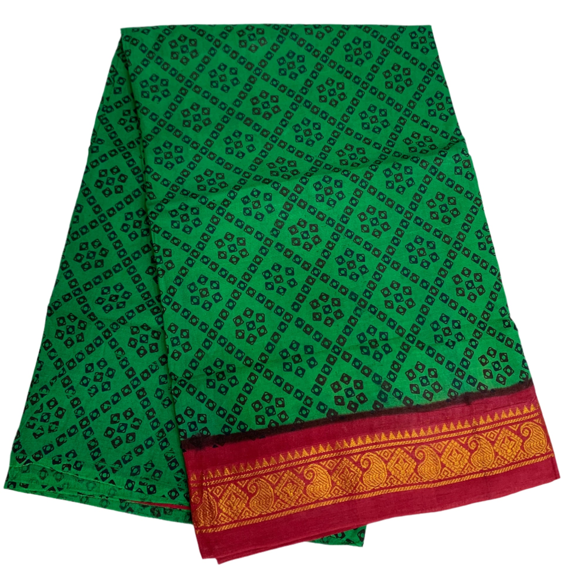 Chettinad Sungudi Cotton Light Green Colour with Red Colour Border . Light weight and easy to drape.