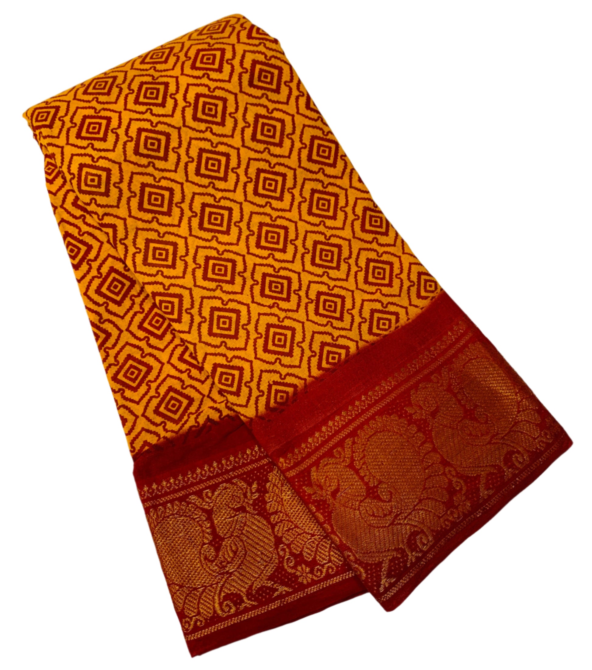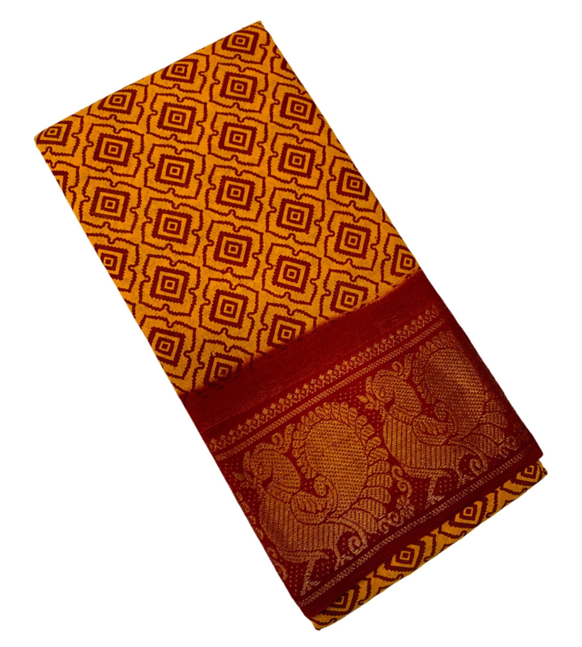 Chettinad Sungudi Cotton Mustard Colour with Maroon Colour Border.