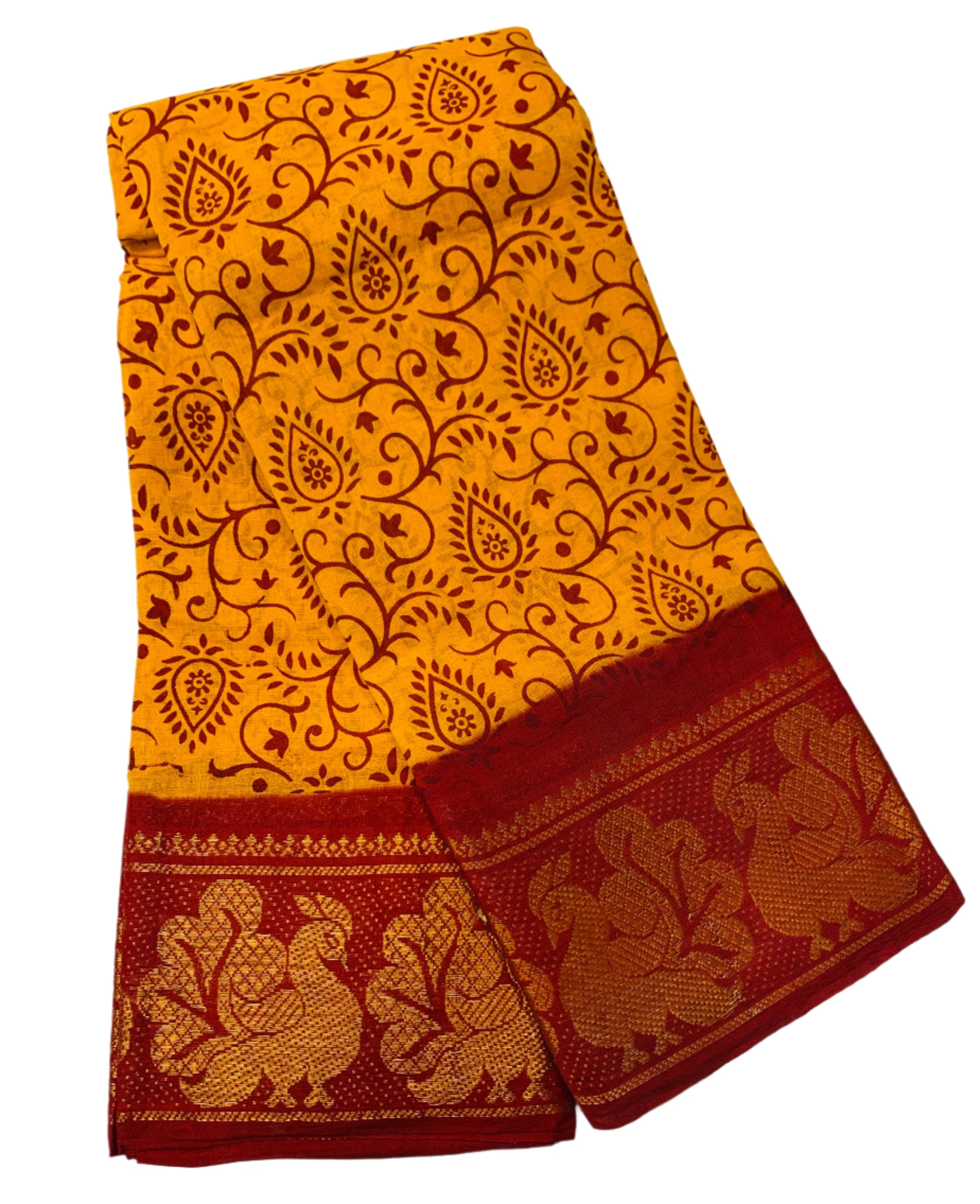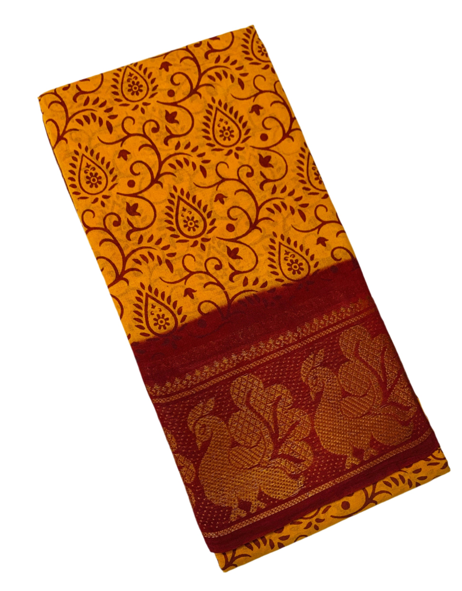 Chettinad Sungudi Cotton Mustard Colour with Maroon Colour Border.