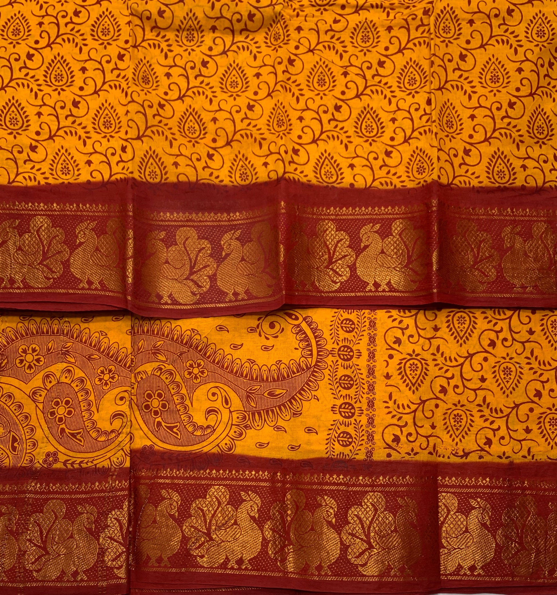 Chettinad Sungudi Cotton Mustard Colour with Maroon Border