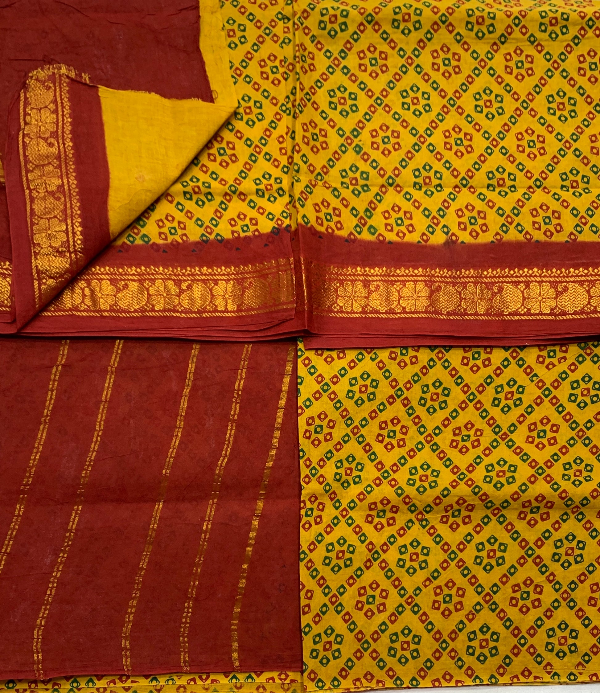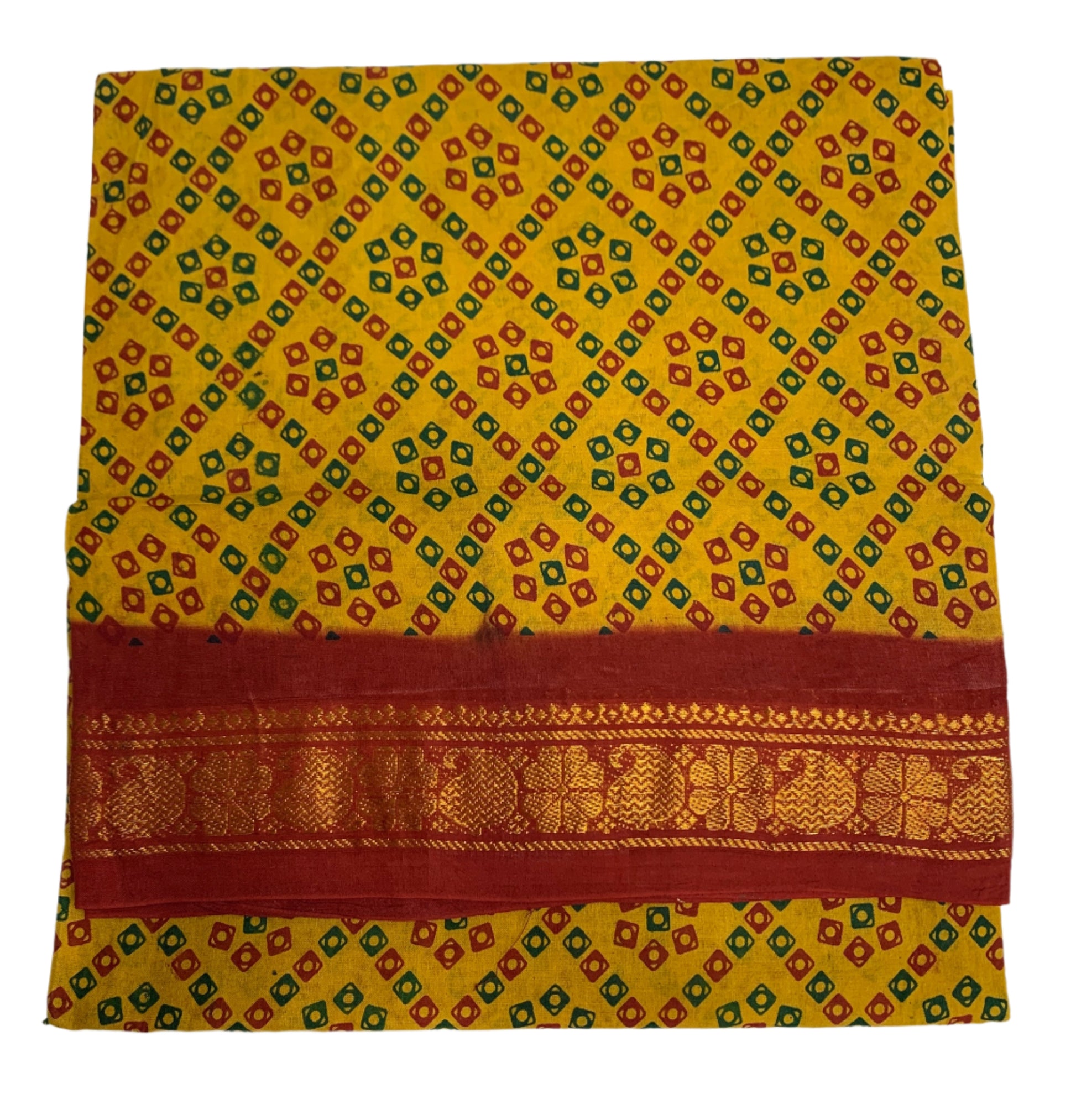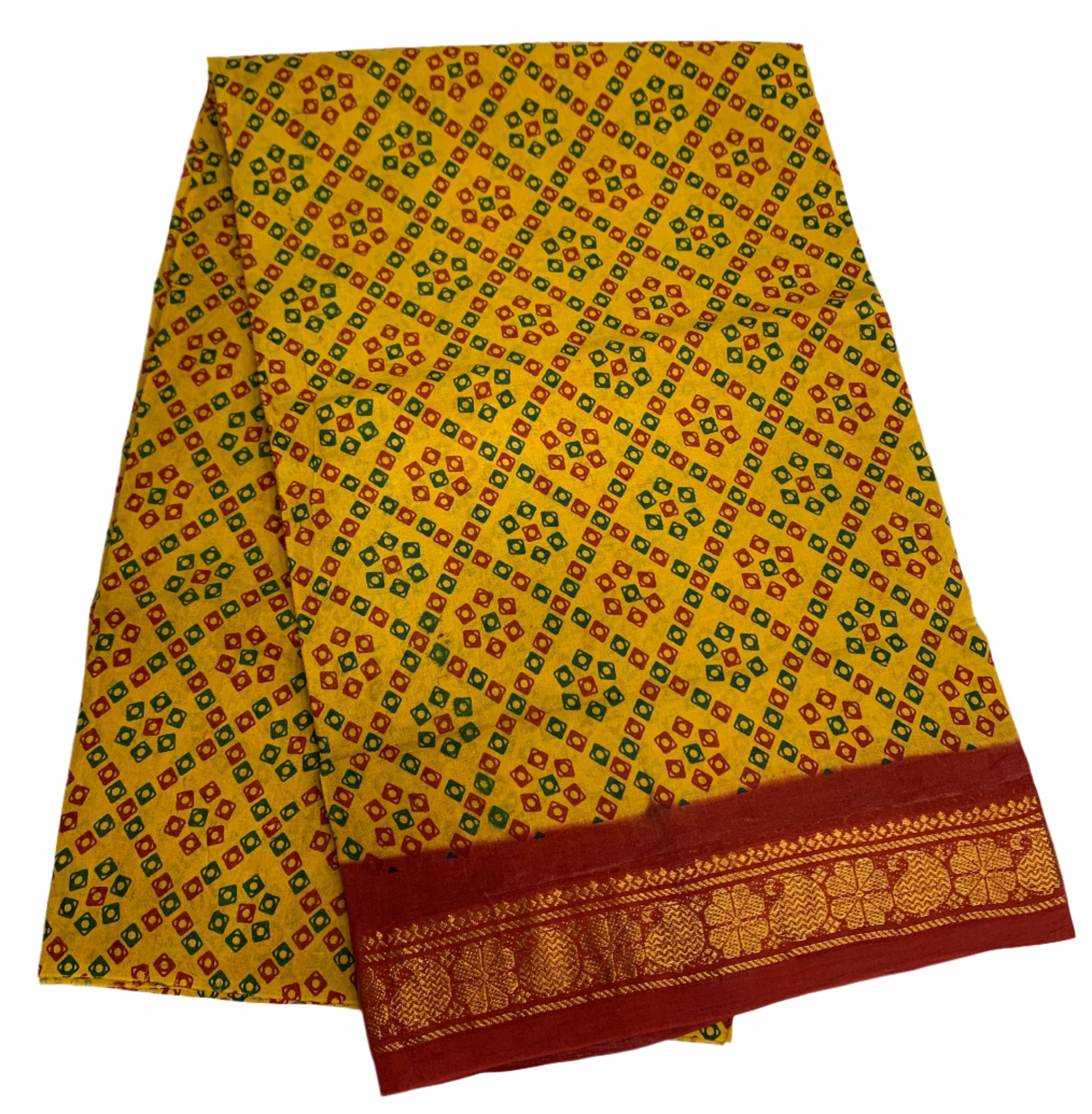Chettinad Sungudi Cotton Mustard Colour with Red Colour Border . Light weight and easy to drape.
