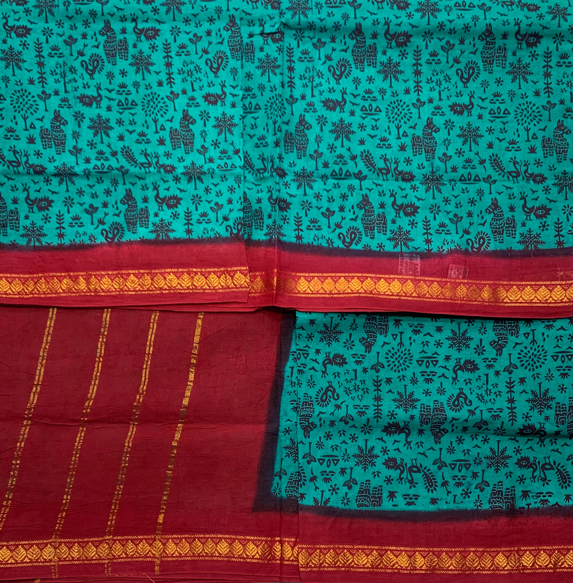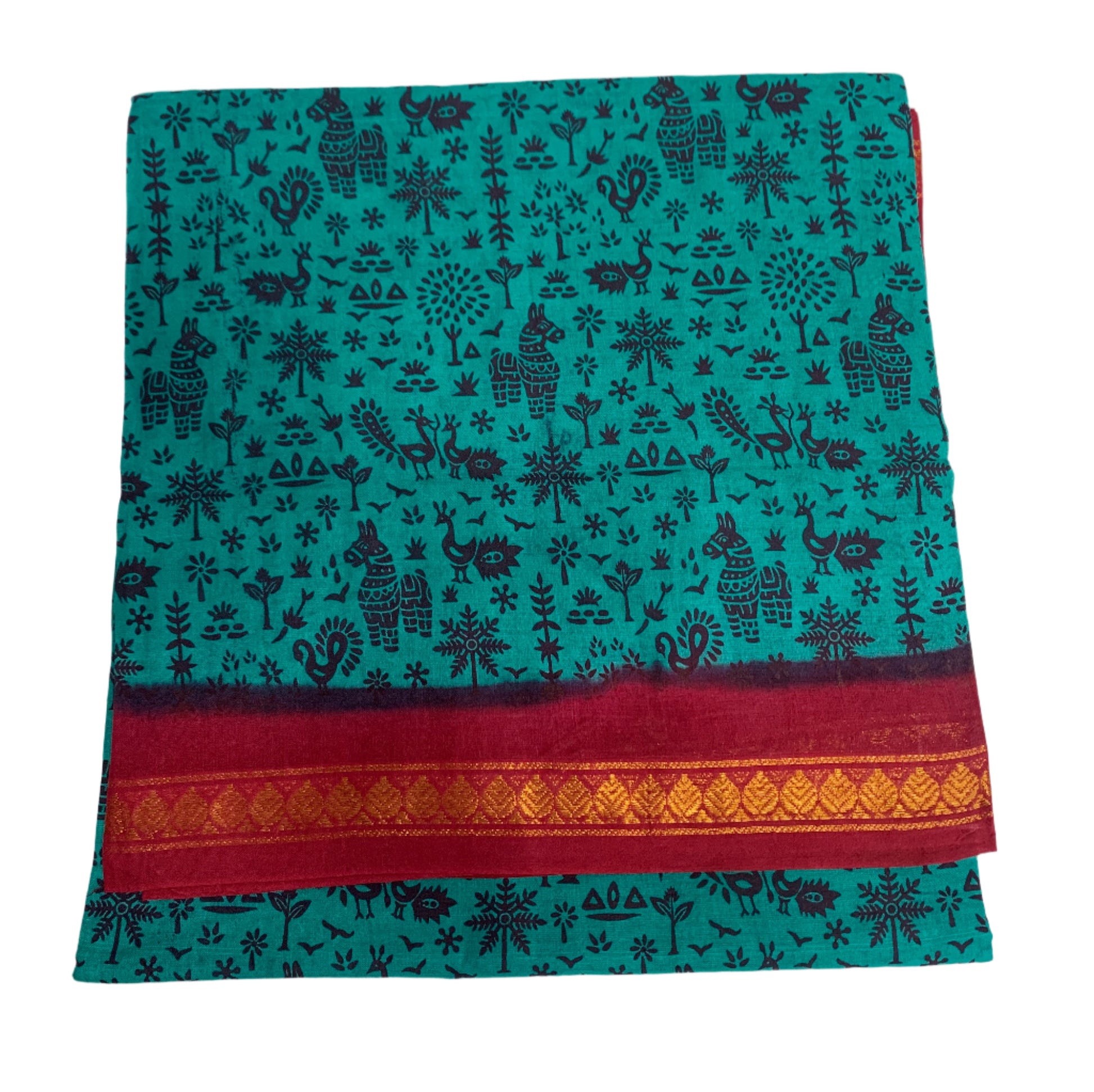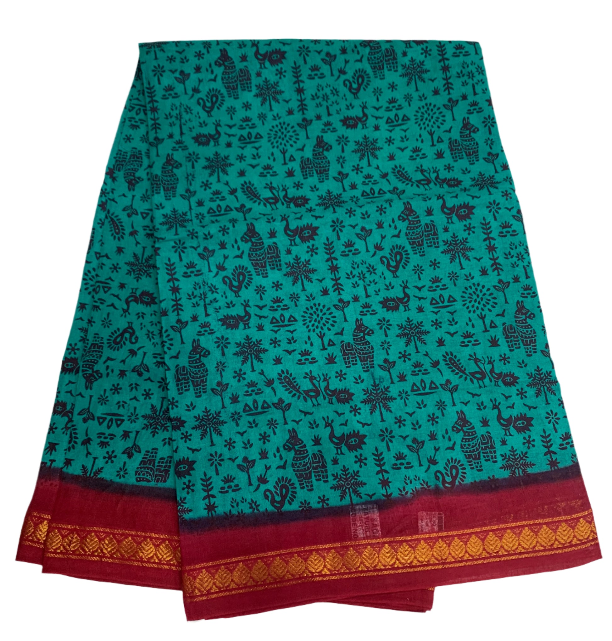 Chettinad Sungudi Cotton Rama Green Colour with Maroon Colour Border . Light weight and easy to drape.