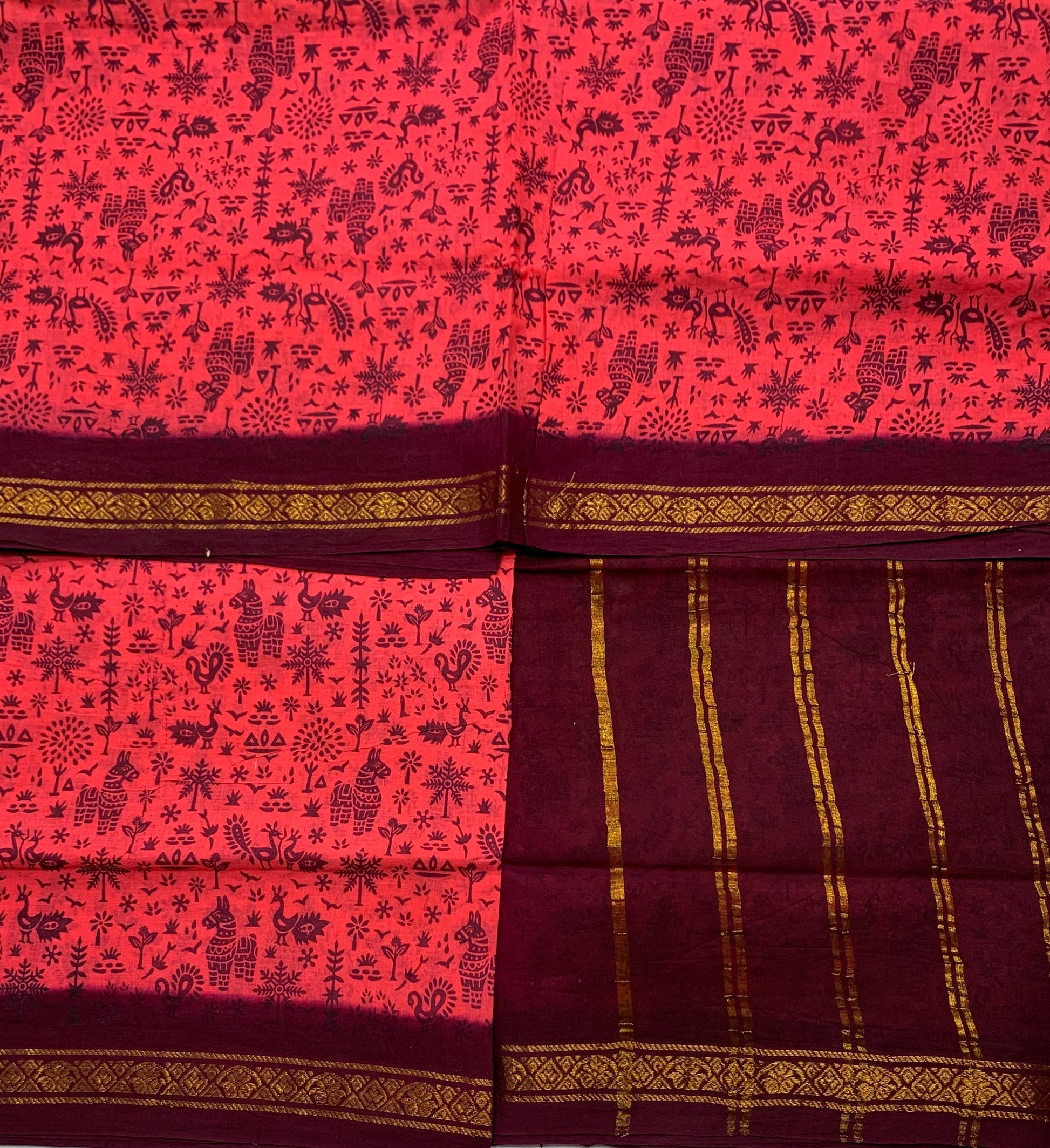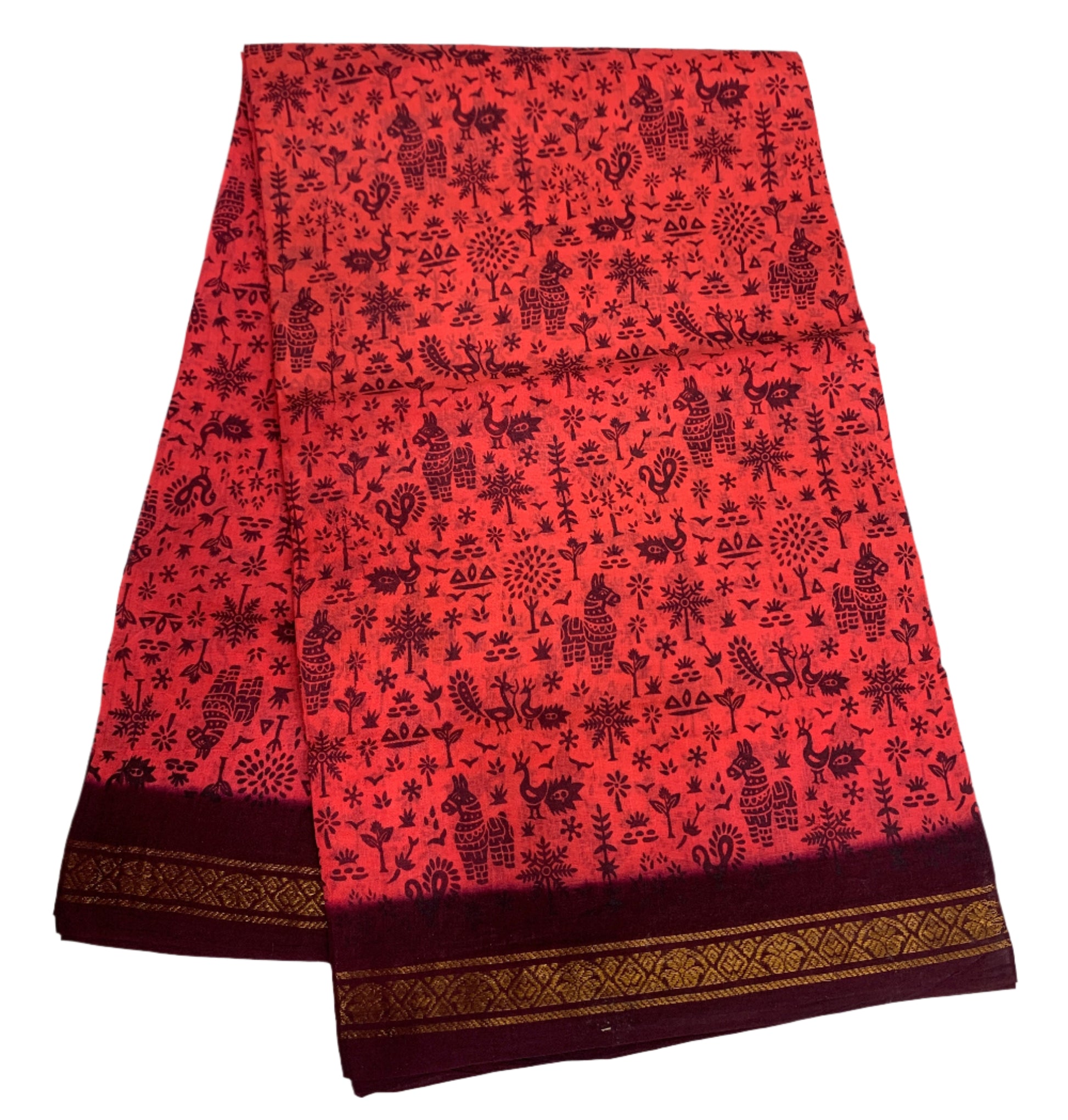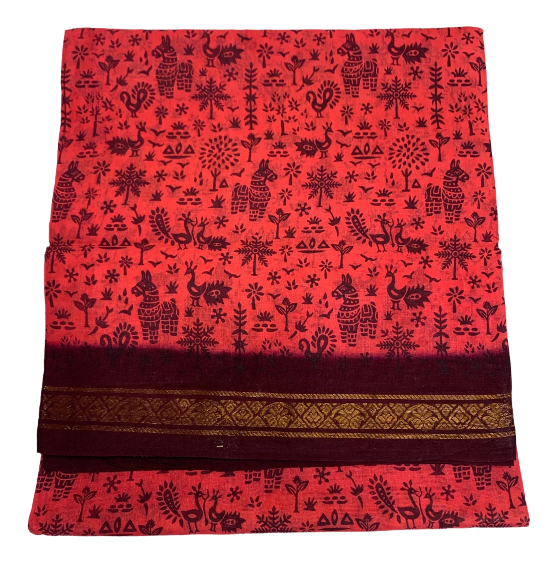 Chettinad Sungudi Cotton Tomato Red Colour with Brown Border