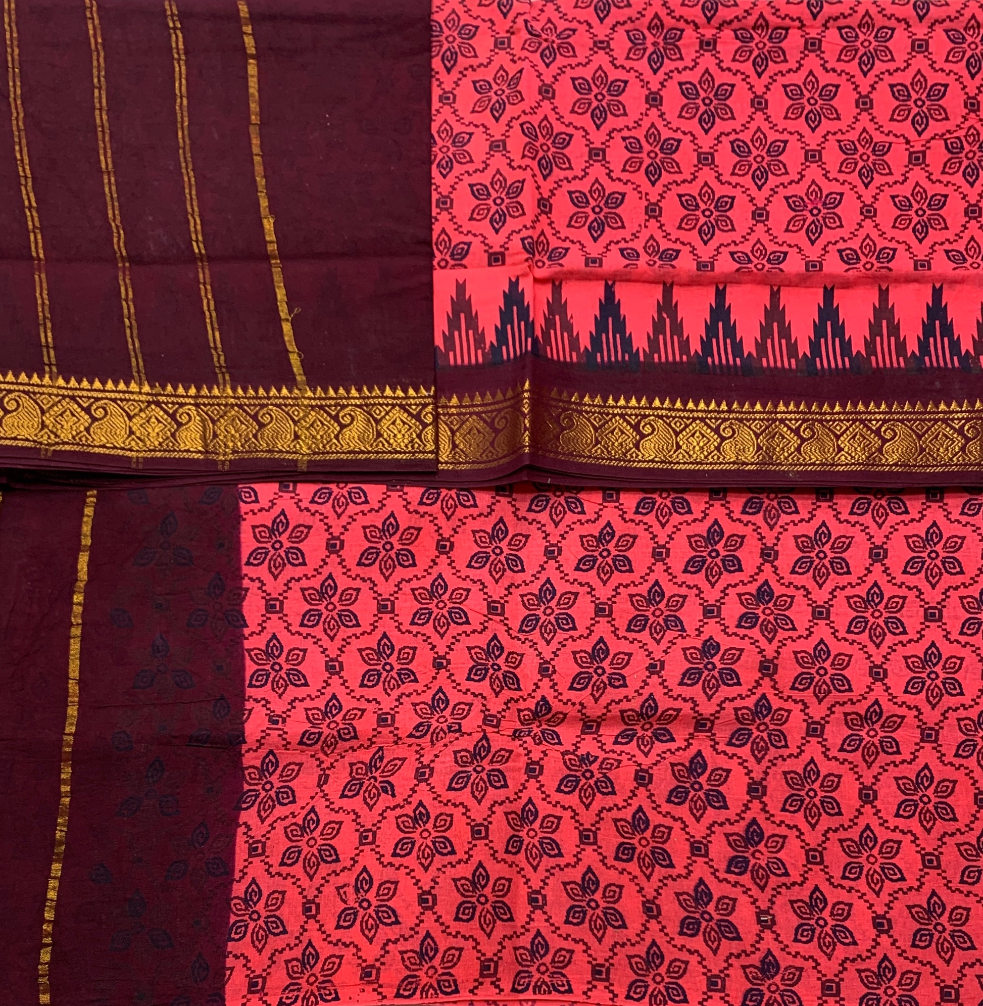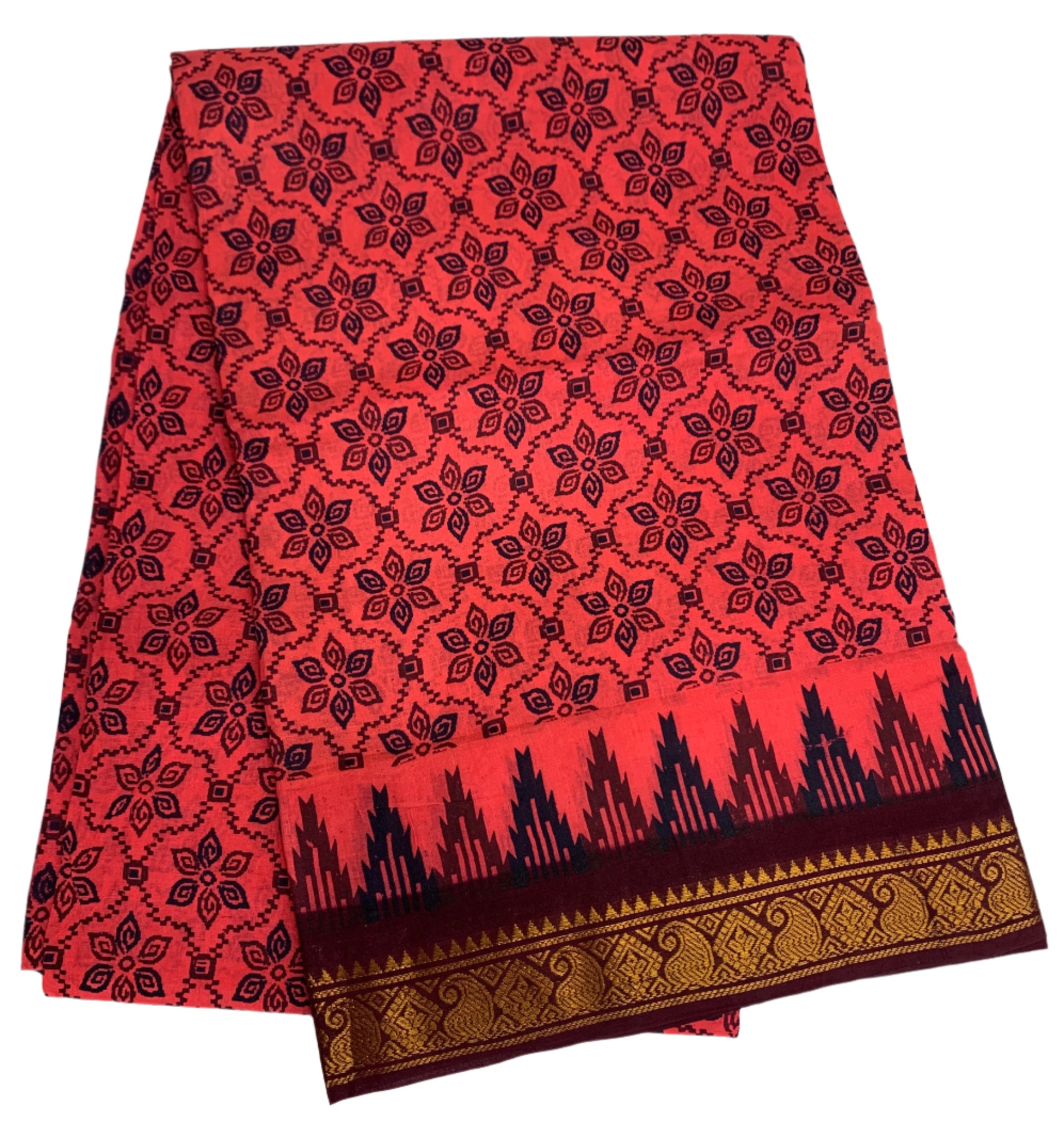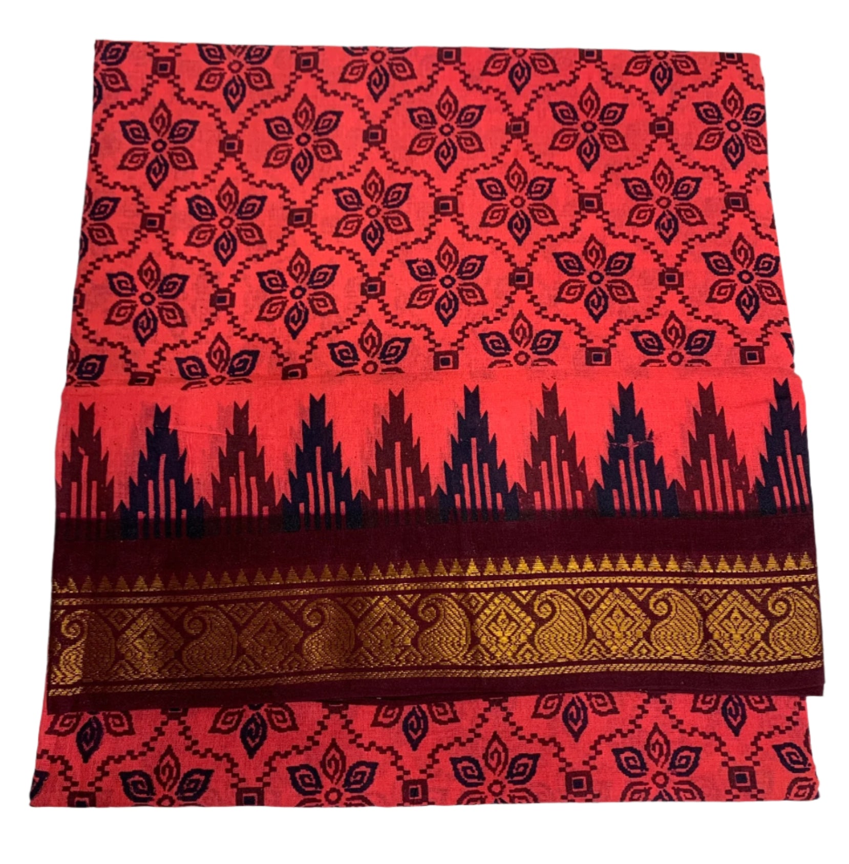 Chettinad Sungudi Cotton Tomato Red Colour with Brown Border