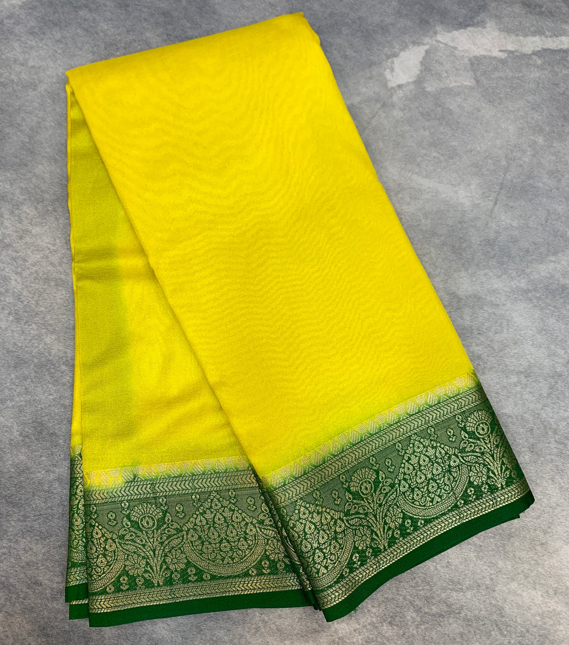 Crepe Saree Lemon Yellow Colour with Green Border.