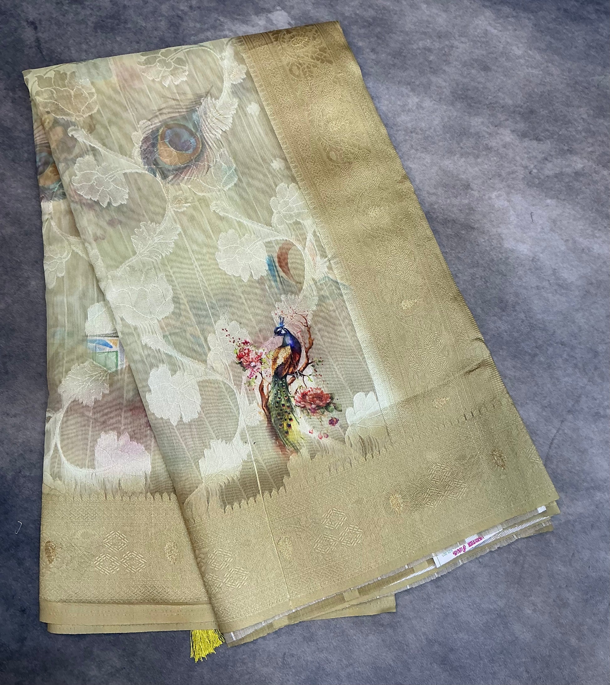 Digital Print Cotton Saree Olive Green Colour with Floral and Birds Pattern