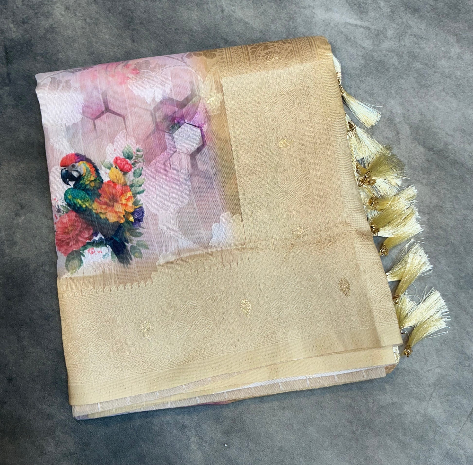 Digital Print Cotton Saree Sandal Colour with Floral and Birds Pattern