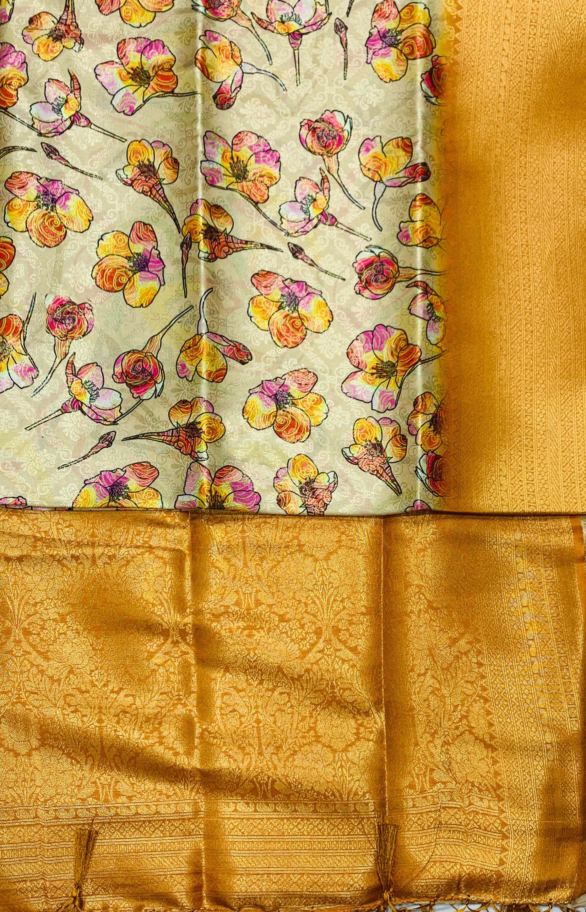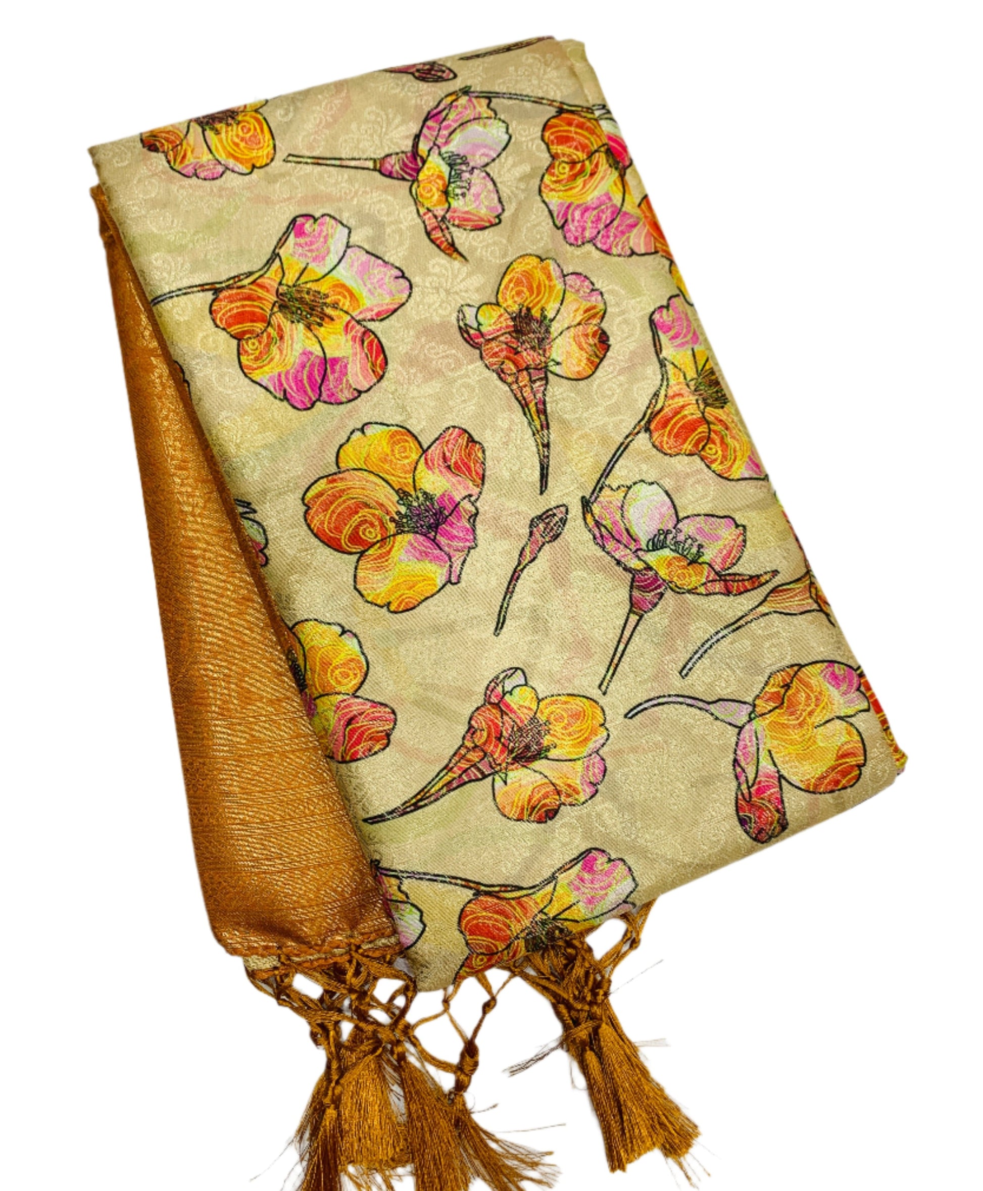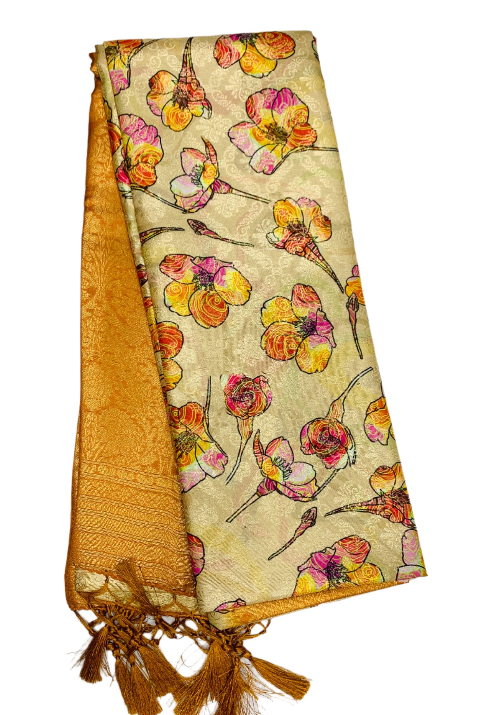 Digital Print Silk Saree Golden Yellow Colour with Floral Pattern