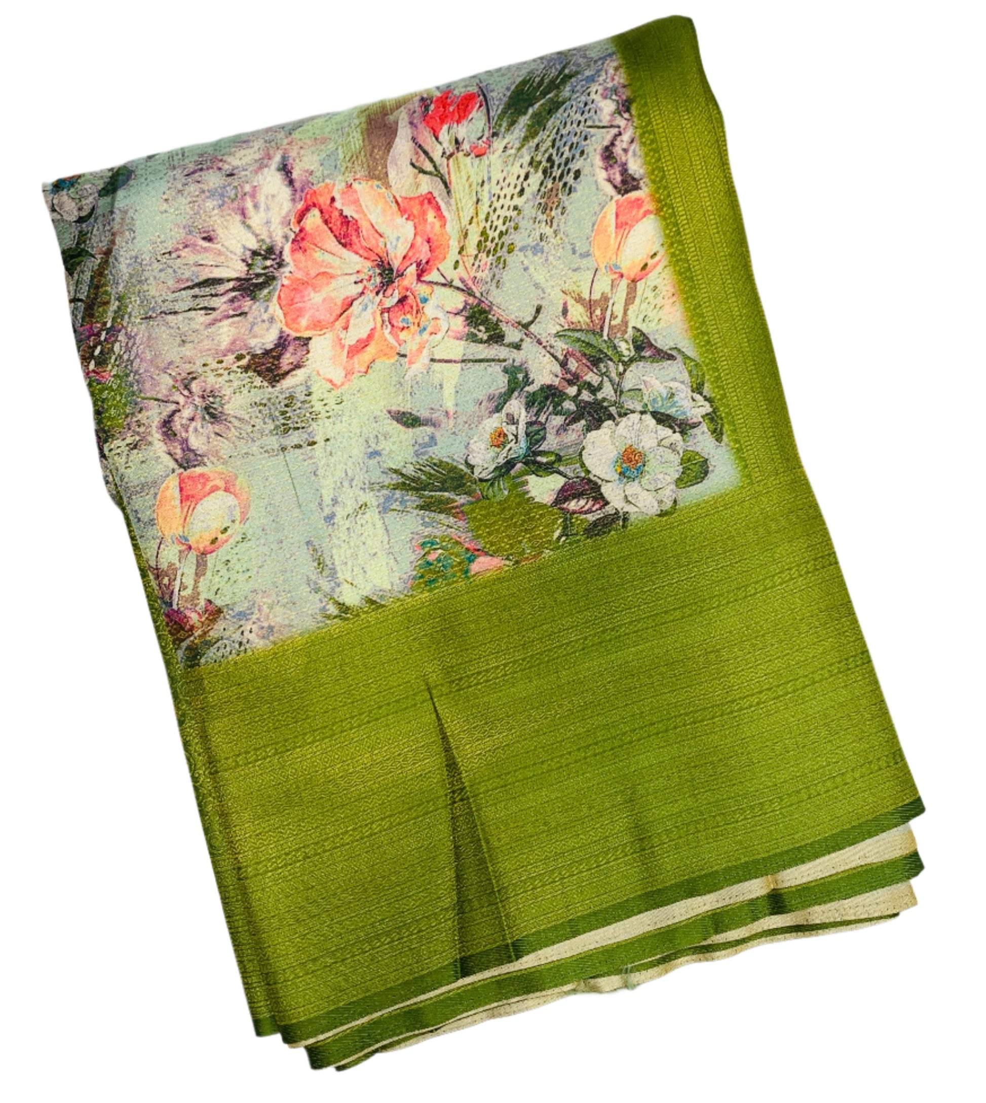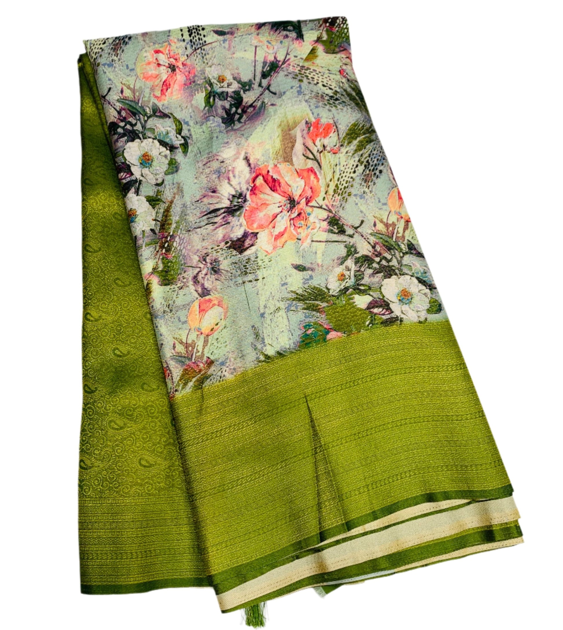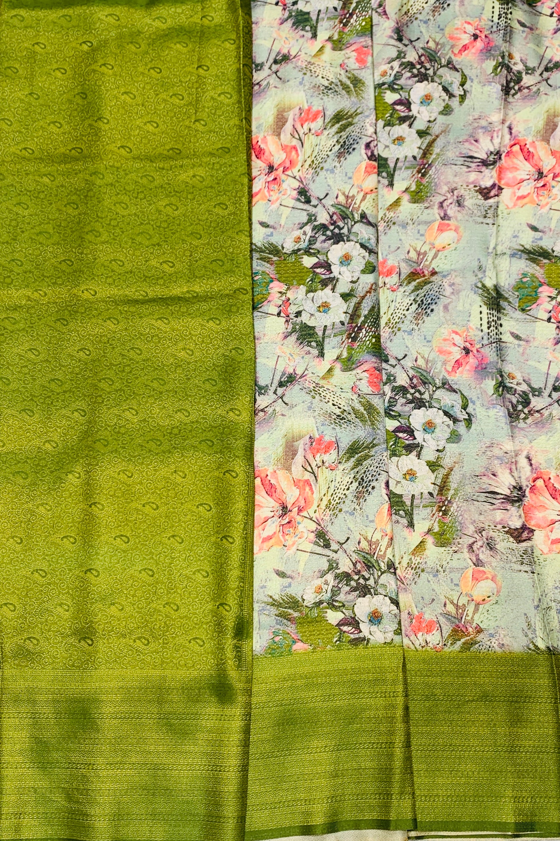Digital Print Silk Saree Olive Green Colour with Floral Pattern