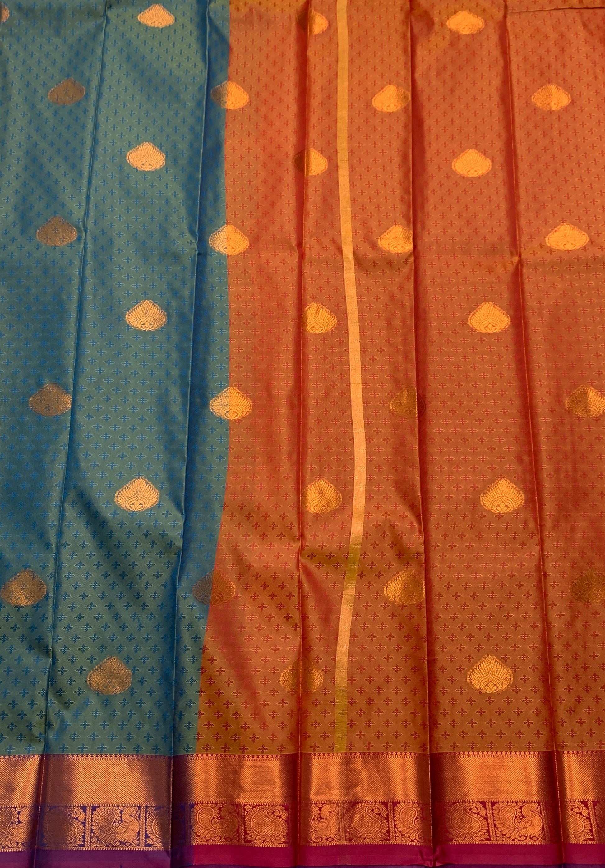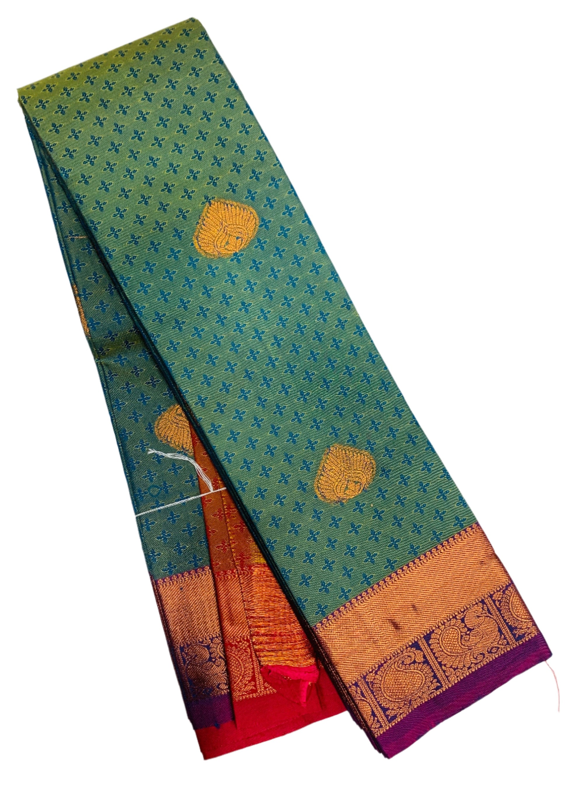 Dual Colour silk cotton with Copper Zari Border and Birds, Mango Design . Light weight and easy to drape.