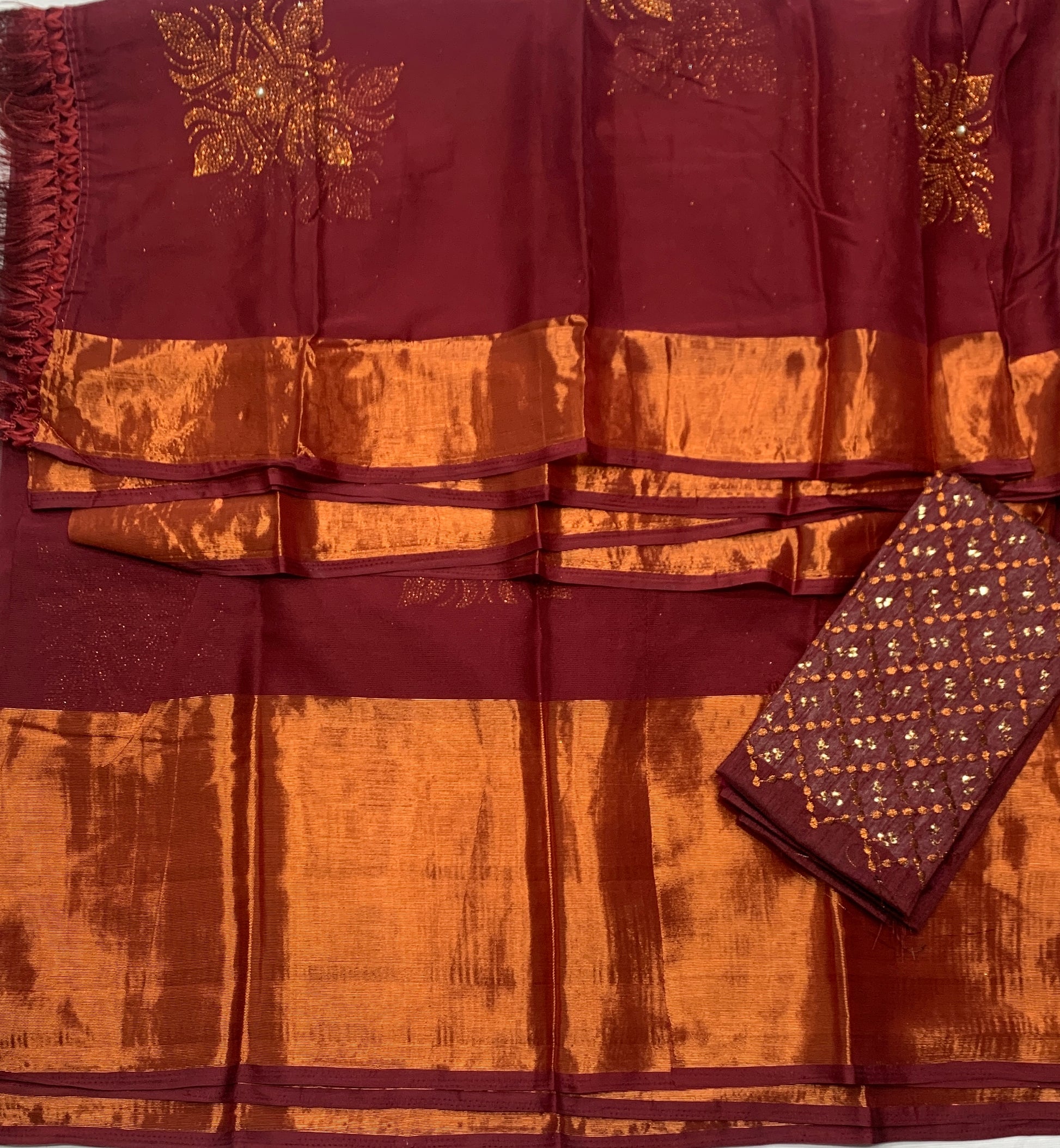 Easy to drape Maroon Saree with Copper border. Light weight and easy to care.
