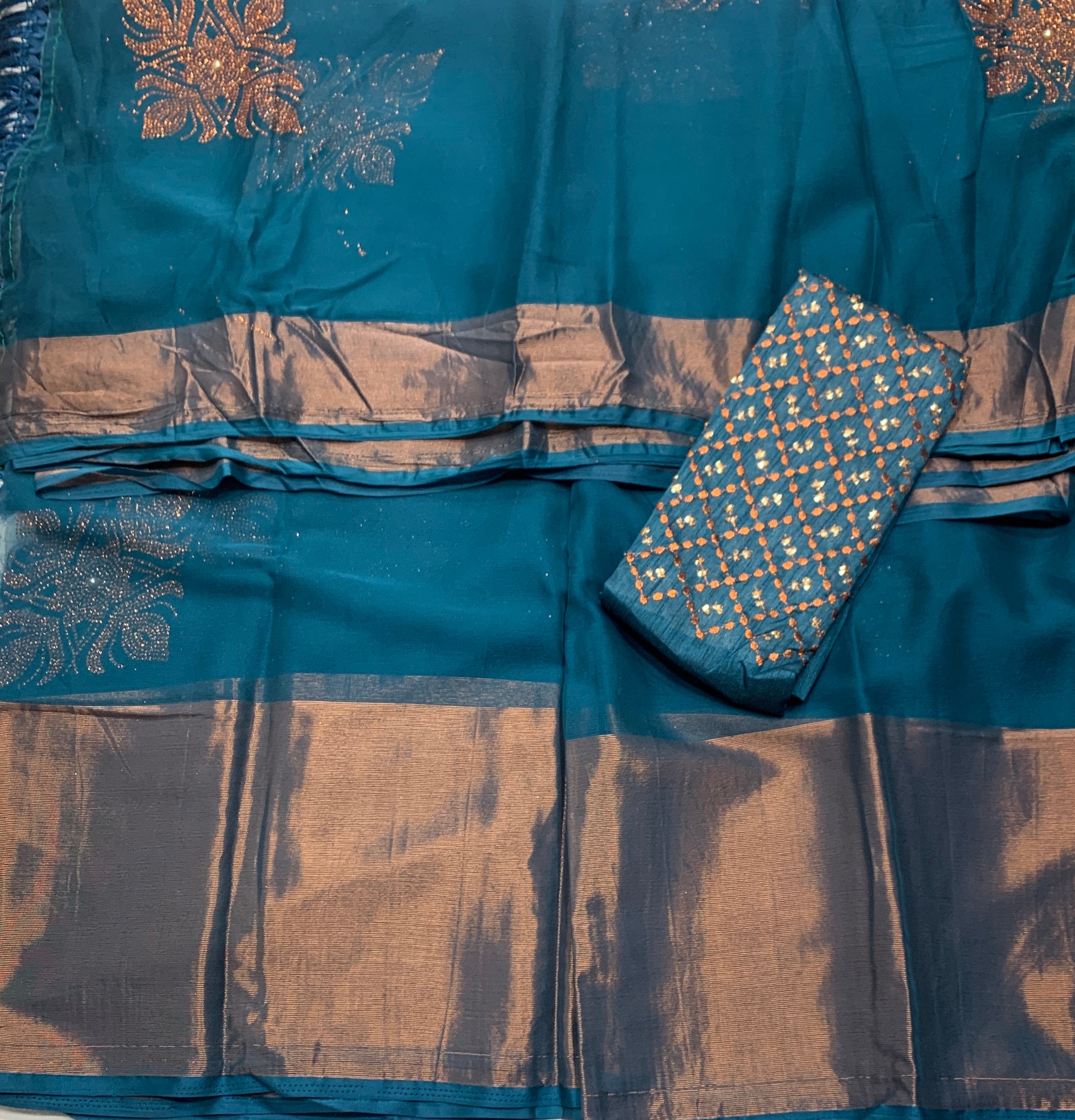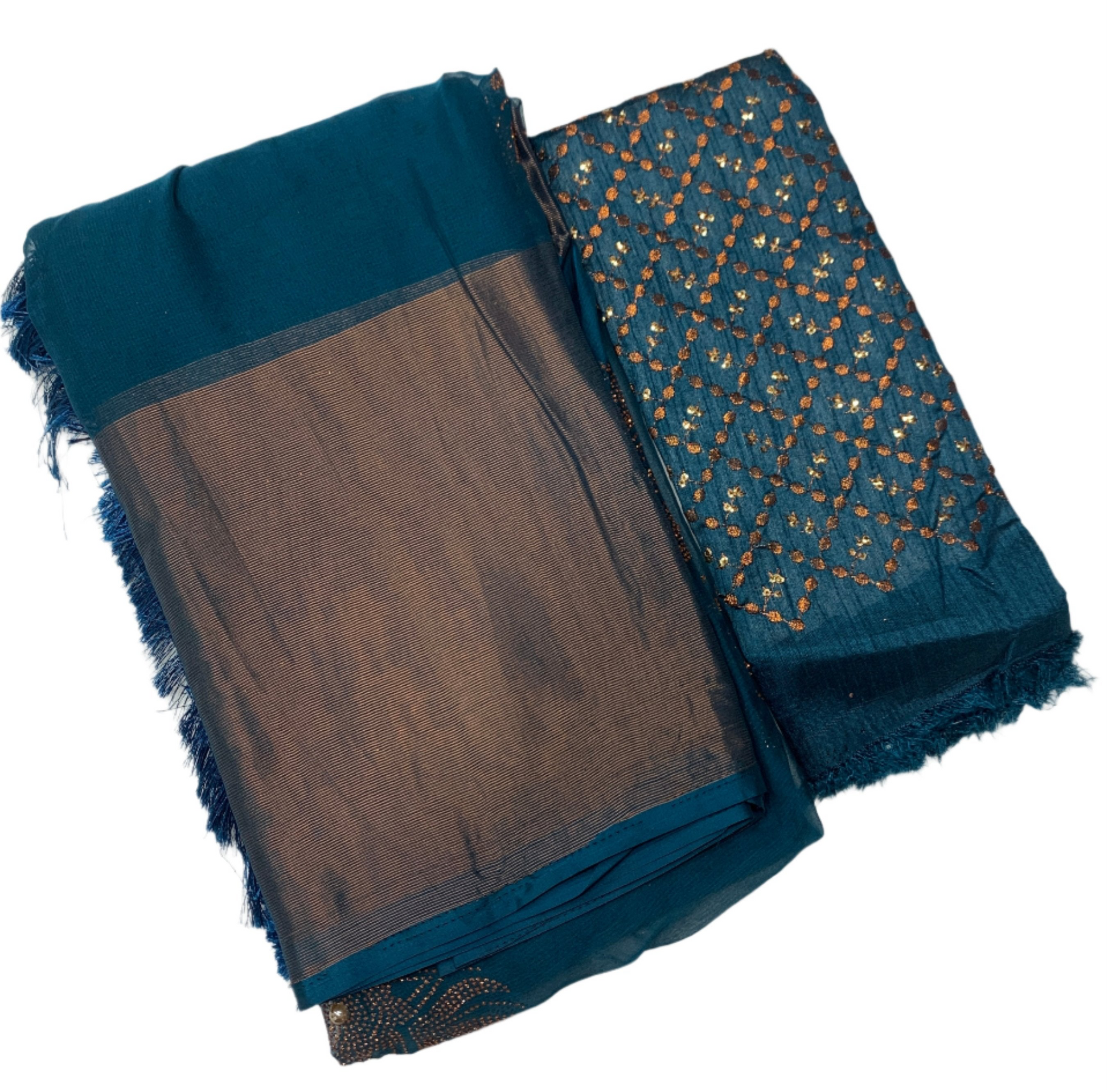 Embroidery Work Saree Peacock Blue Colour with Copper border