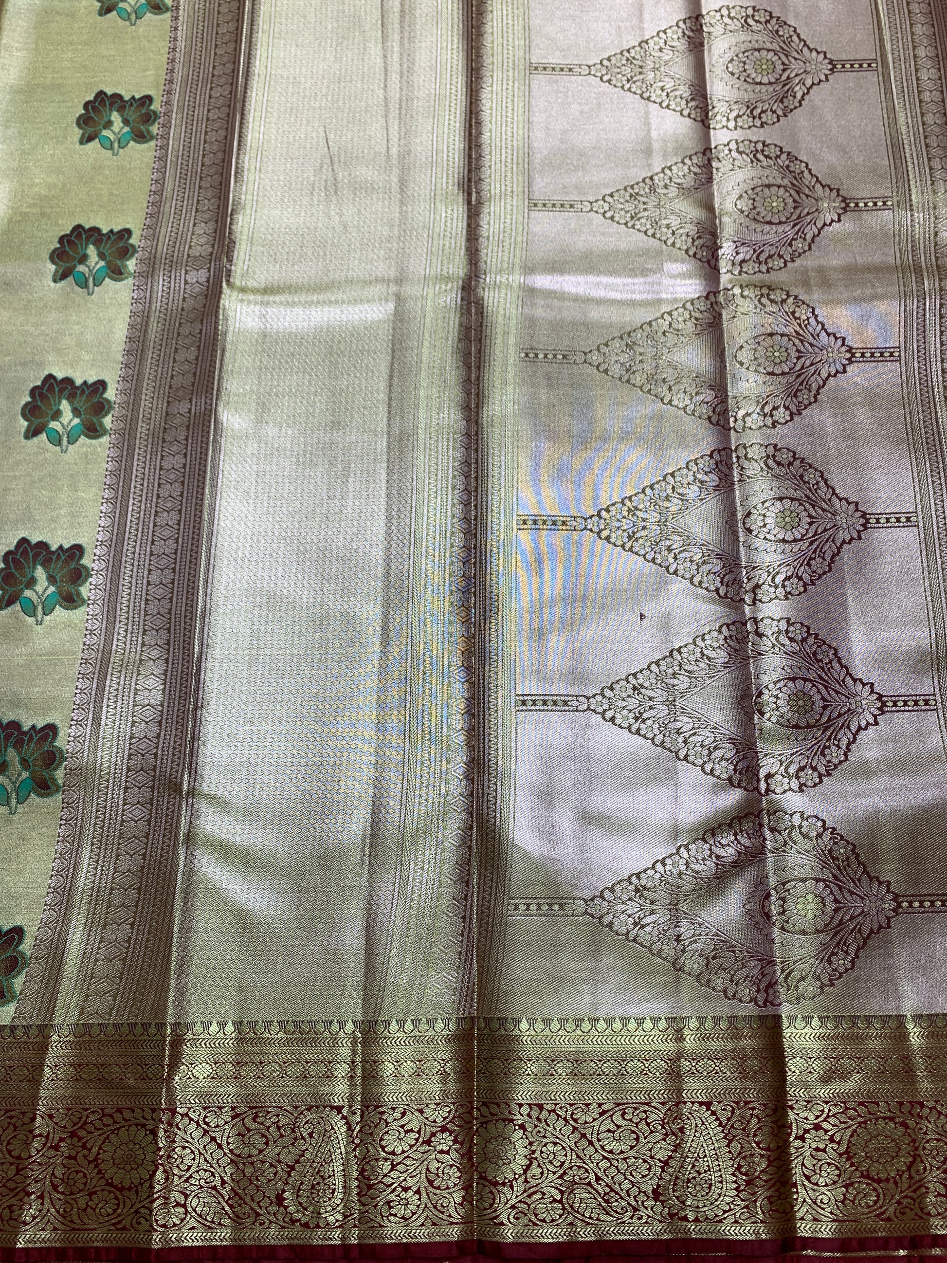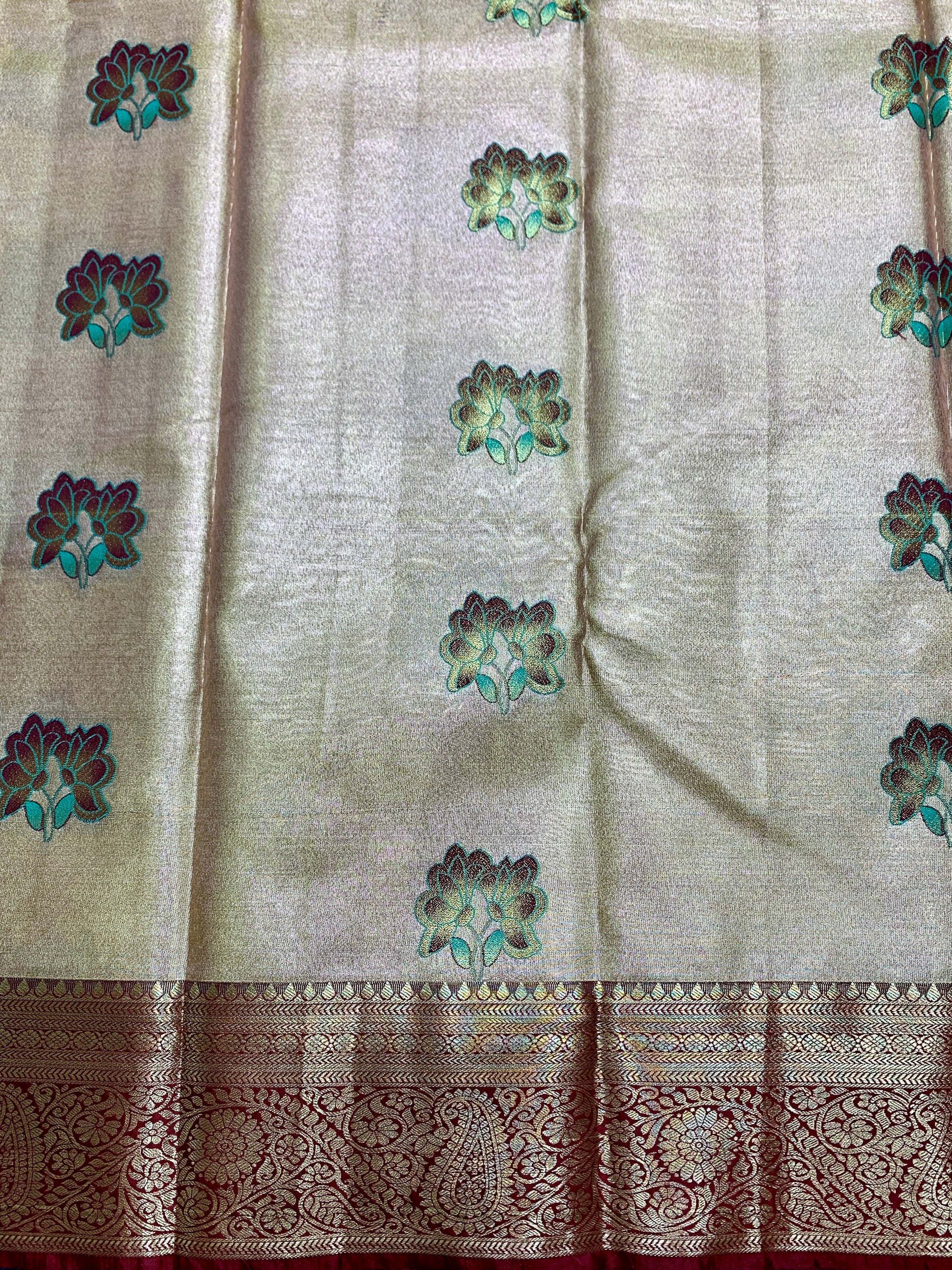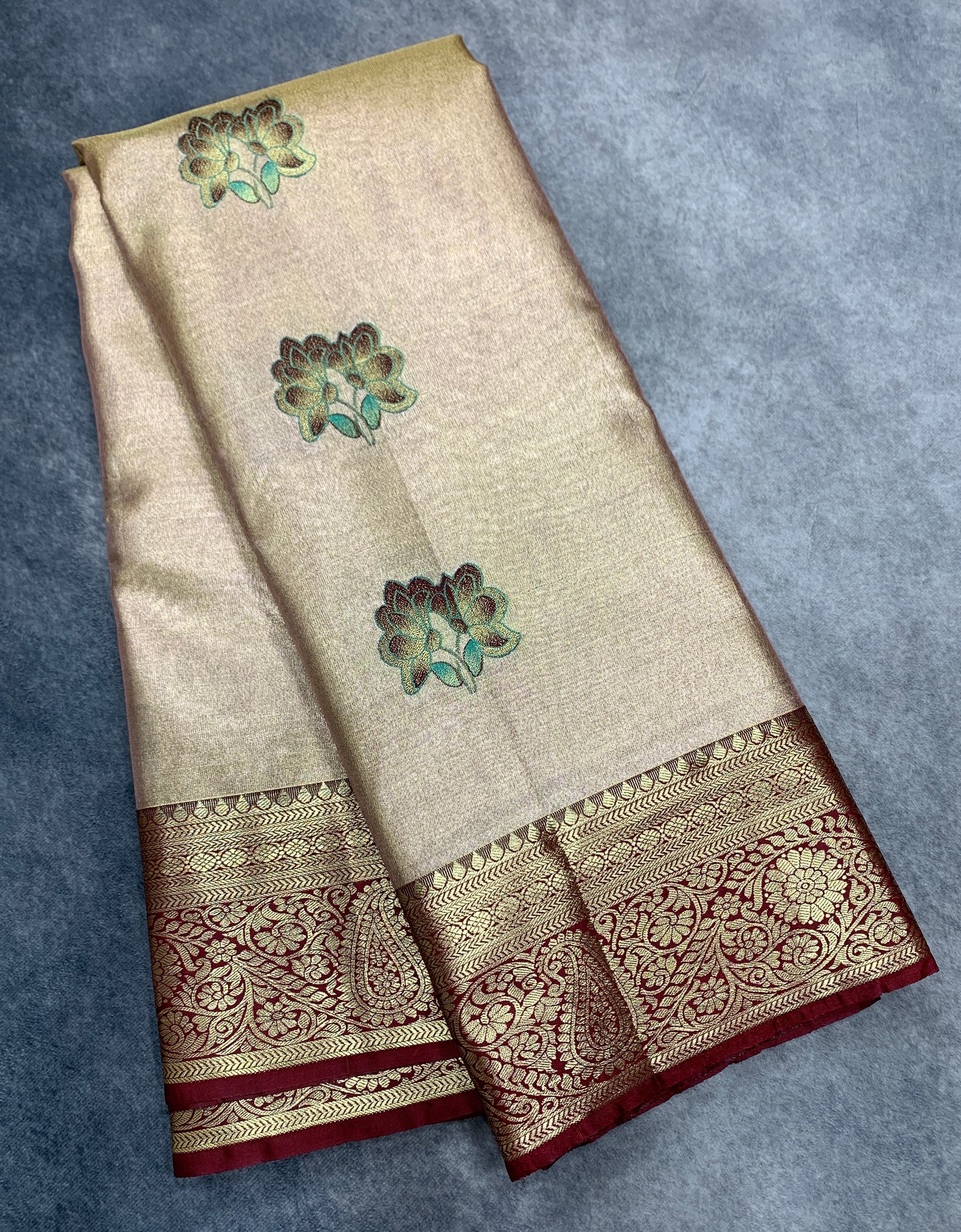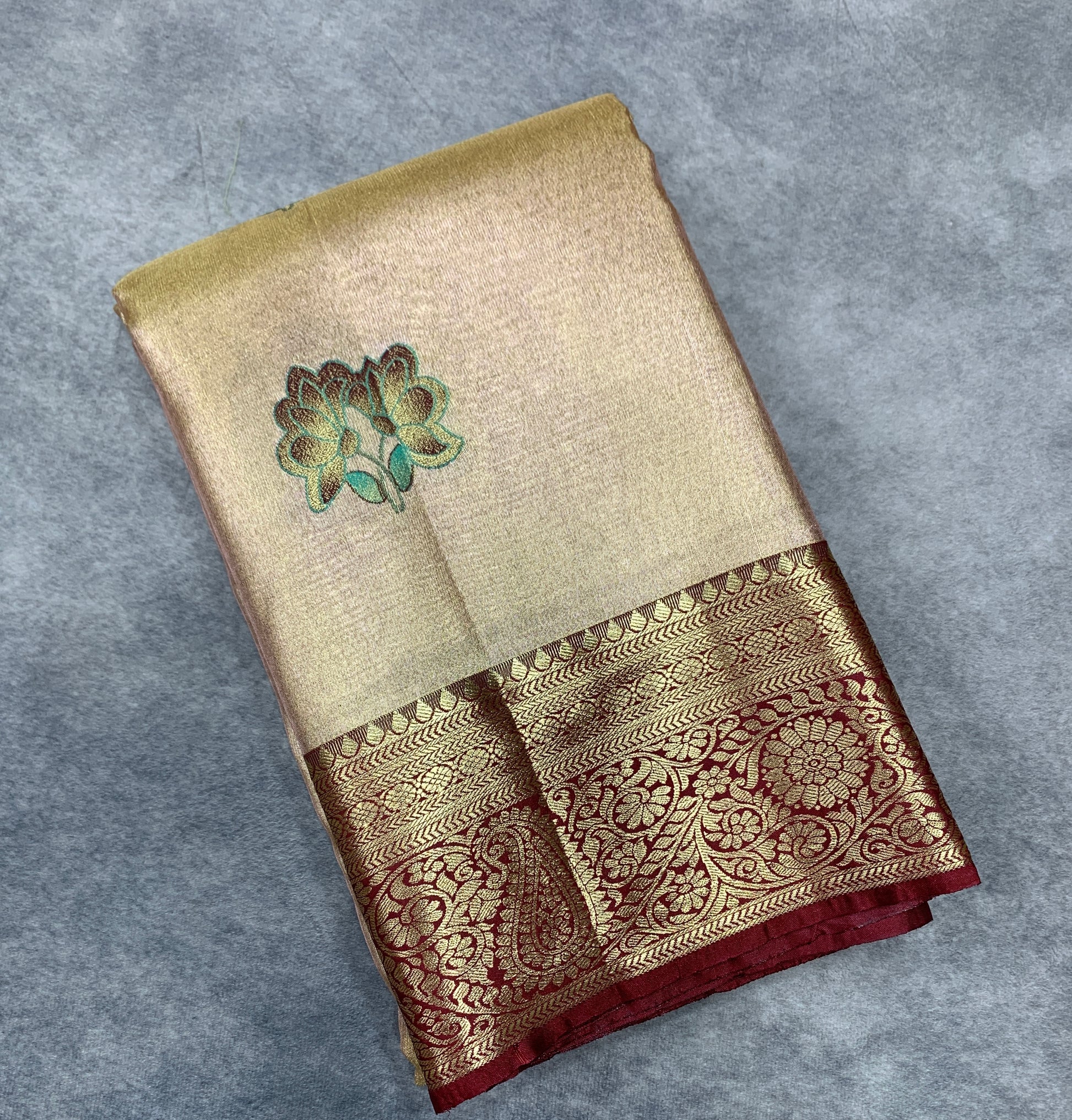 Fancy Tissue Saree Golden Colour with Maroon Border