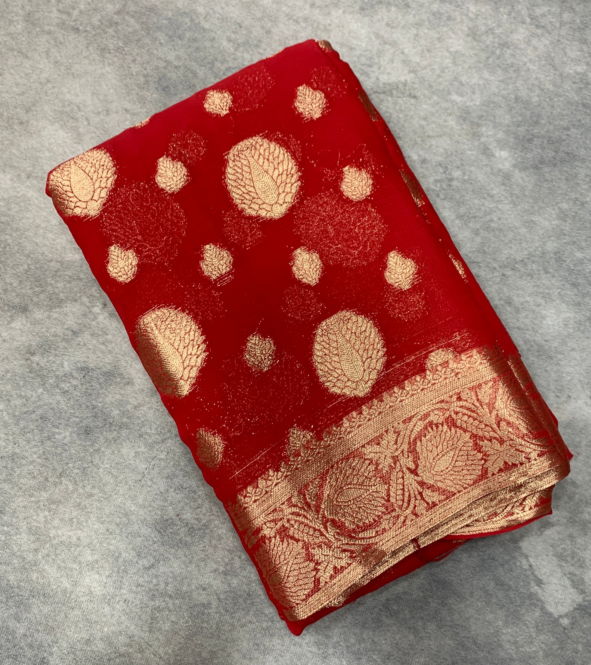 Georgette Saree Red Colour with Sliver Floral Design Border