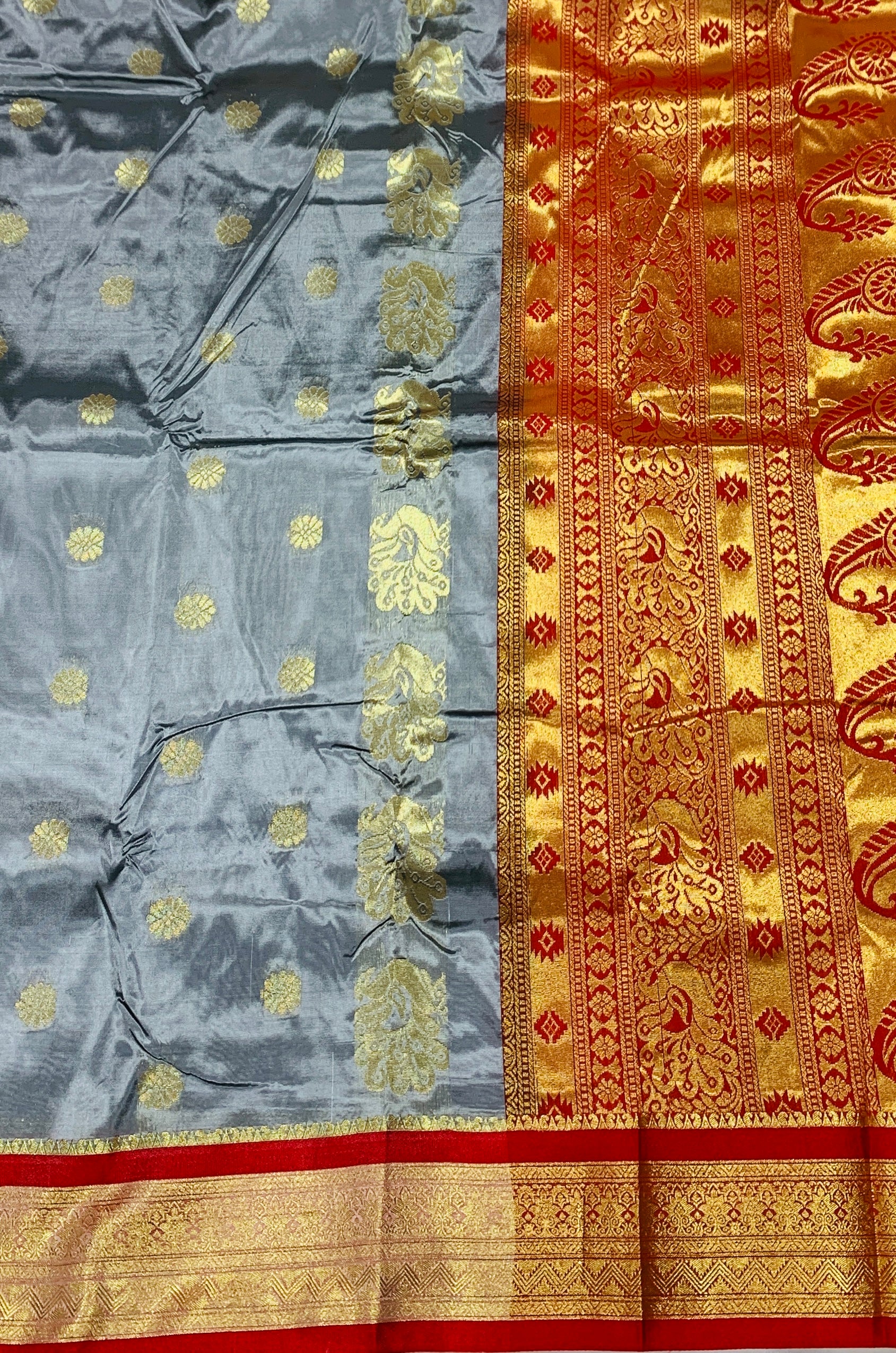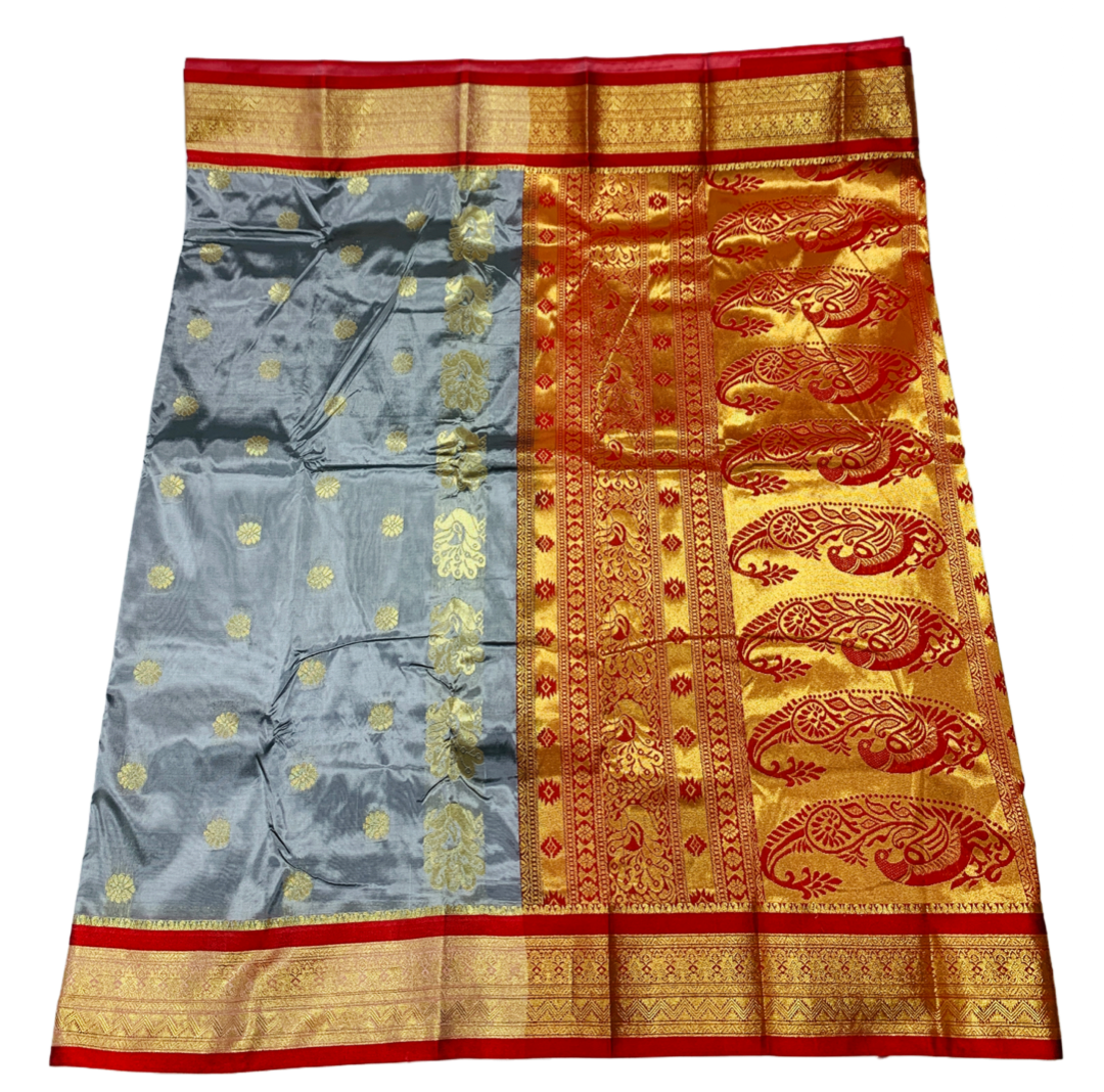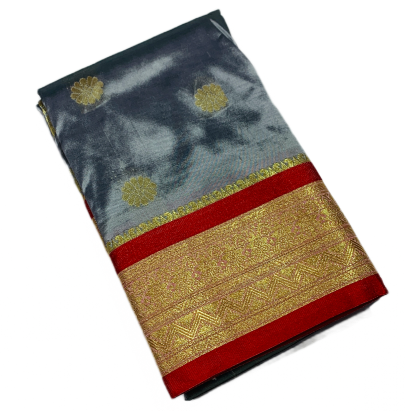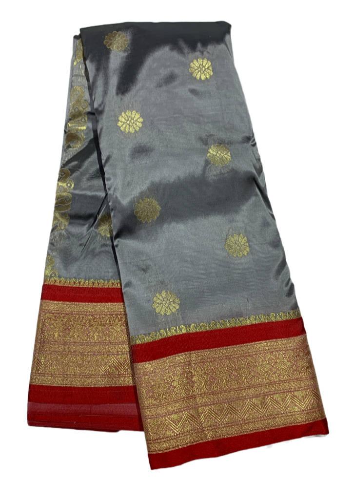 Gray shade saree with Golden and Red Border.Light weight & easy to wash.