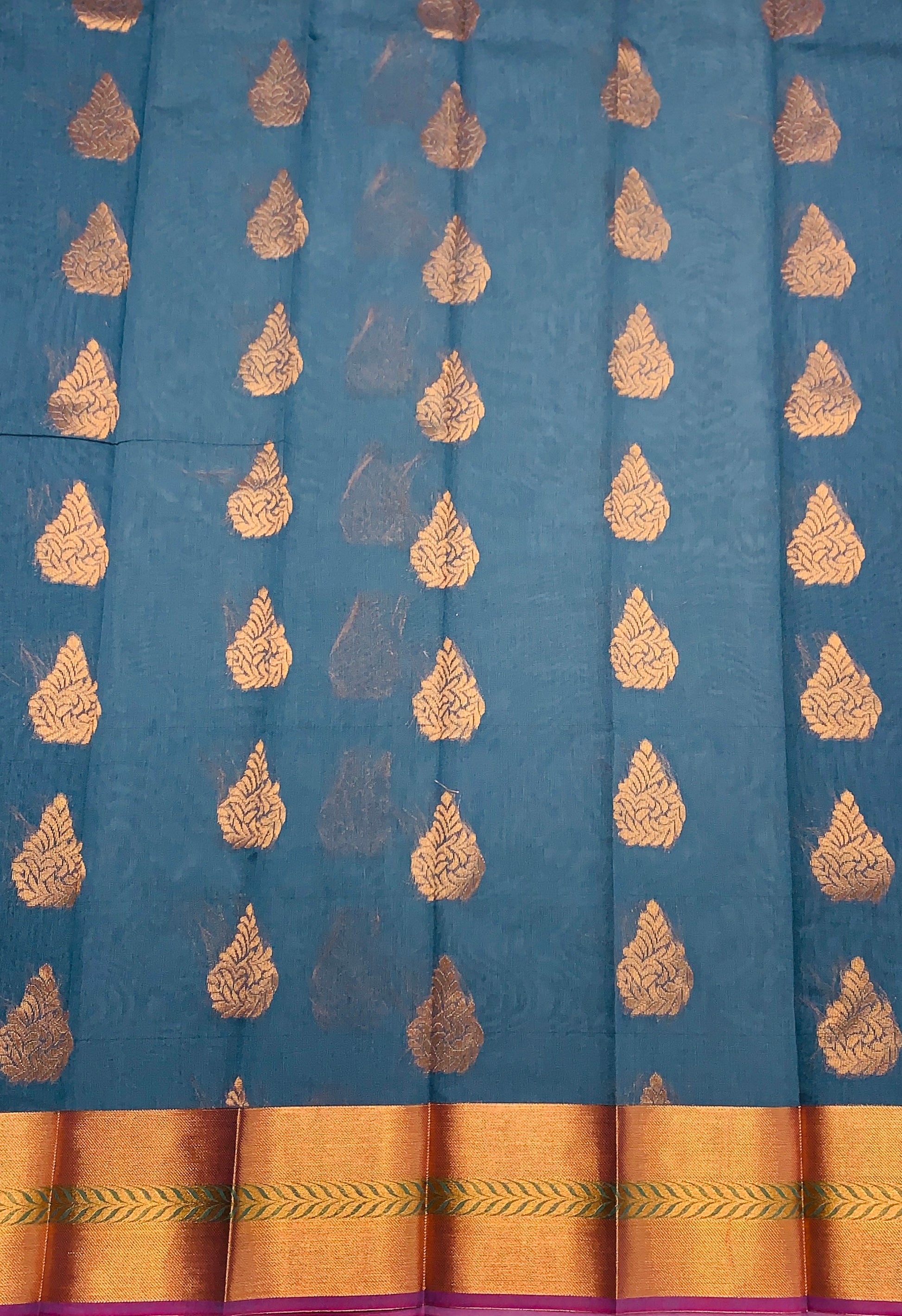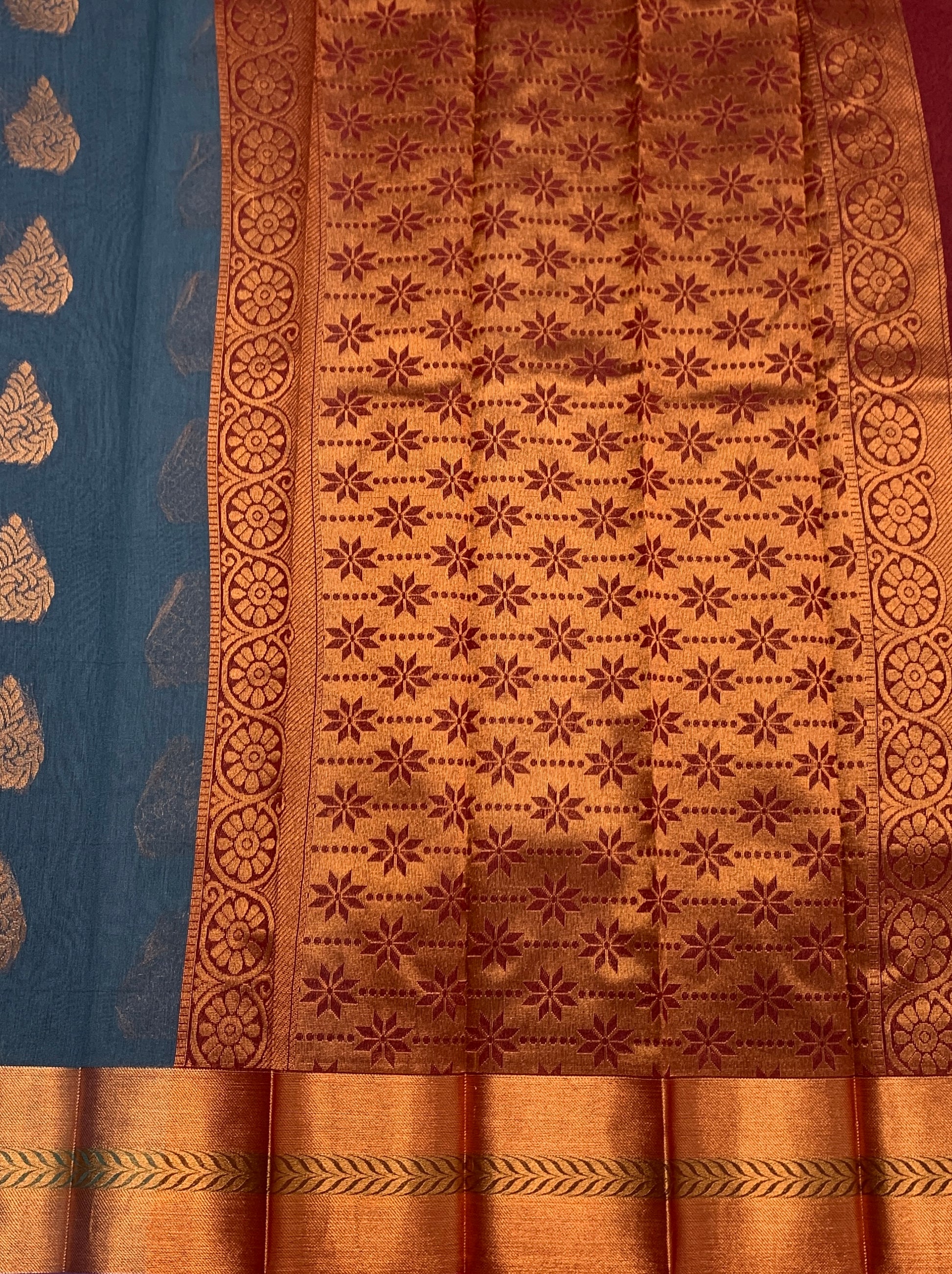 Gray shade silk cotton with Copper Zari Border . Light weight and easy to drape.