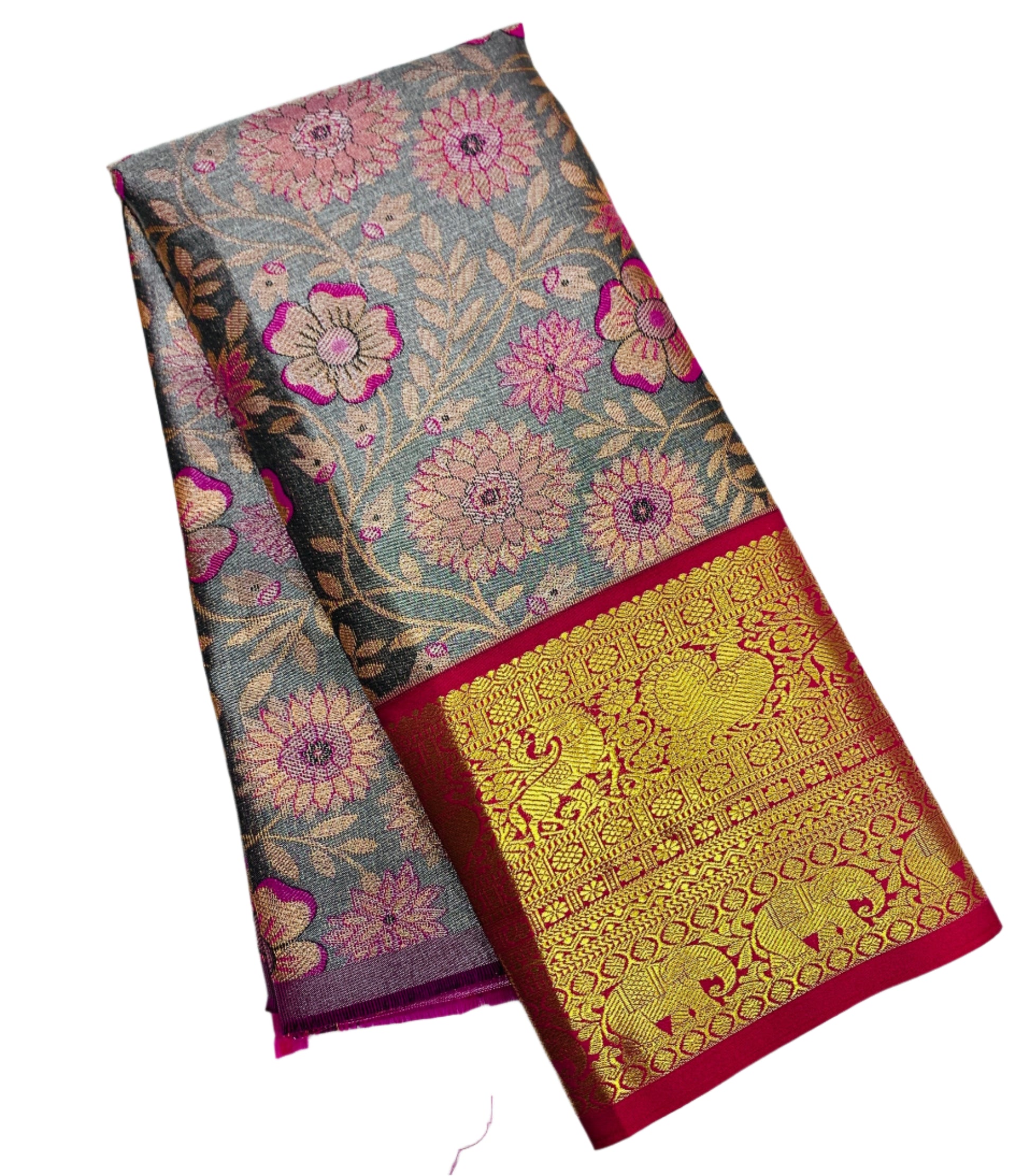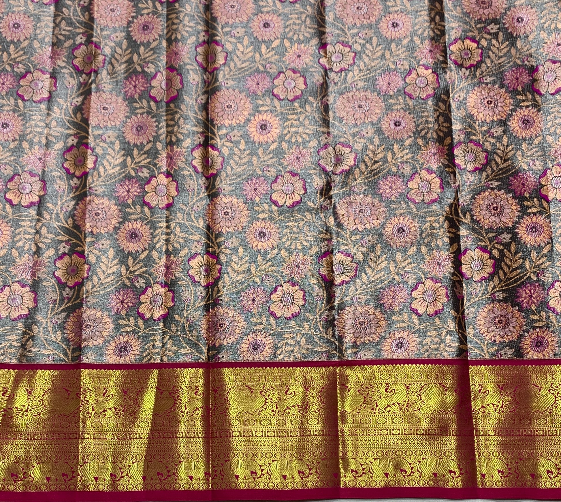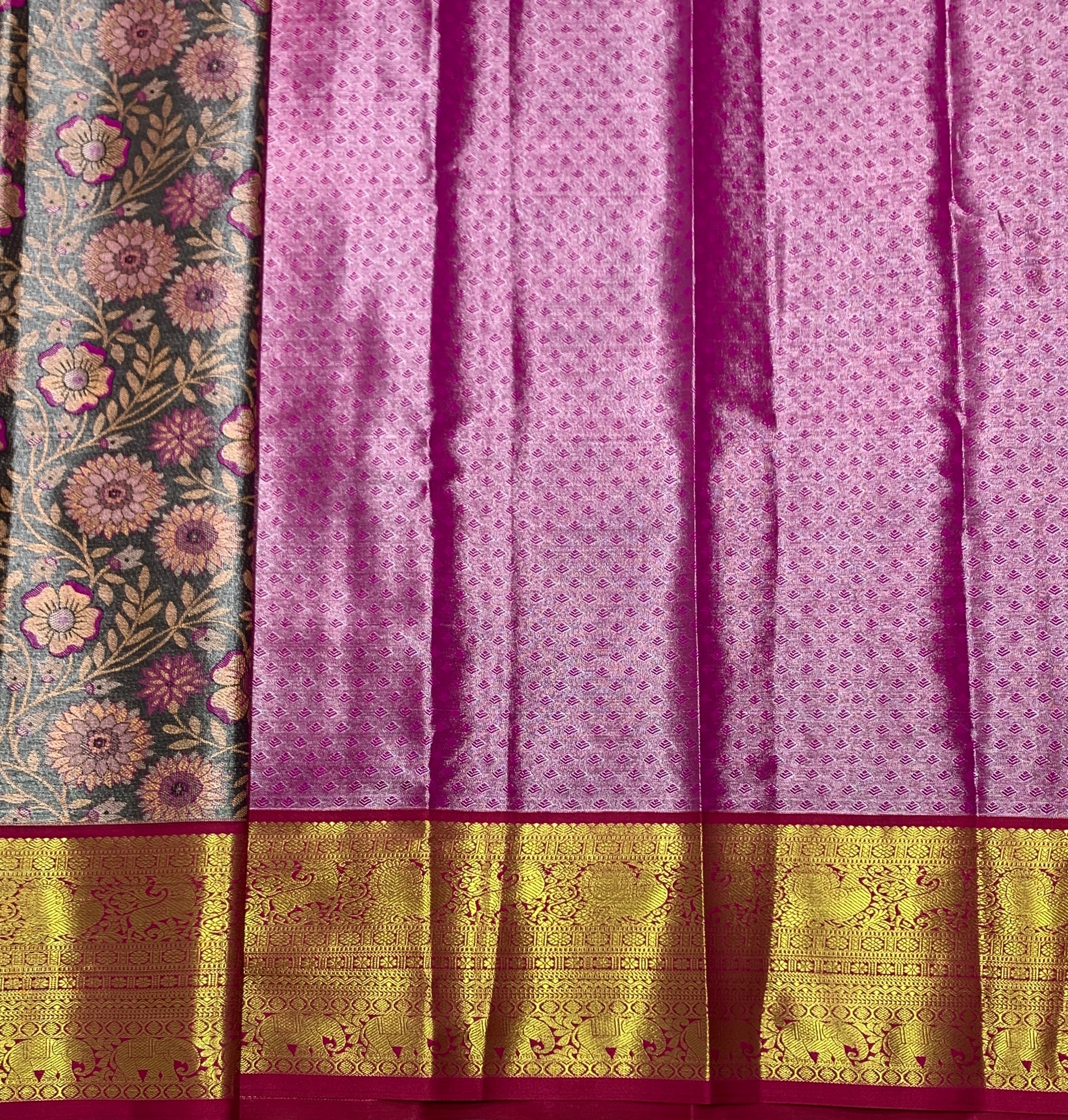 Gray shade with Contrast border Vegan silk unstitched Pattu Pavadai material for kids age 2 to 5
