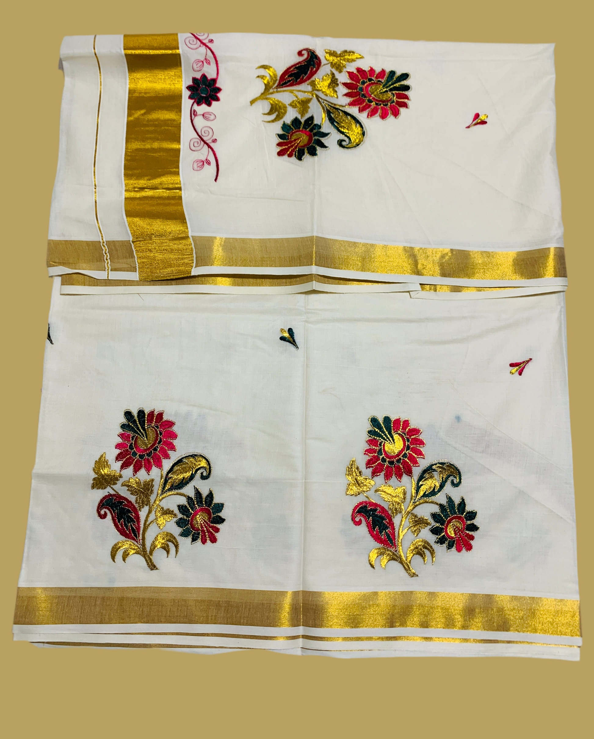 Kerala Cotton Saree Cream Colour with Floral work Design with Zari Border. Light weight and easy to drape.