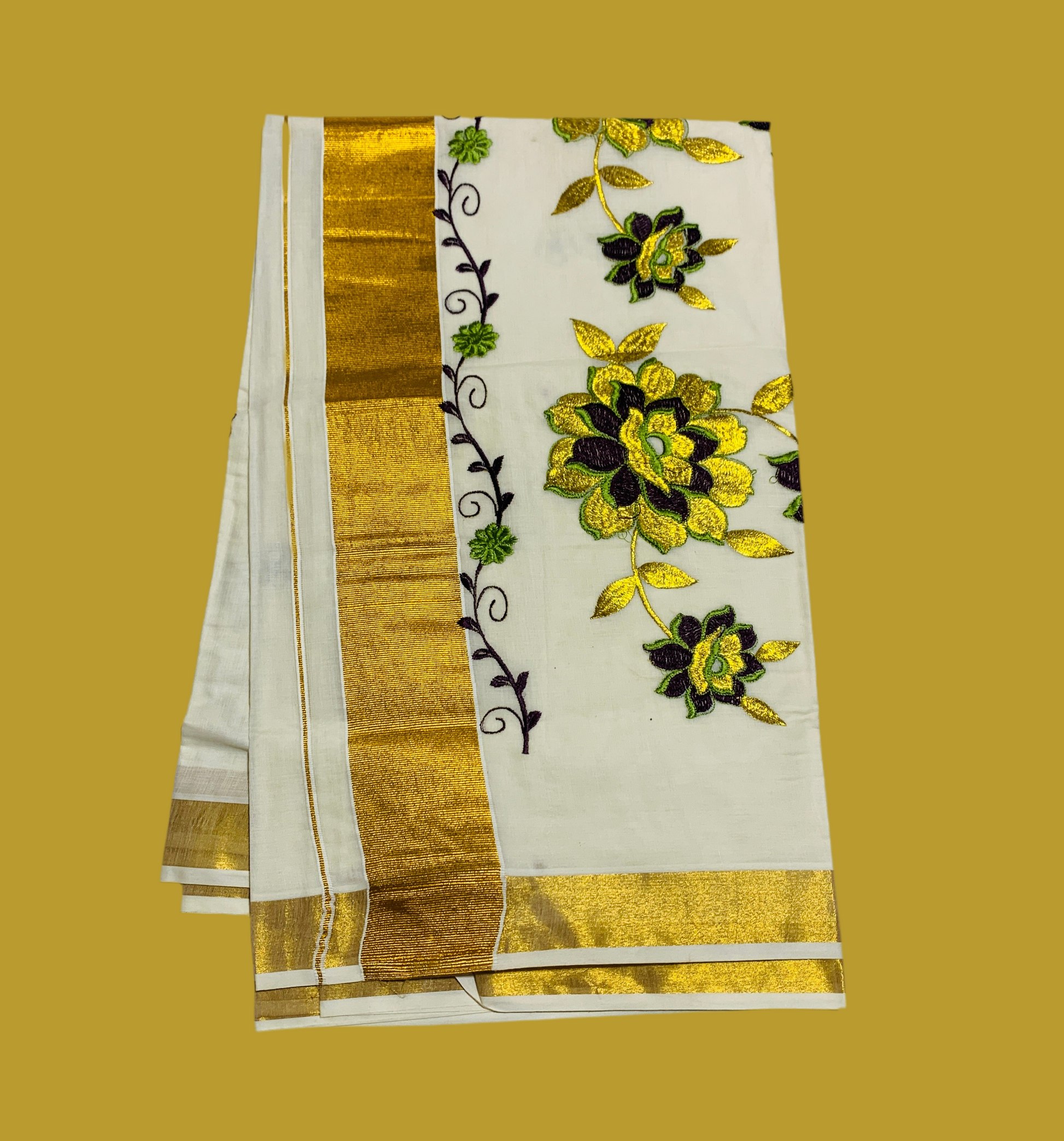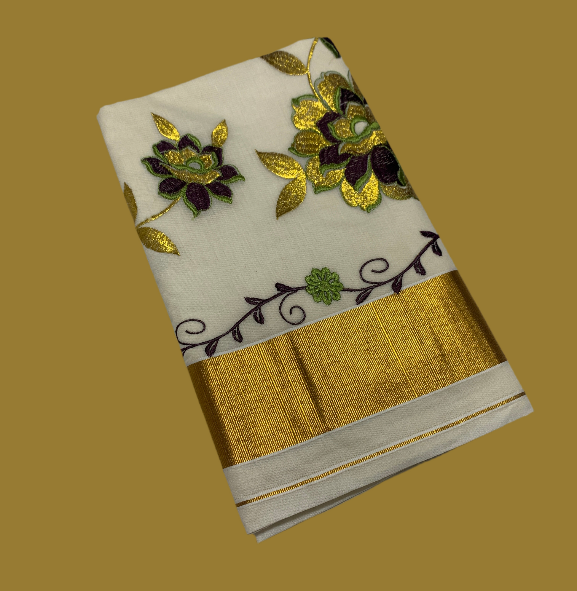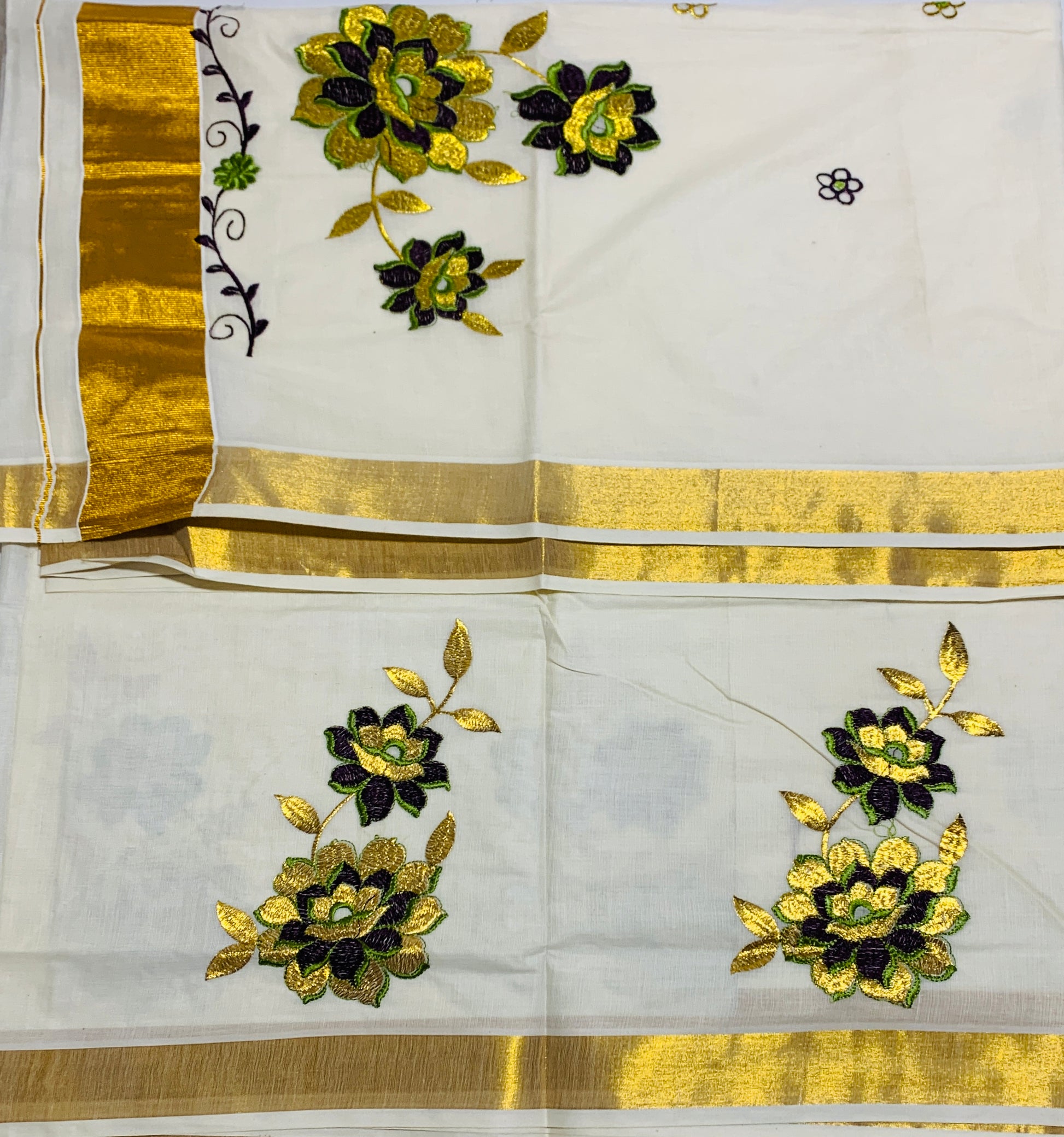 Kerala Cotton Saree Cream Colour with Floral work Design with Zari Border. Light weight and easy to drape.