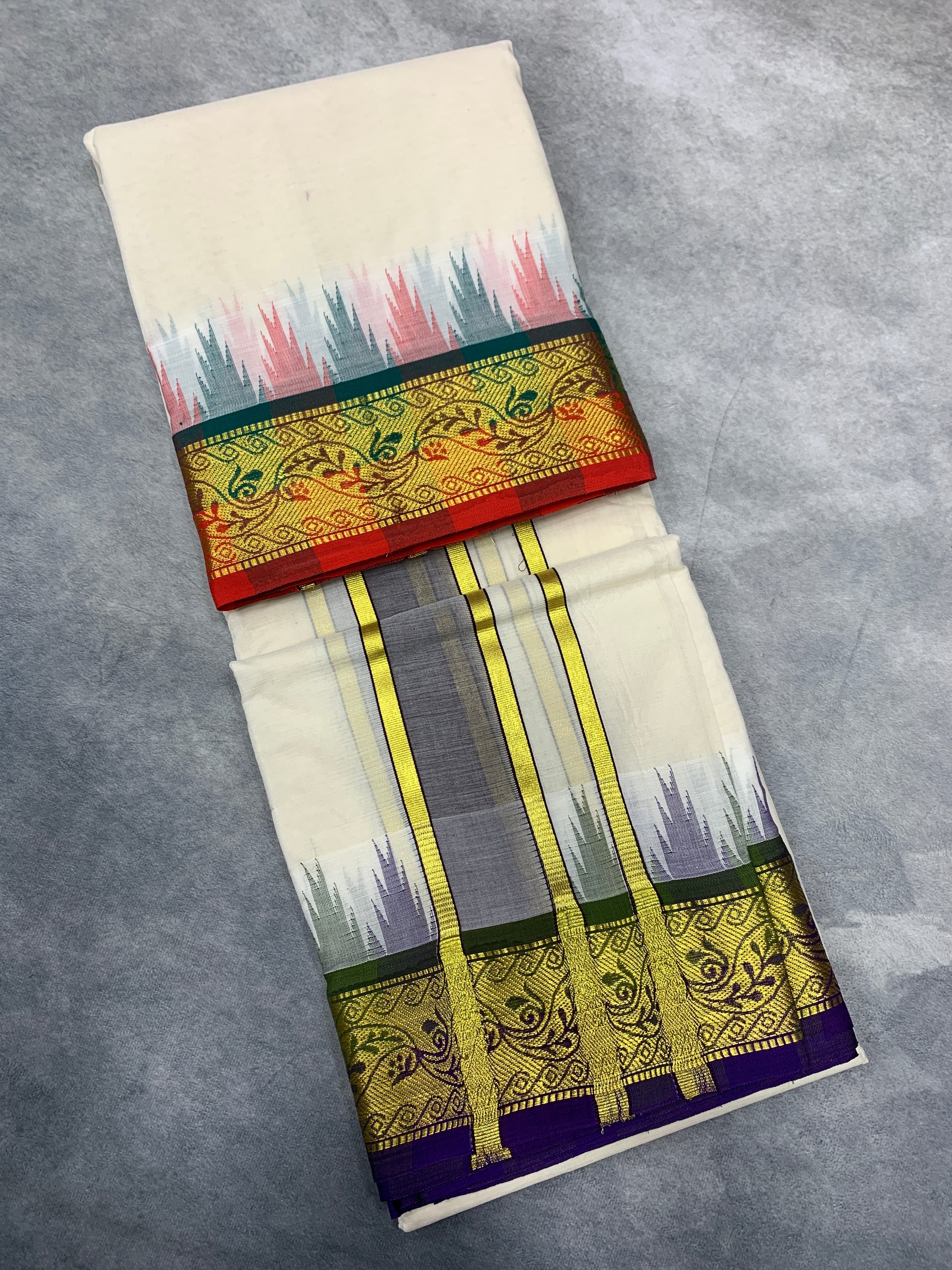 9X5 Korvai Cotton Dhoti Half White Colour with Multi Colour Border