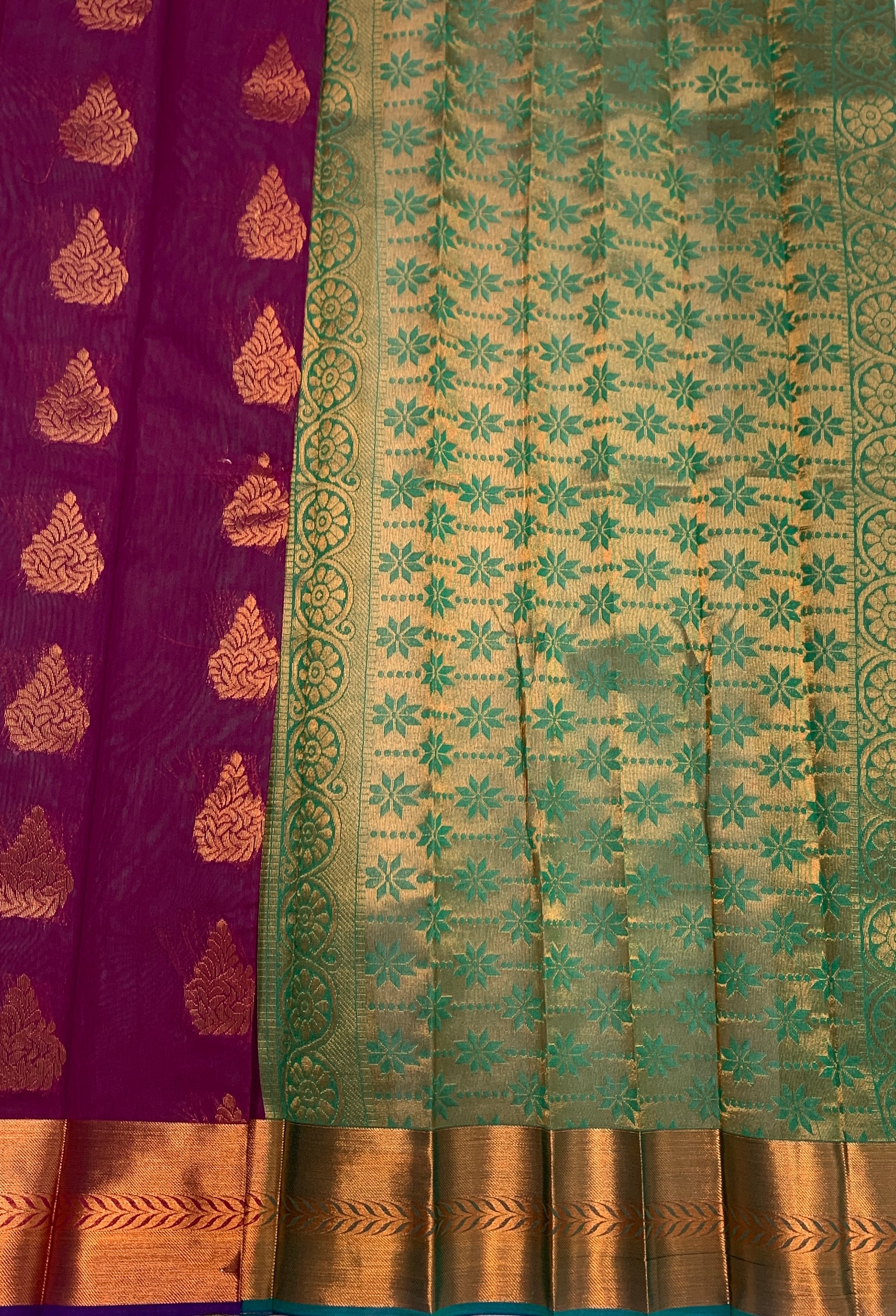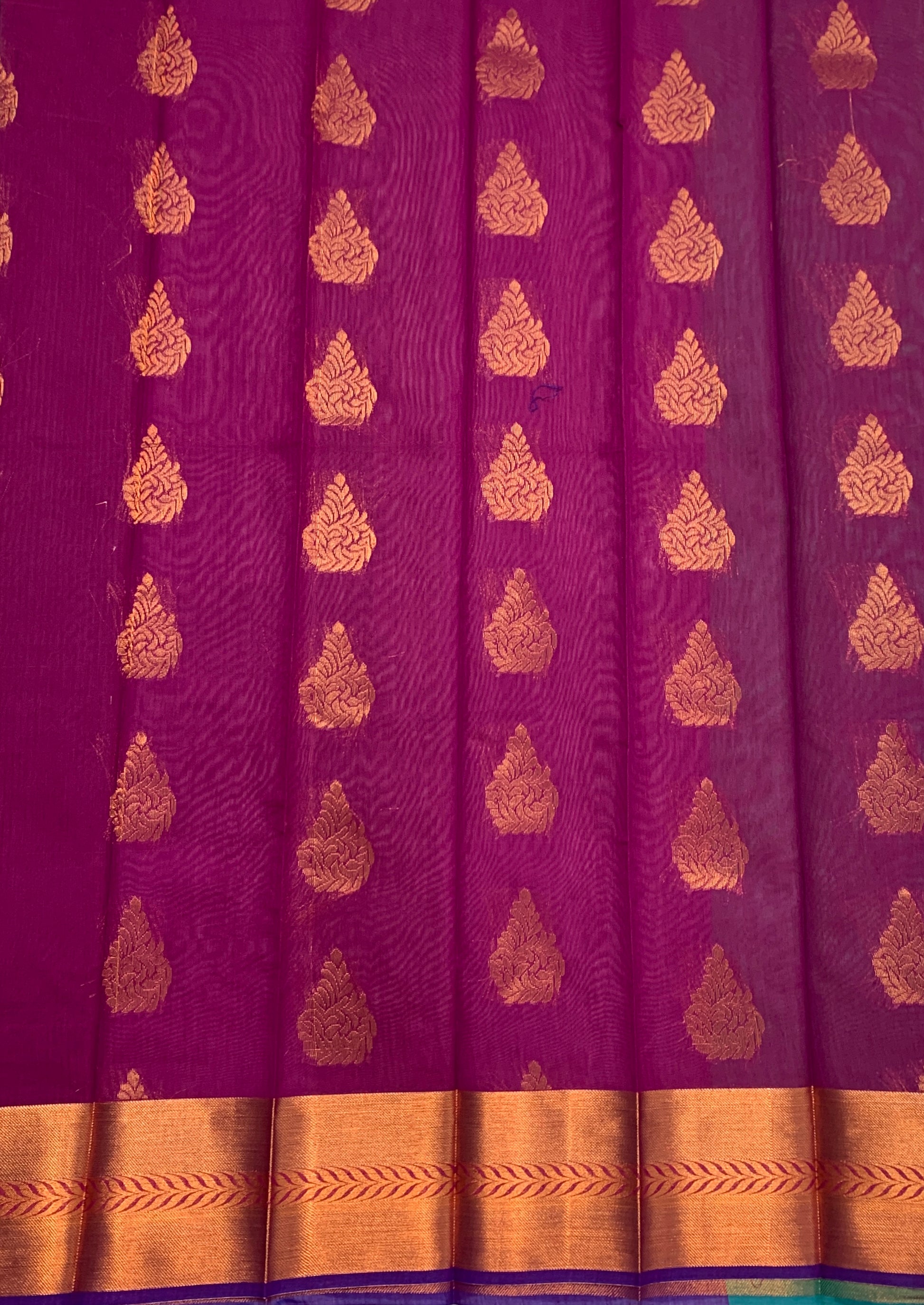 Magenta shade silk cotton with Copper Zari Border . Light weight and easy to drape.