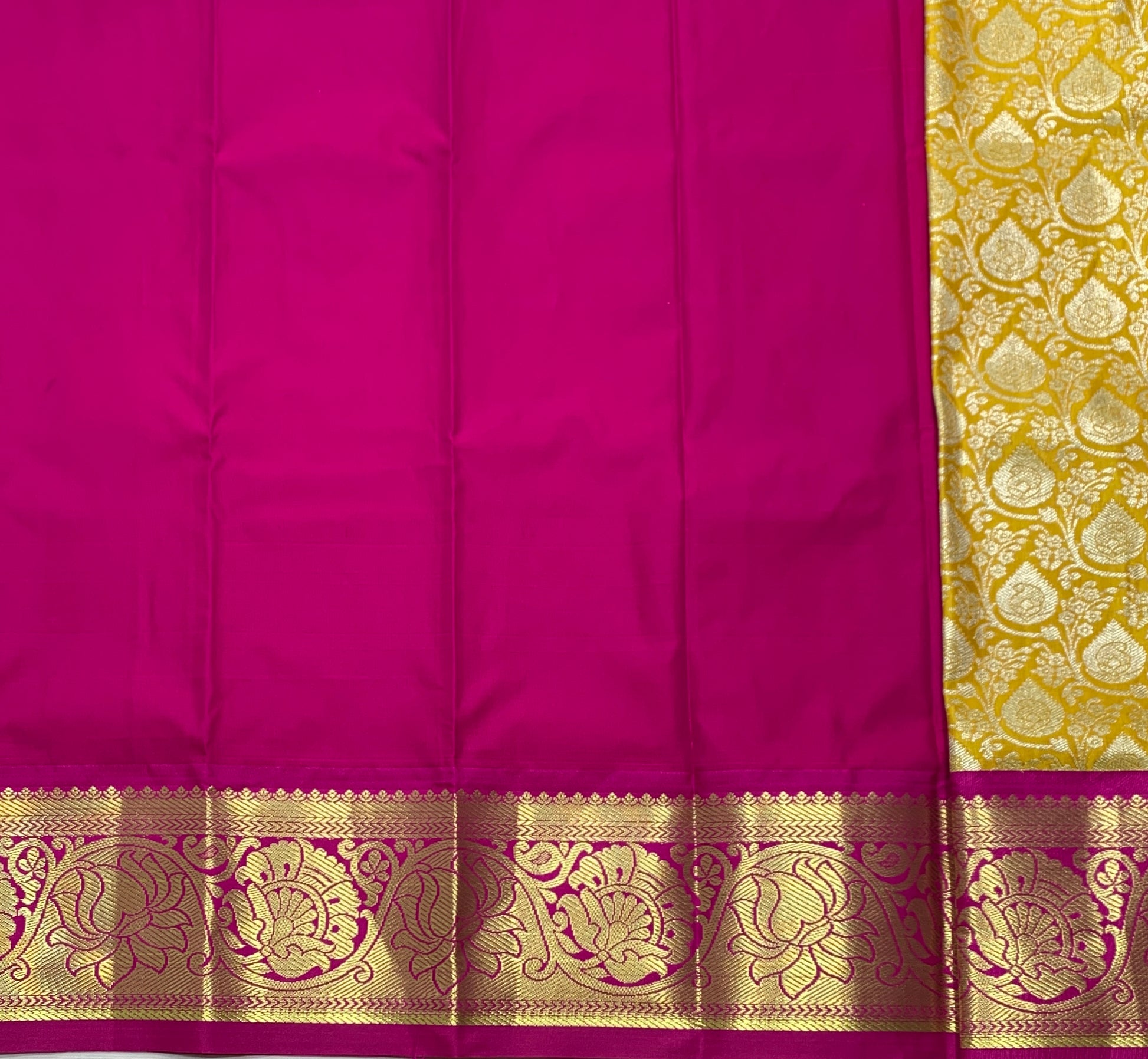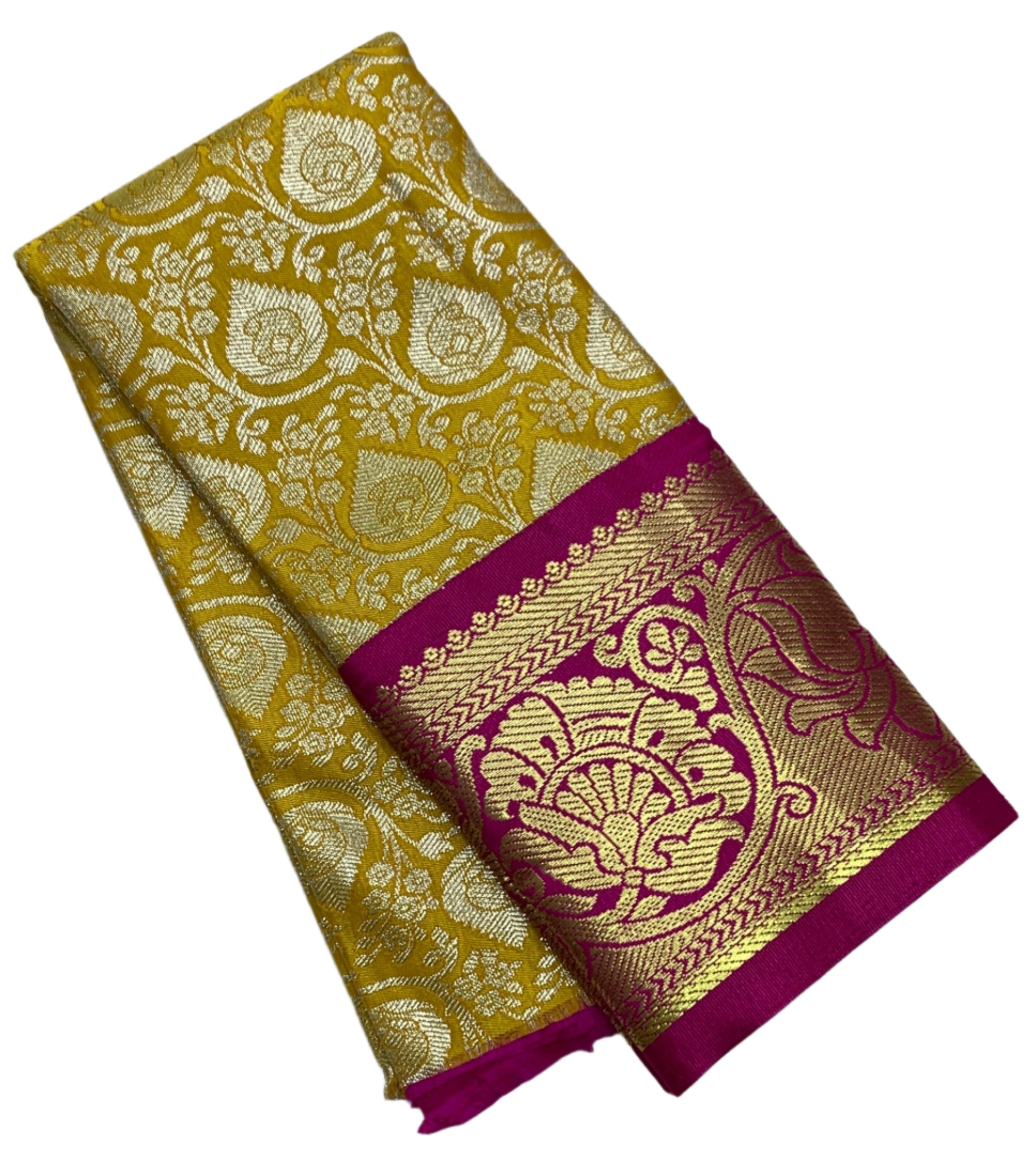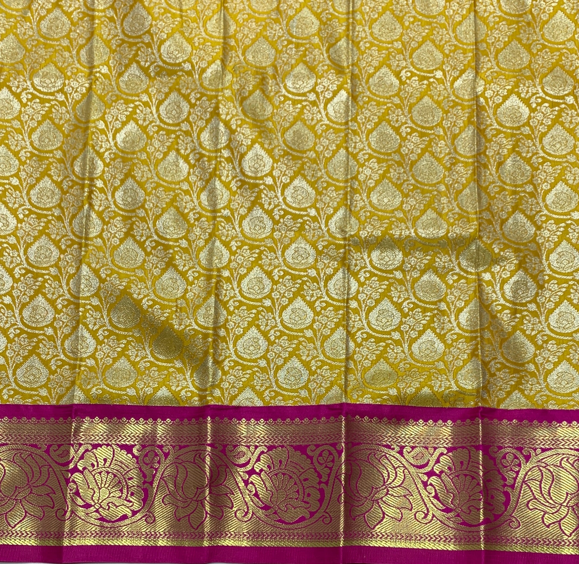 Mustard Shade Vegan Silk Kids Pattu Pavadai with Contrast Border unstitched Pattu Pavadai material for kids for age newborn to 2 Years