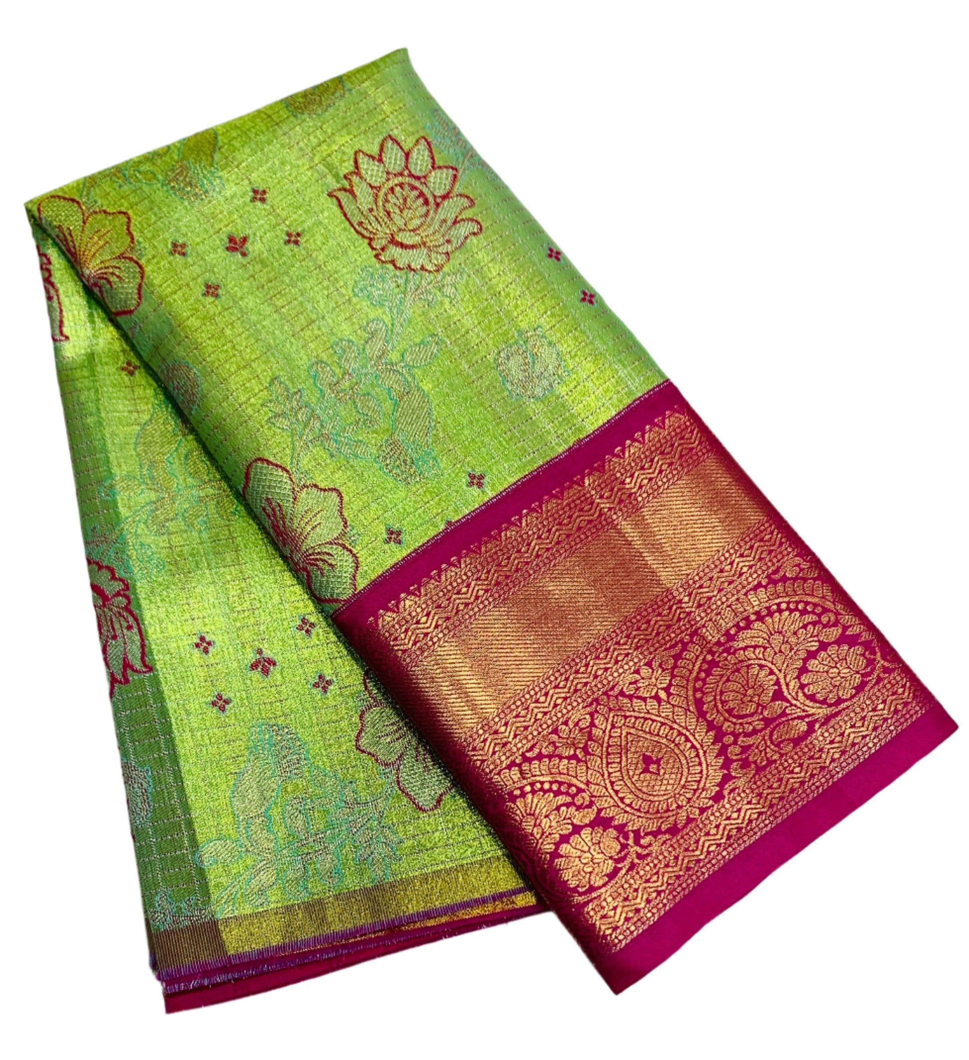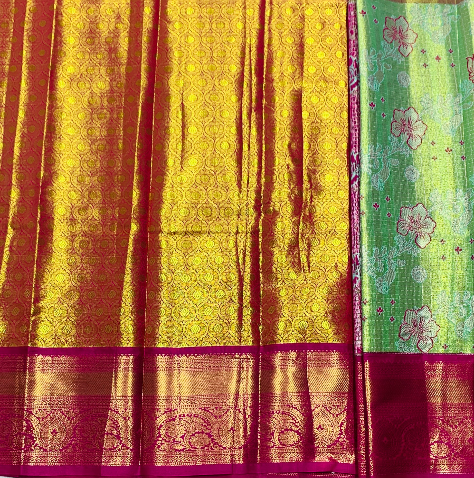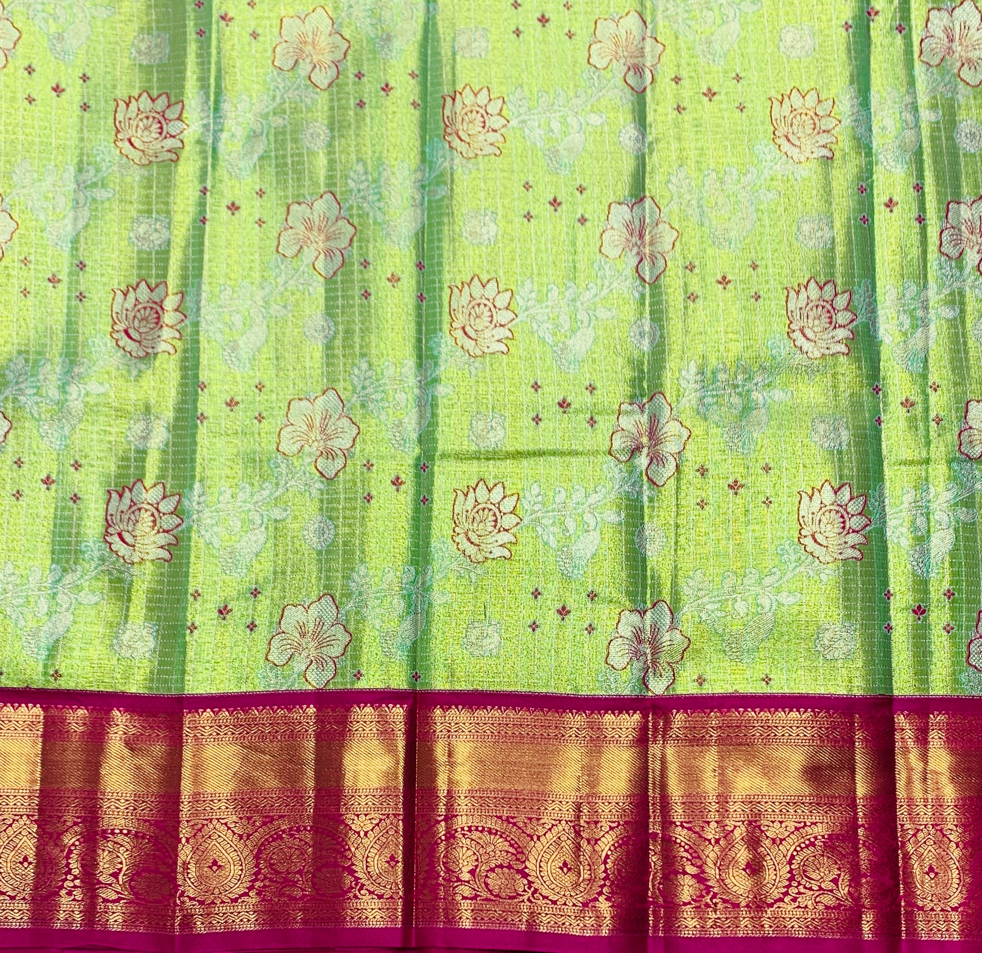 Neon Green shade with Contrast border Vegan silk unstitched Pattu Pavadai material for kids age 2 to 5