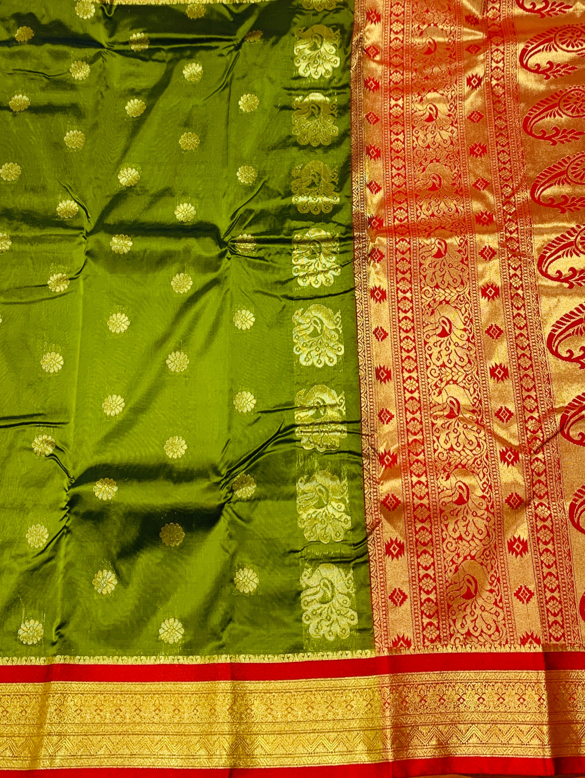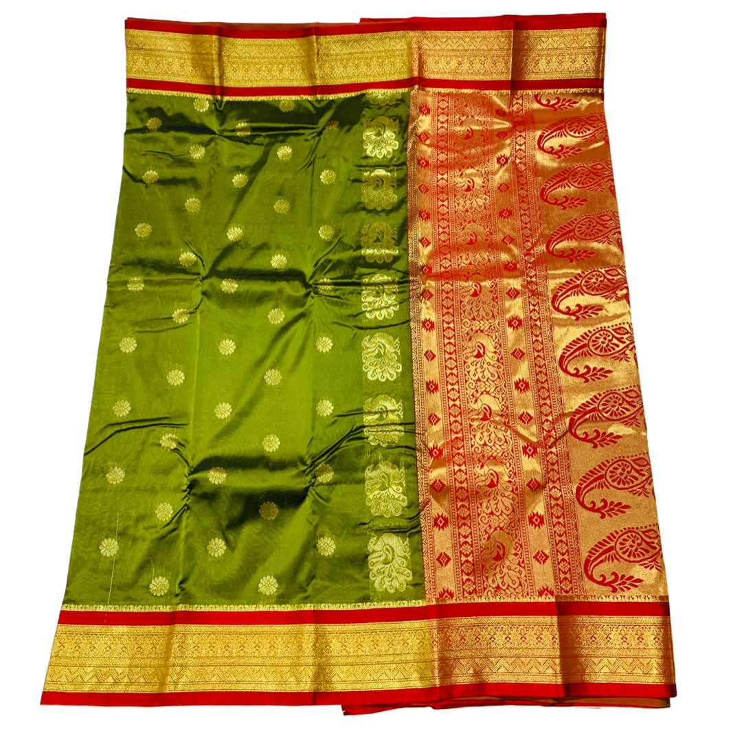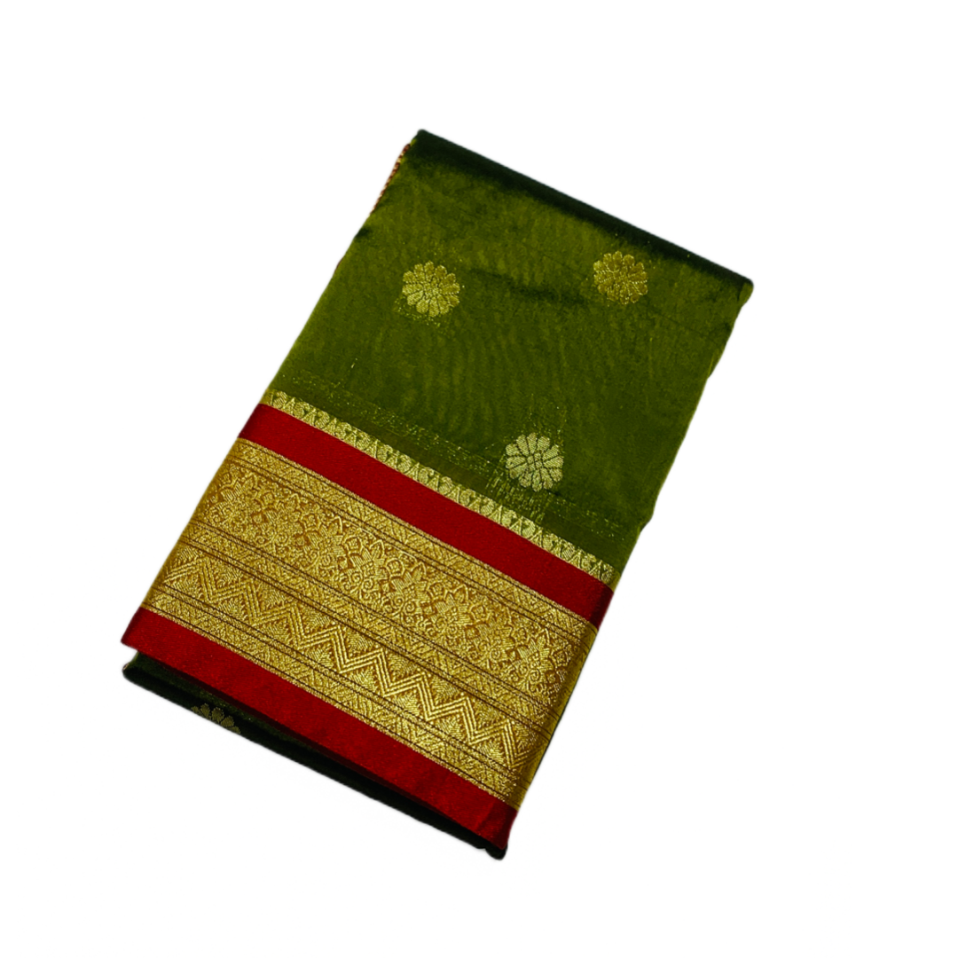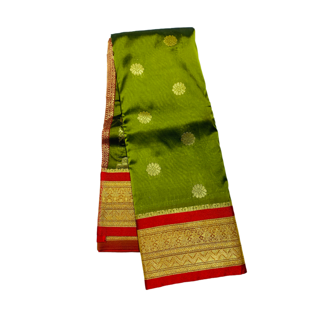 Olive Green shade saree with Golden and Red Border.Light weight & easy to wash.