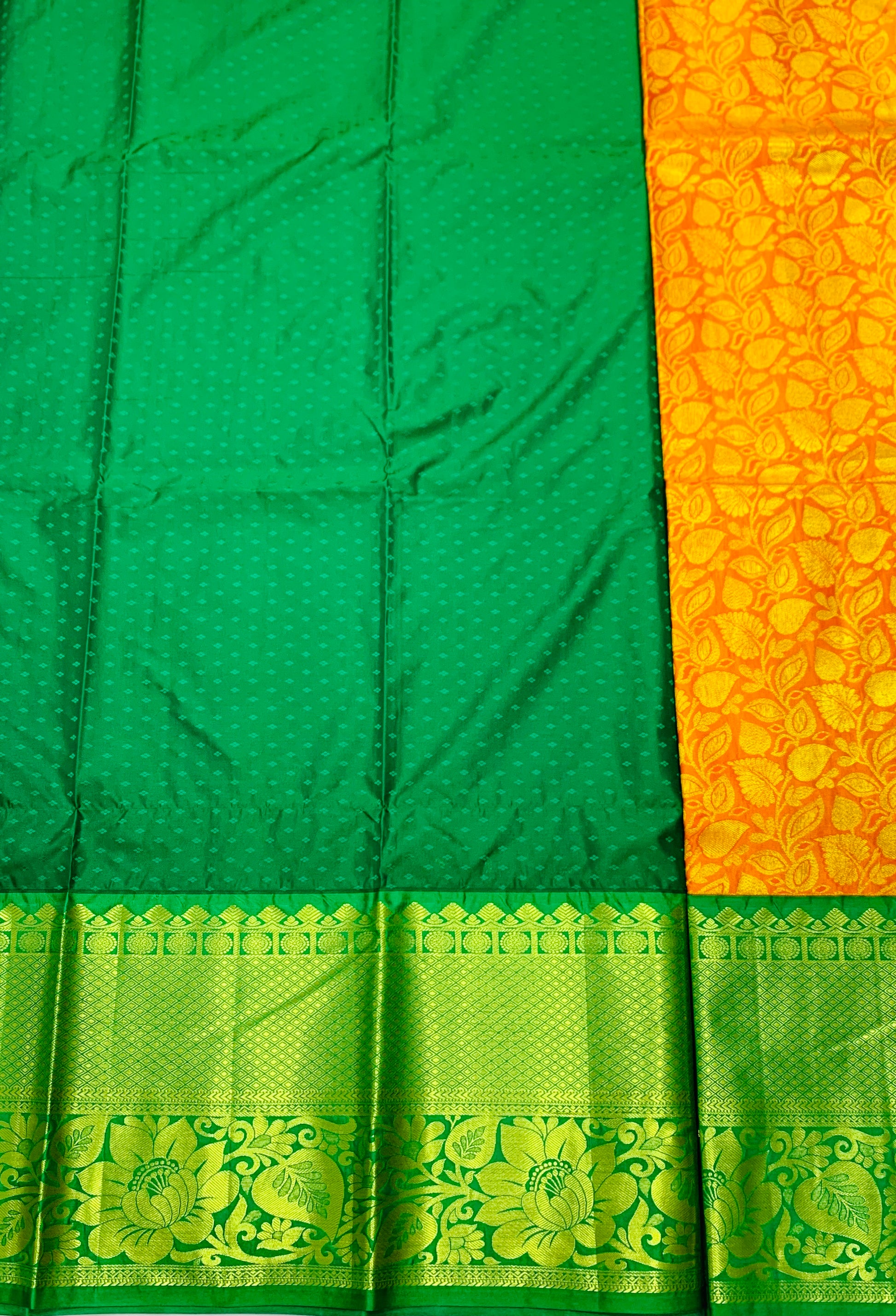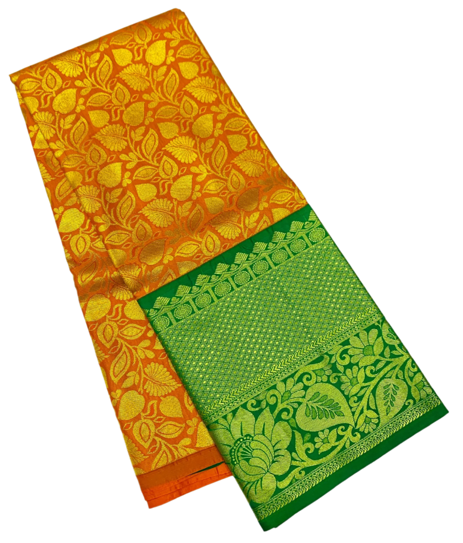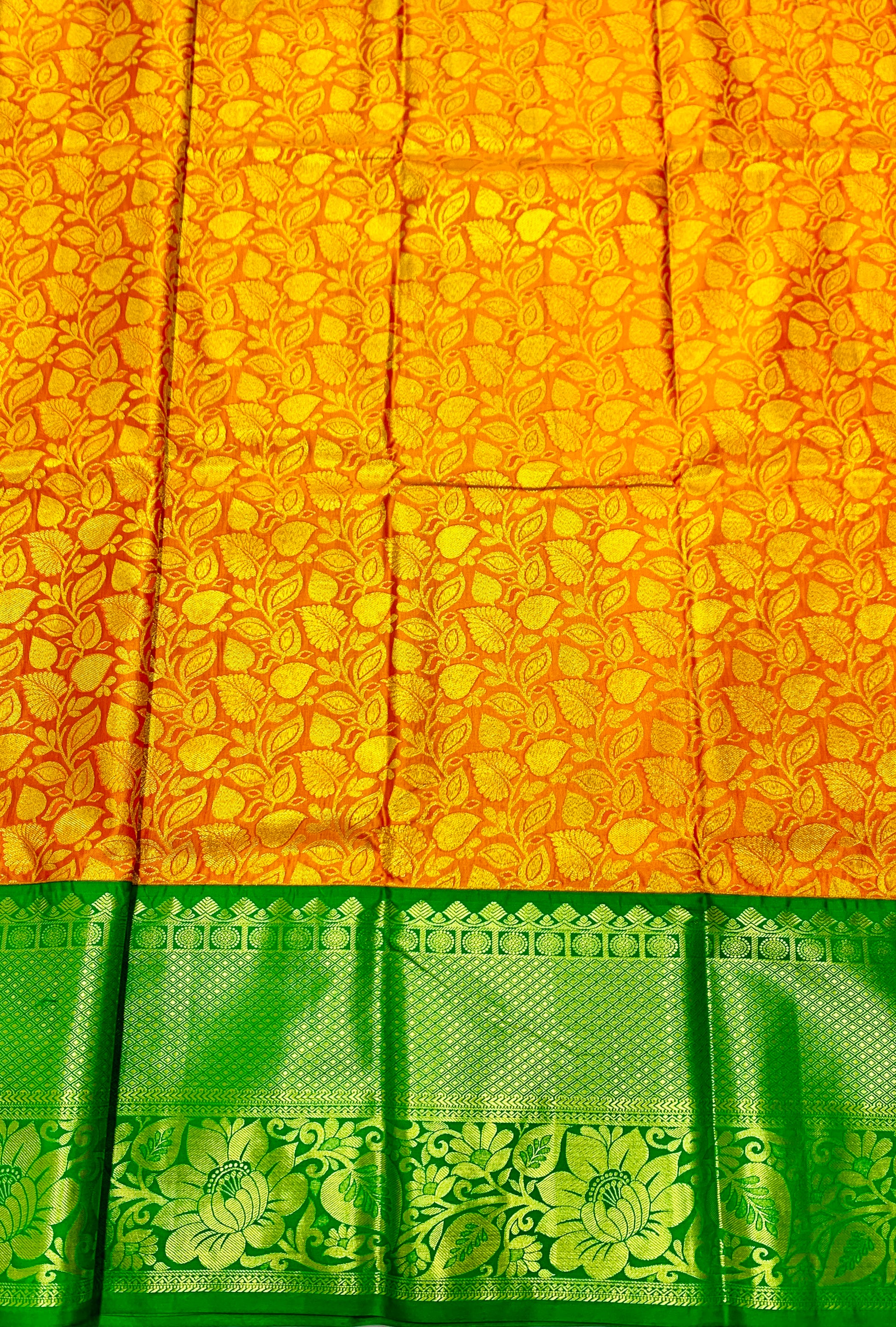 Orange shade with Contrast border Vegan silk unstitched Pattu Pavadai material for age Above 10 years
