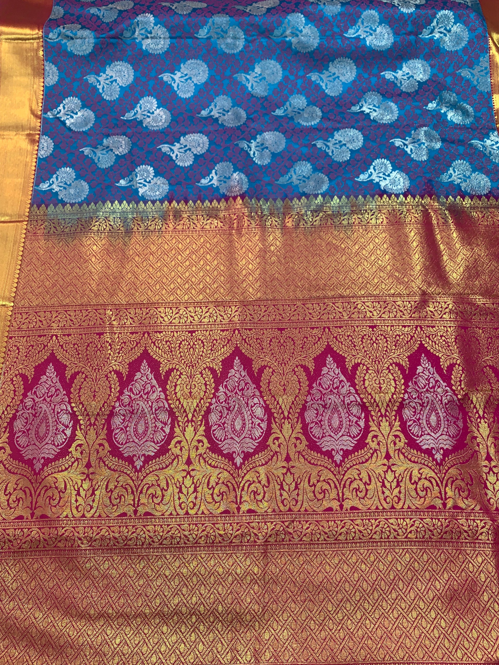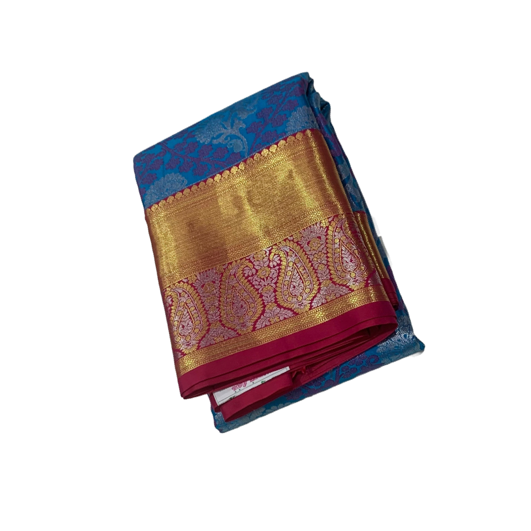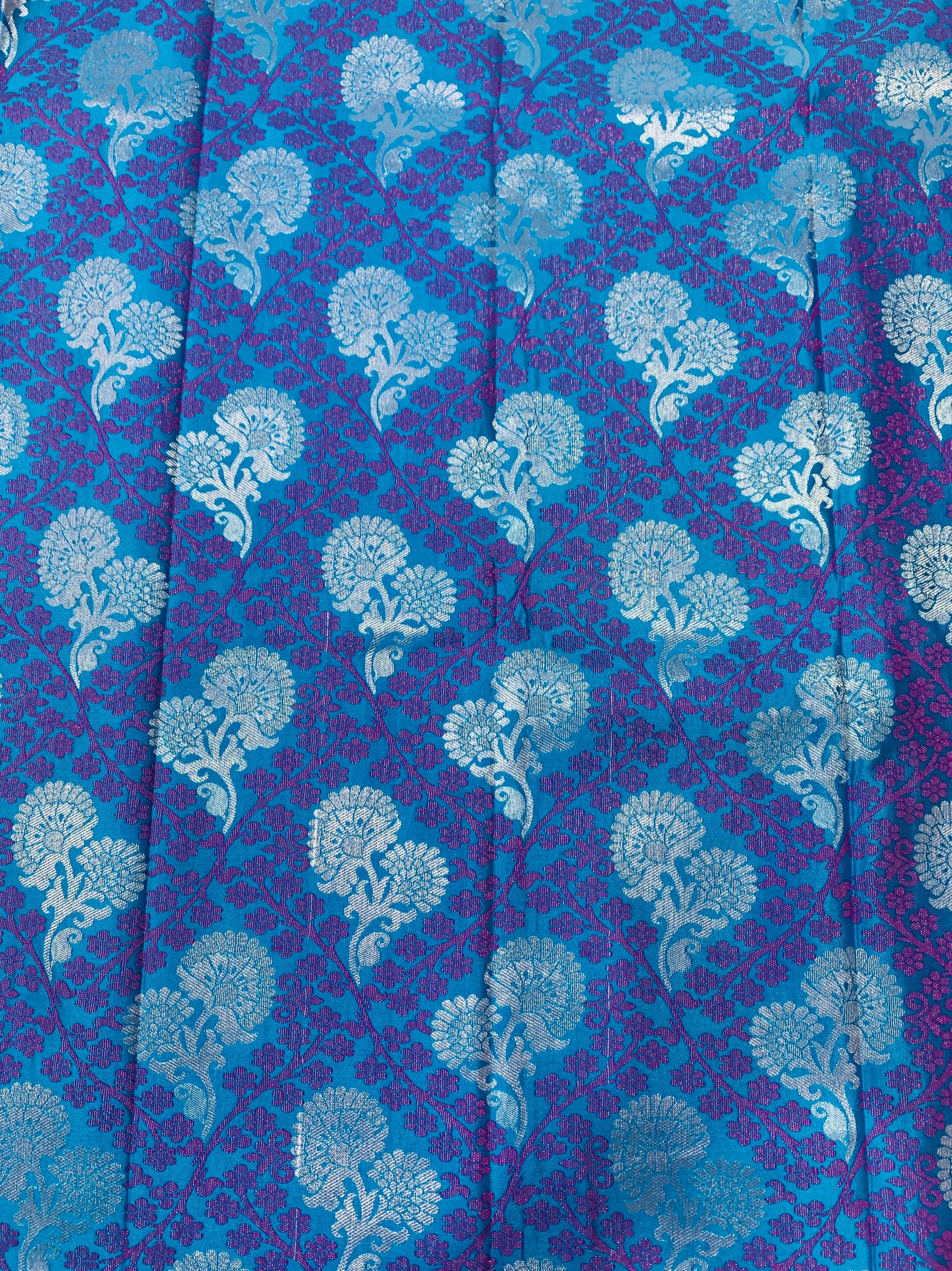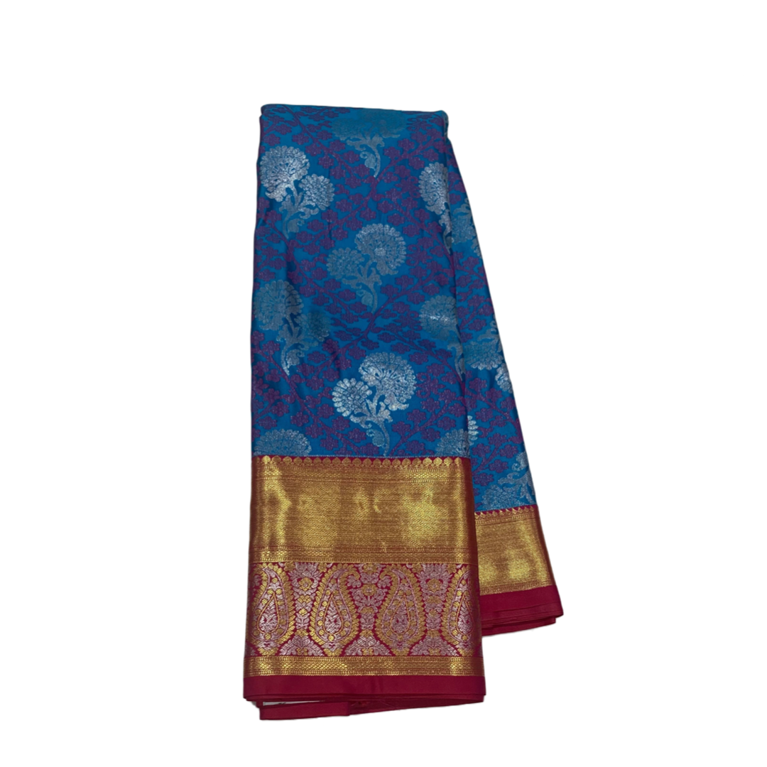 Beautiful Pepsi blue floral body design with silver zari flower. Maroon border with large mango design.