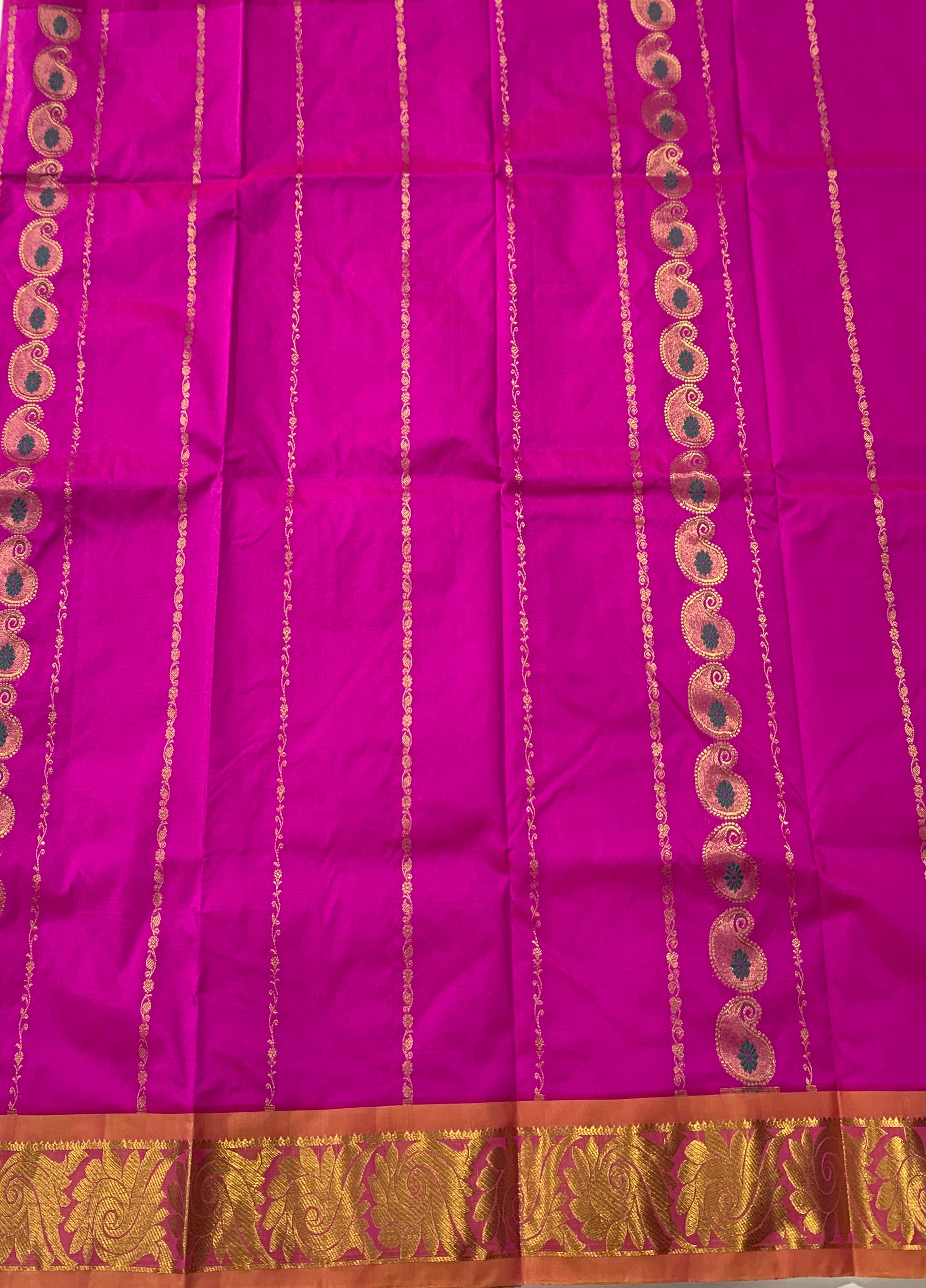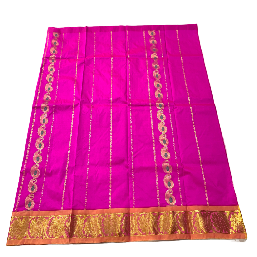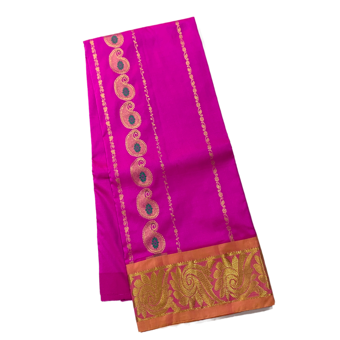 Pink shade with contrast border Semi Silk unstitched Pattu Pavadai material for kids age 5 to 10