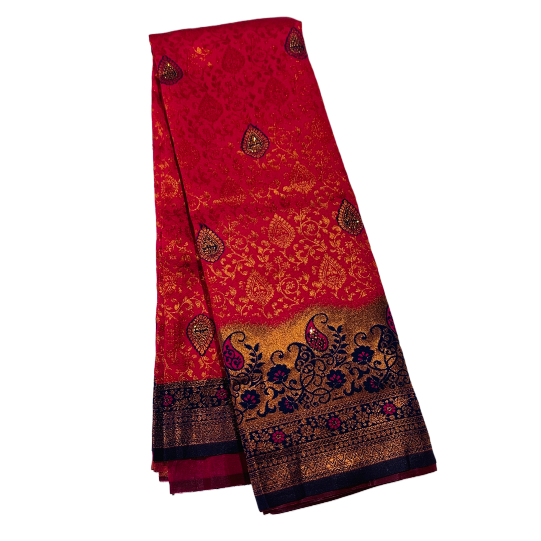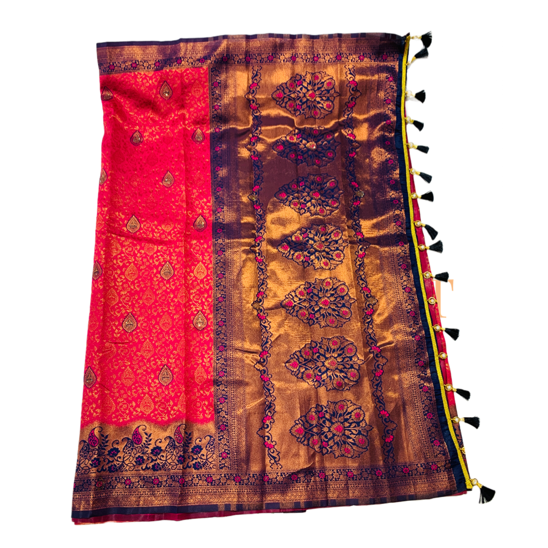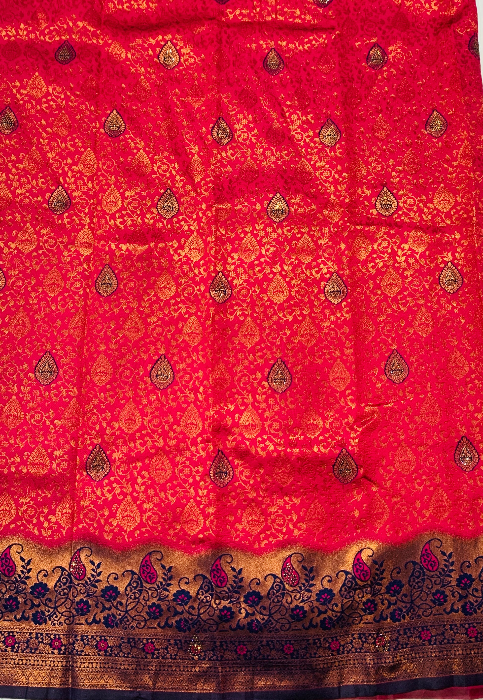 Attractive Pink shade with flower design. Navy Blue border Mango and Floral design.dry wash only.