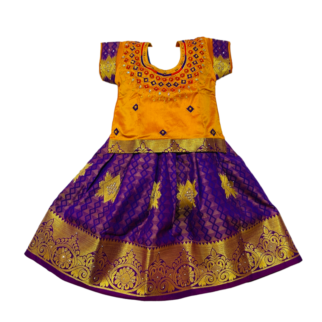 Ready To Wear Violet Pavadai with contrast Mango Yellow Blouse for 1 Year Baby.