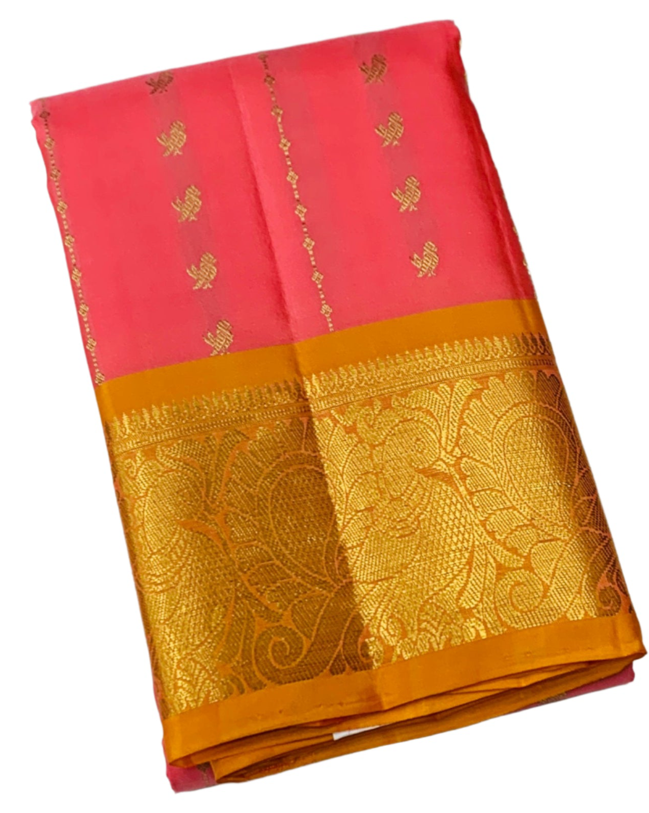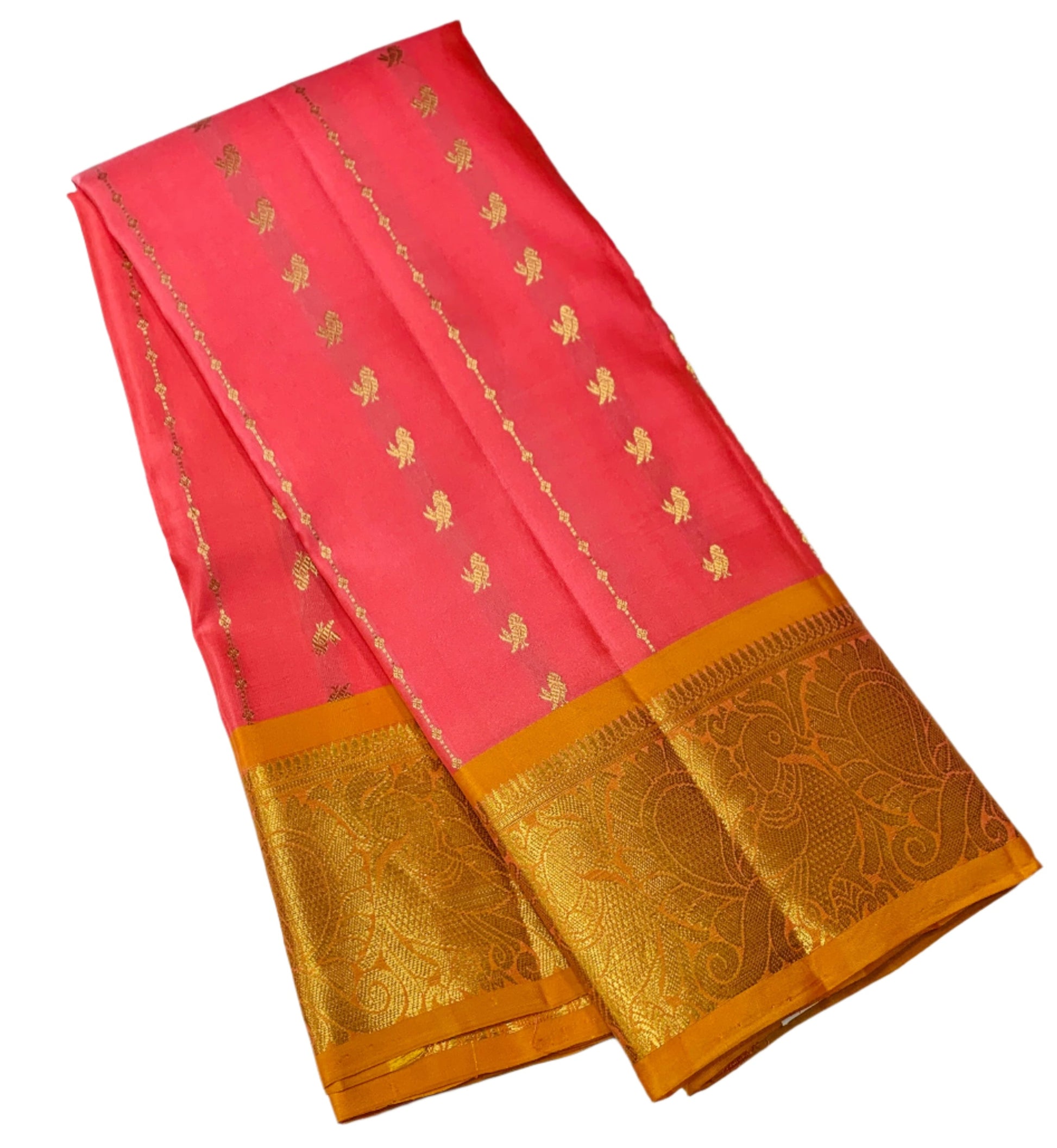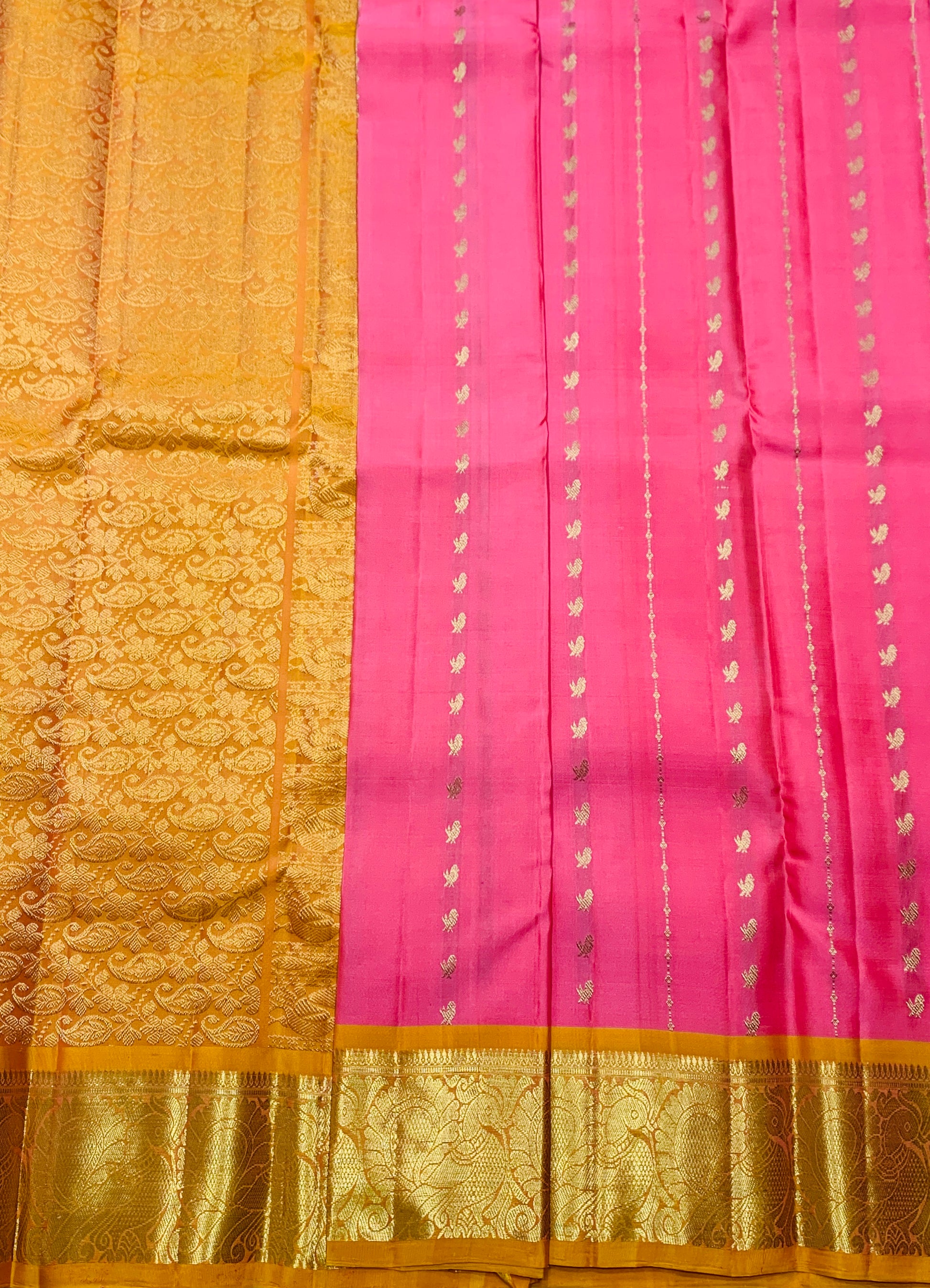 Pure Kanchipuram Silk Baby Pink Colour with Golden Yellow Border.