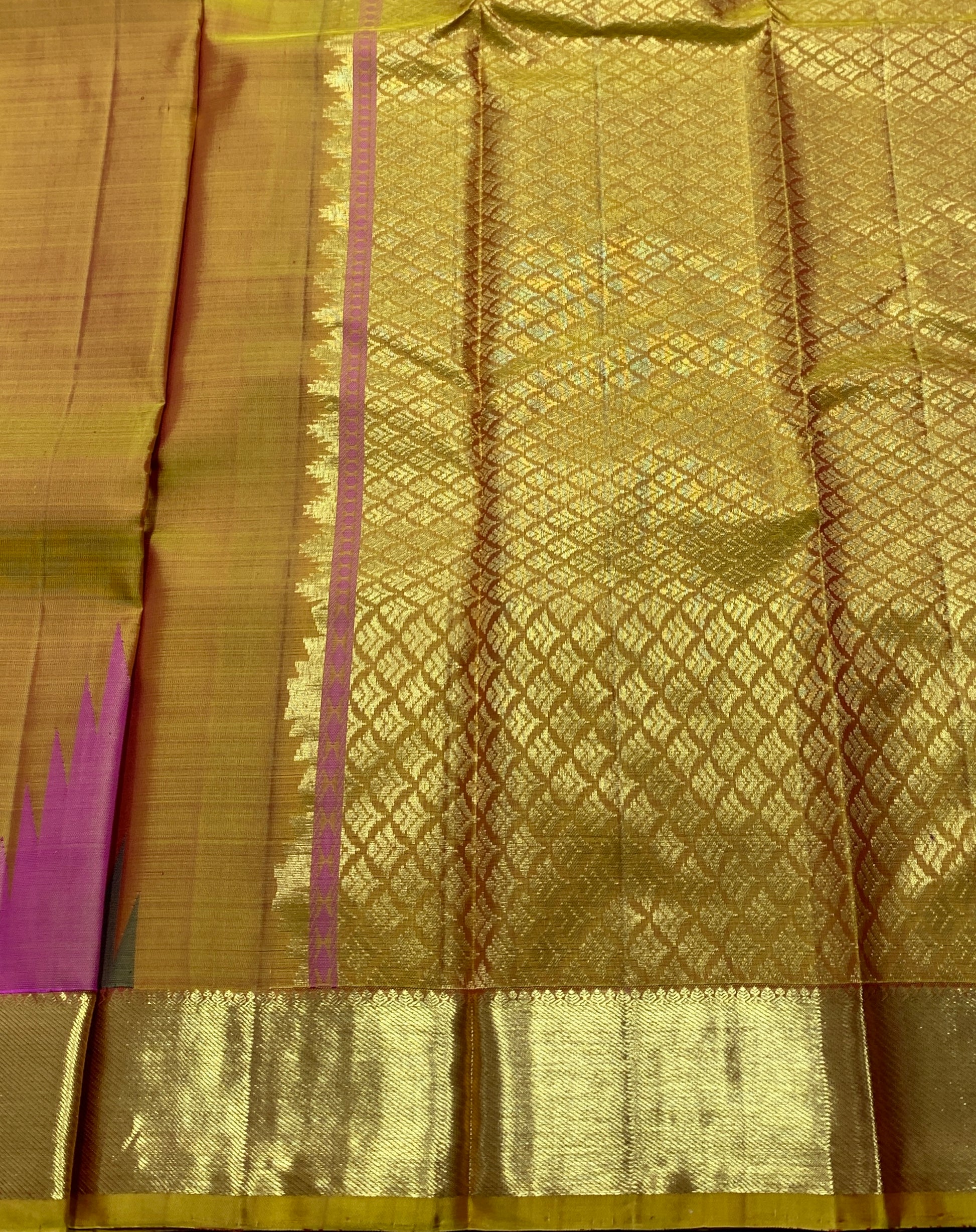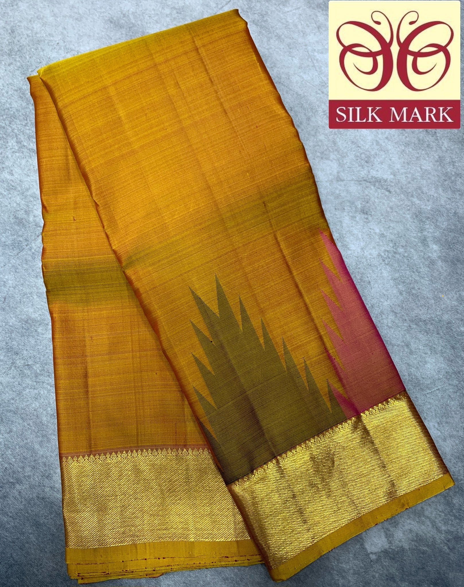 Pure Kanchipuram Silk Golden Mustard Colour with Golden Zari Border.
