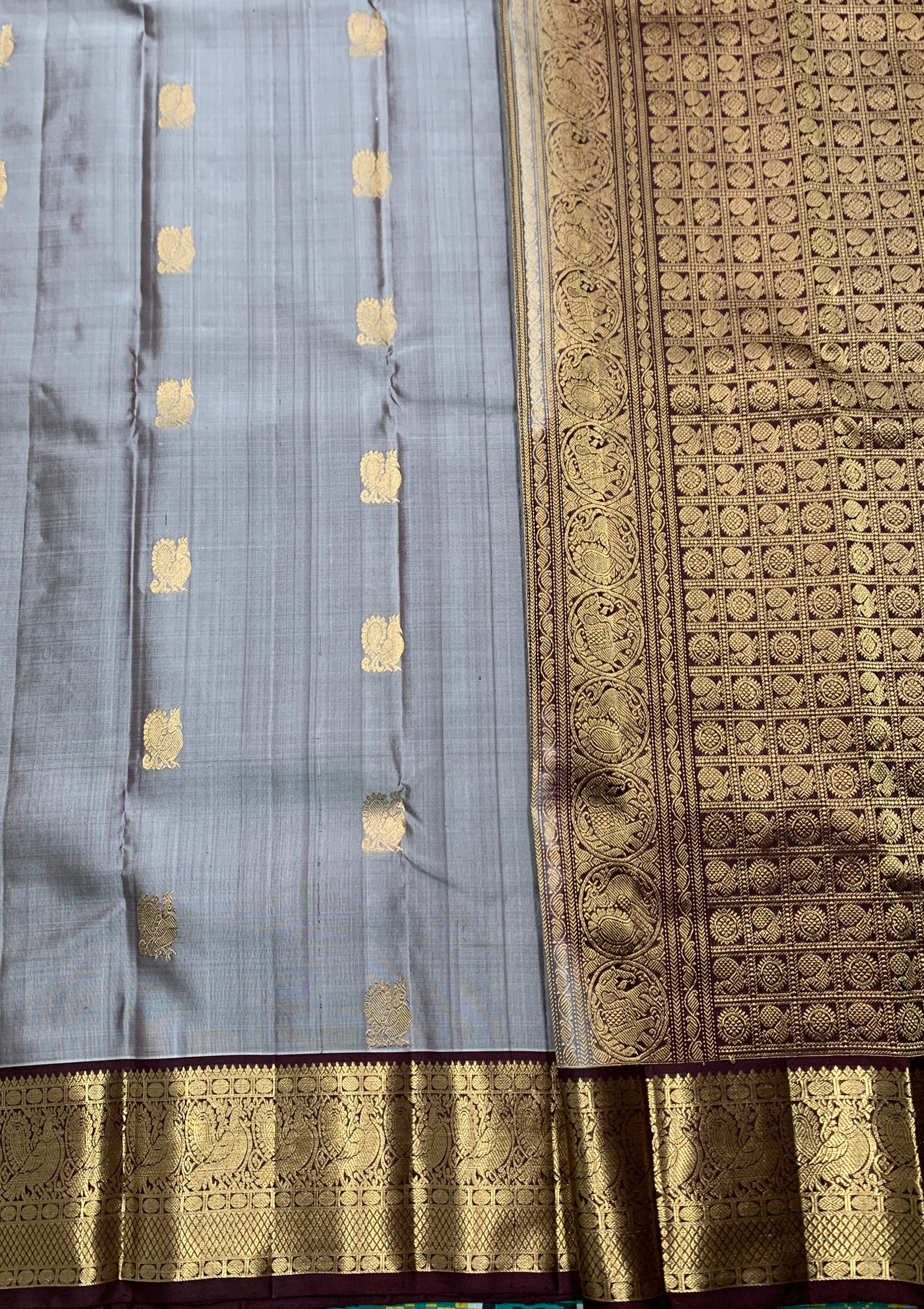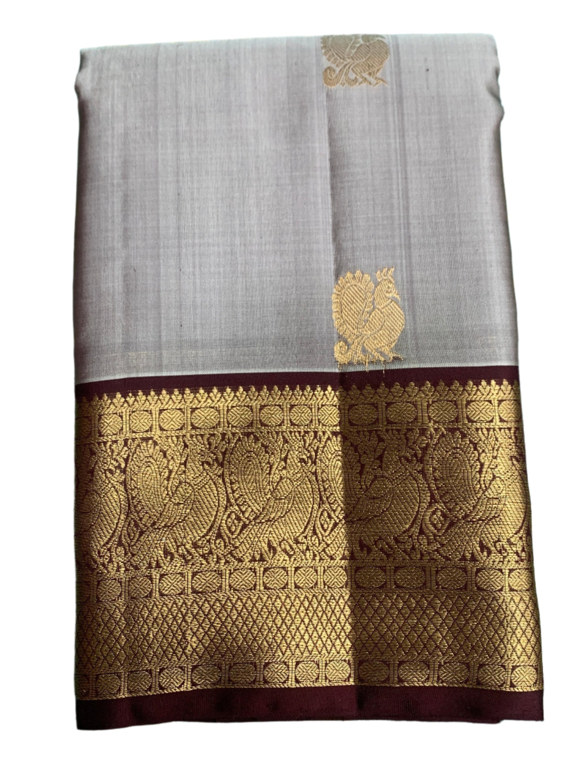 Pure Kanchipuram Silk Gray Colour with Brown Border. Soft and Light weight to Easy drape.