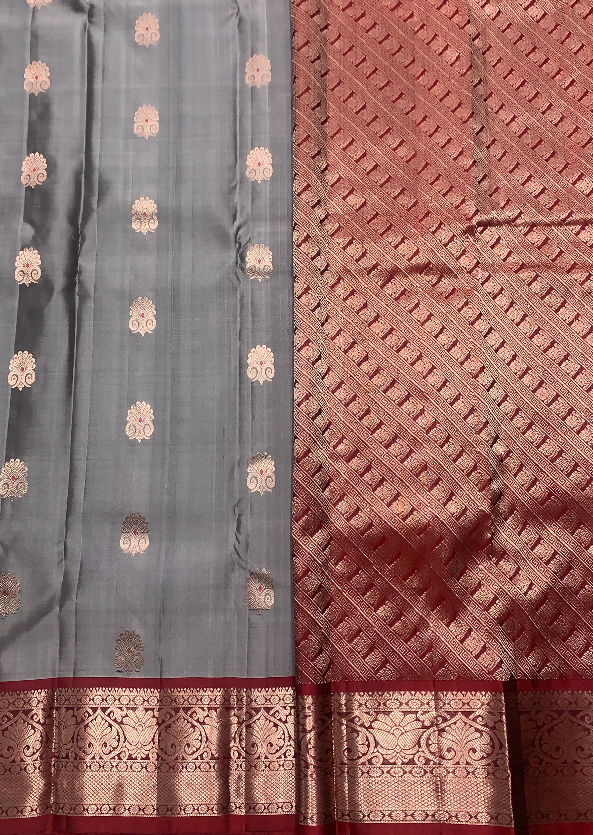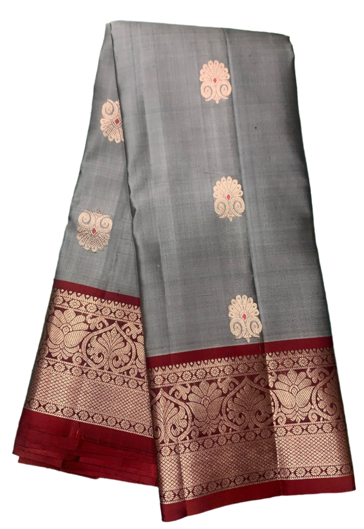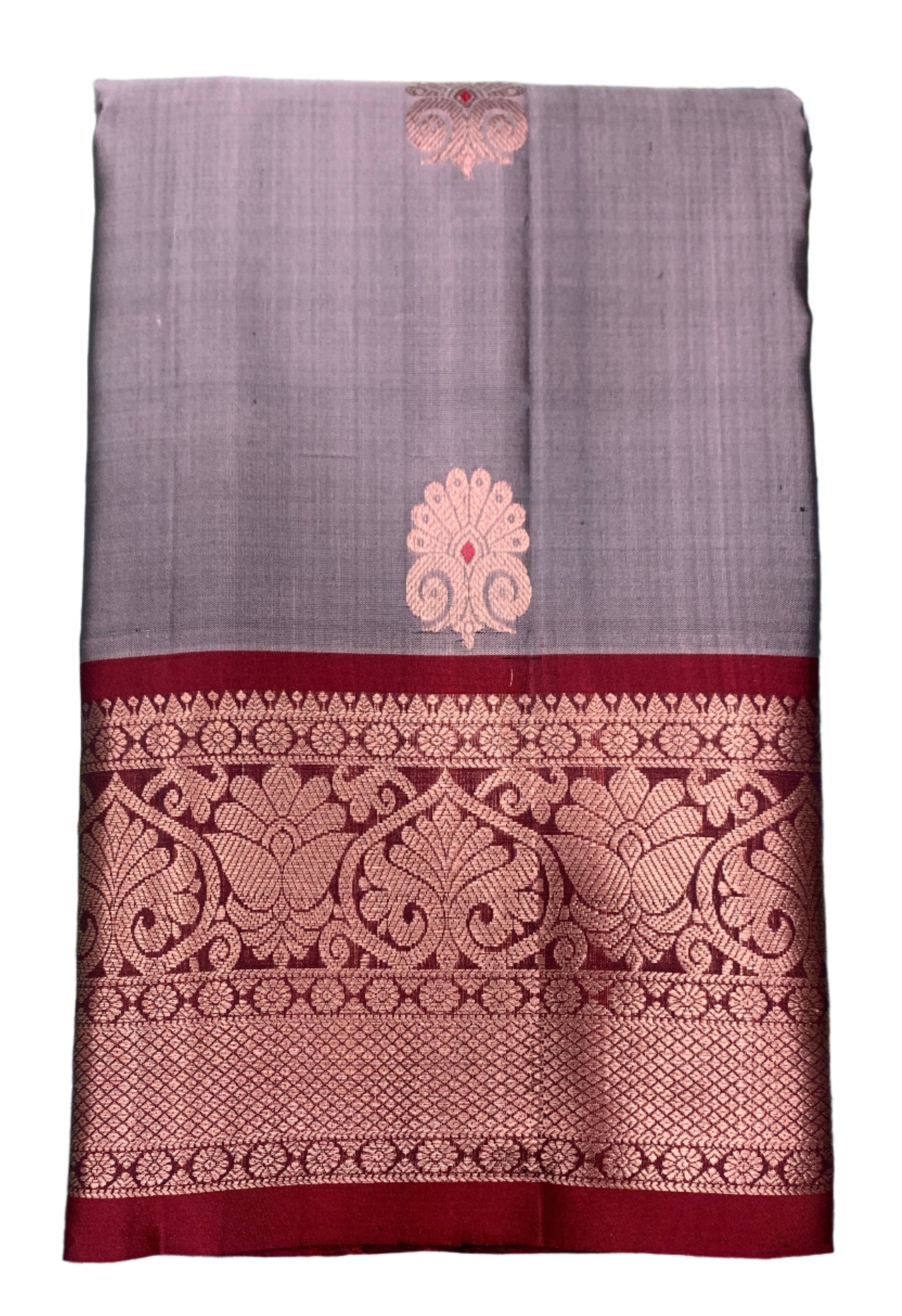 Pure Kanchipuram Silk Gray Colour with Maroon Border. Soft and Light weight to Easy drape.