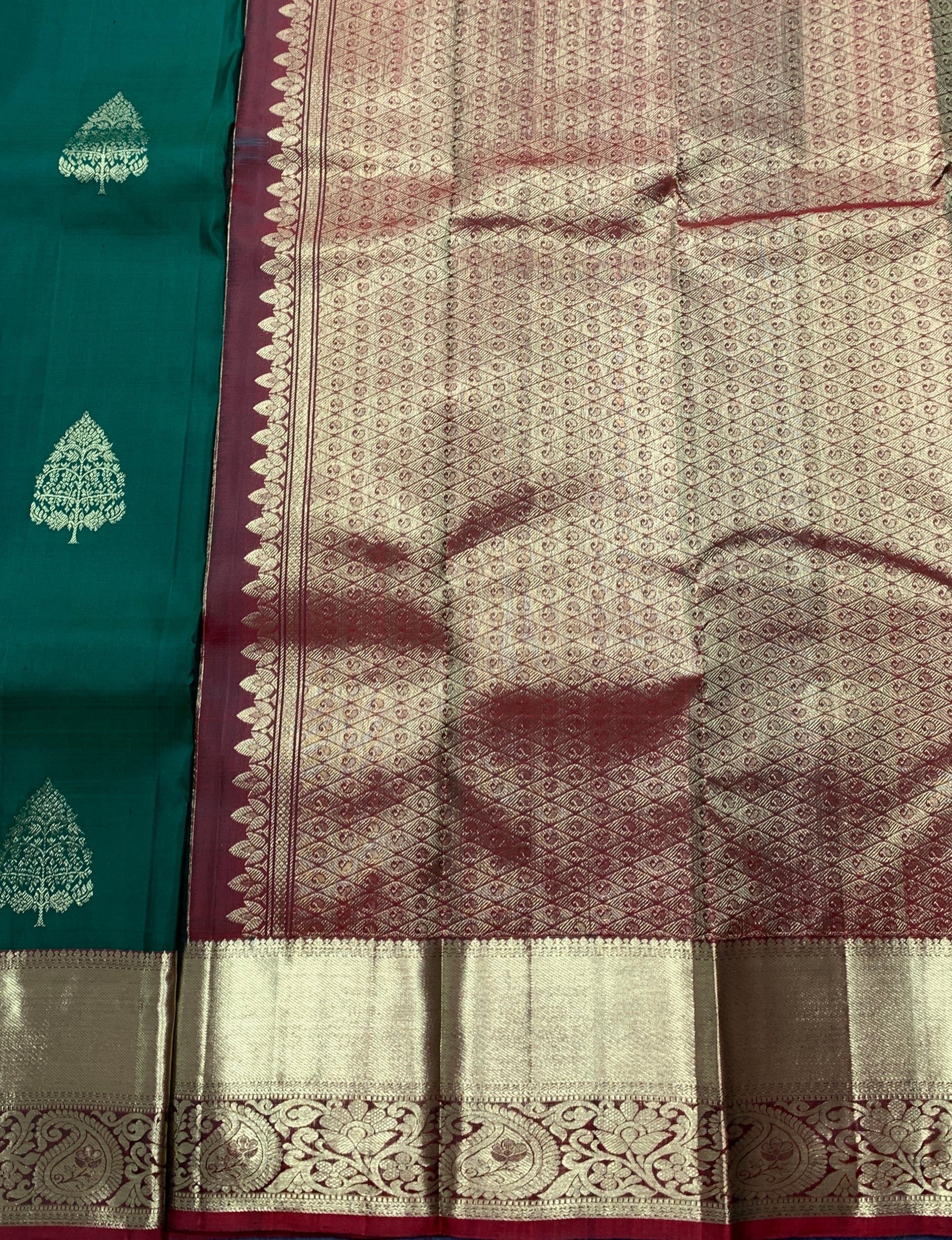 Pure Kanchipuram Silk Saree Green Colour with Golden and Maroon Border.