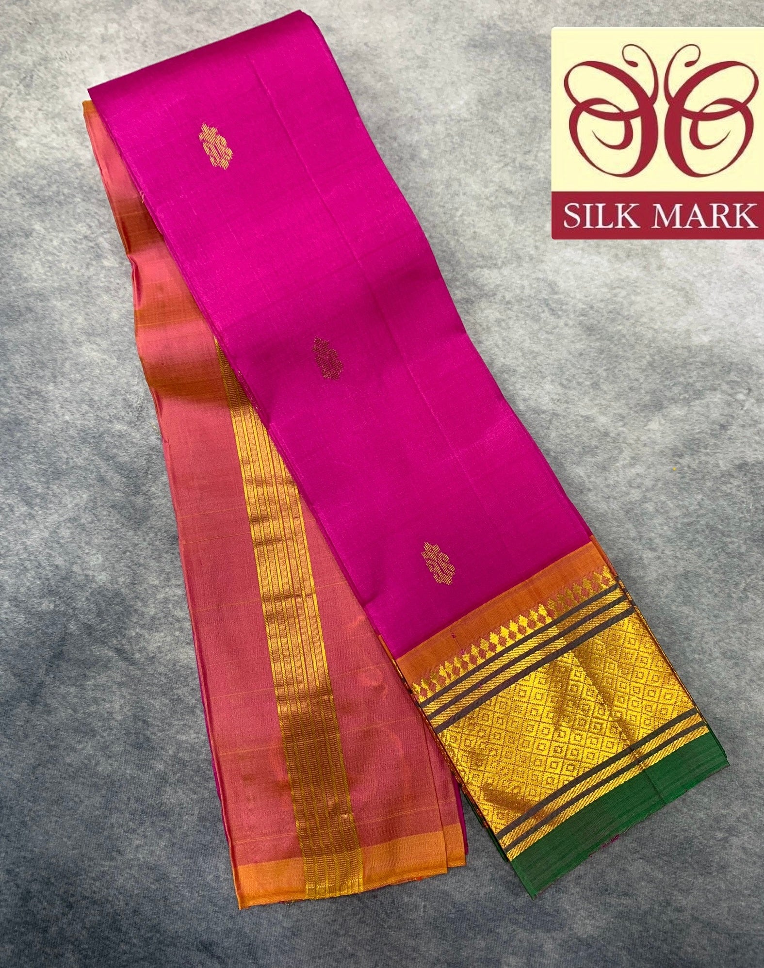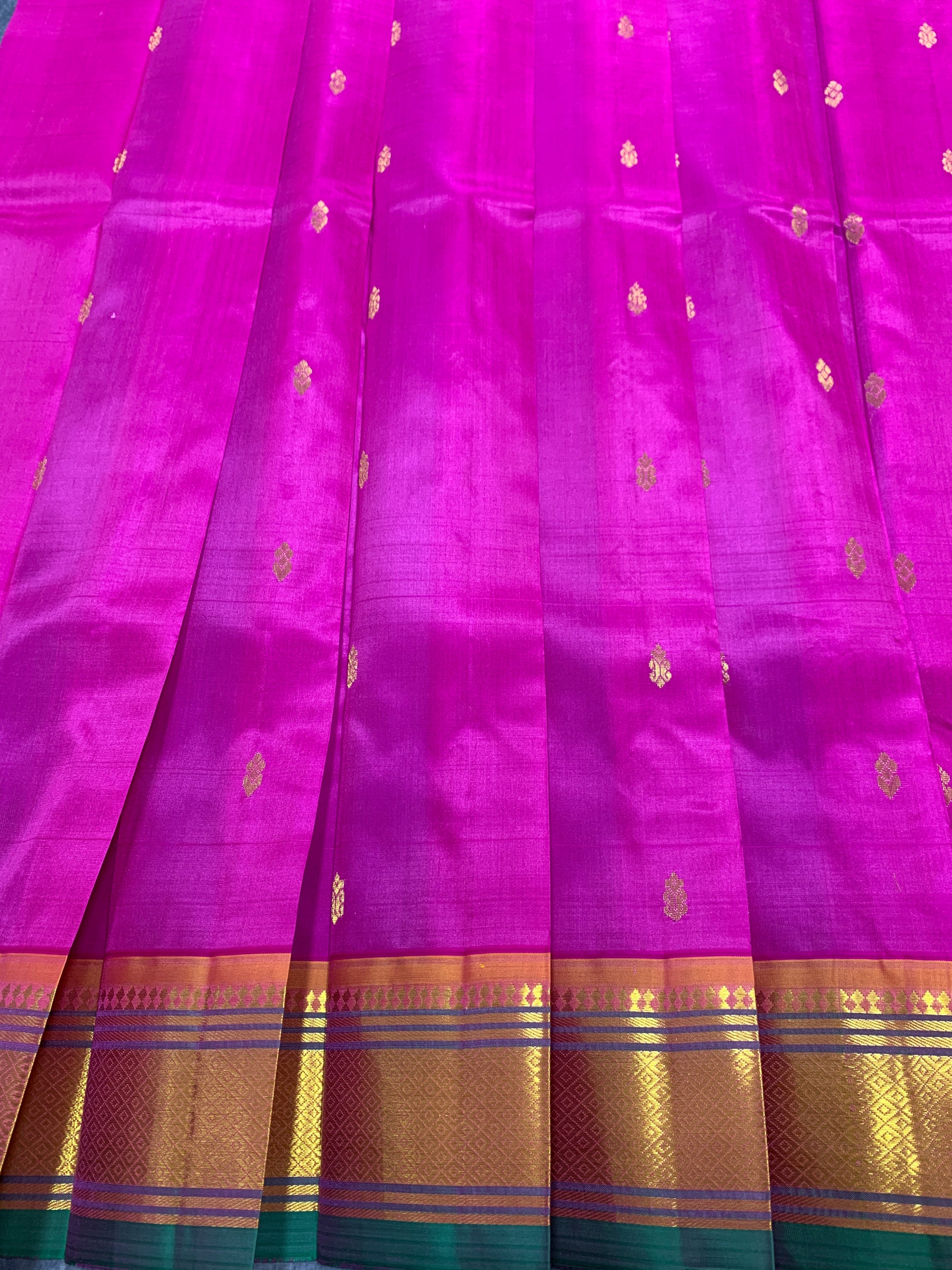 Pure Kanchipuram Silk Saree Pink Colour with Green and Gold Zari Border