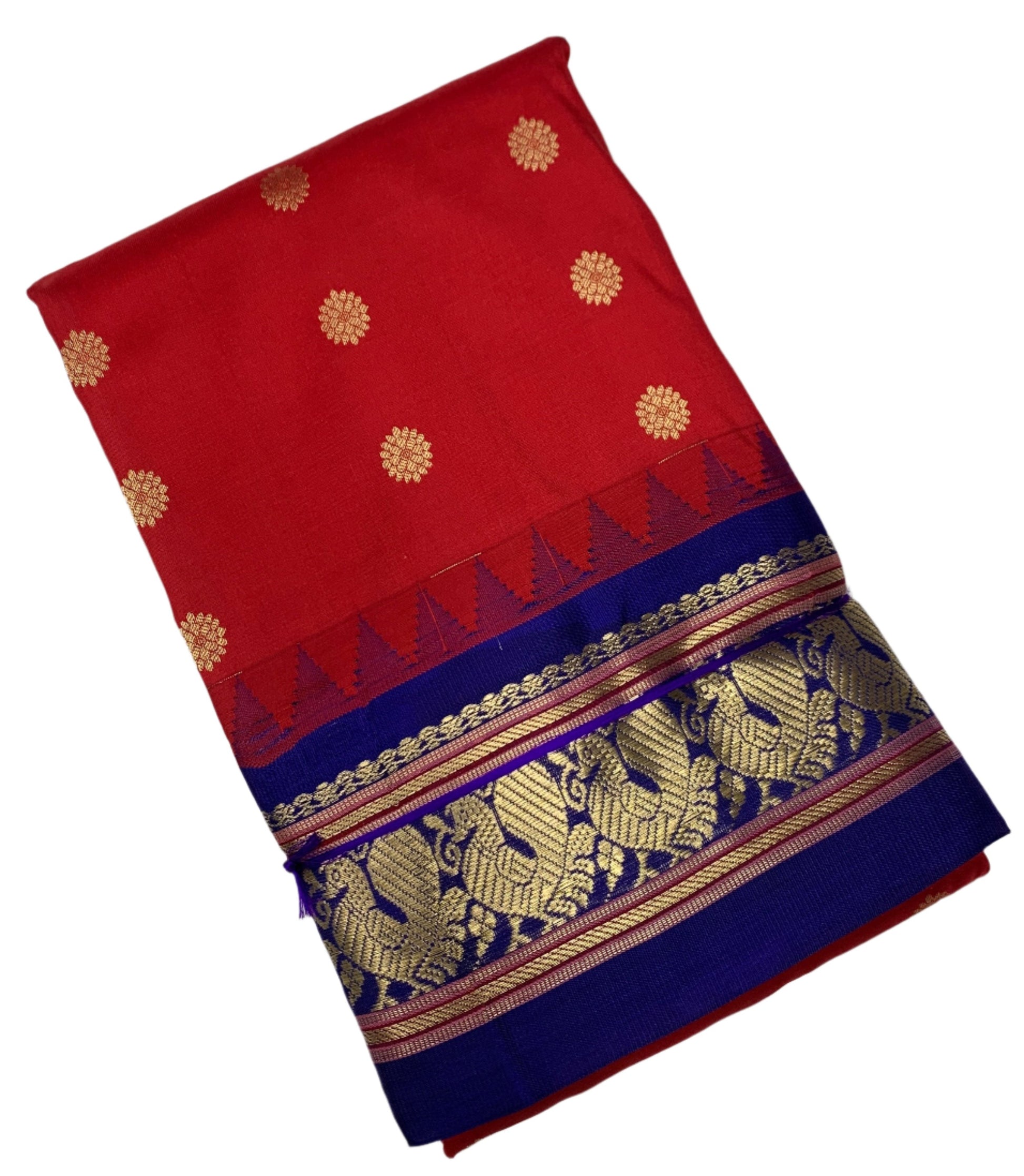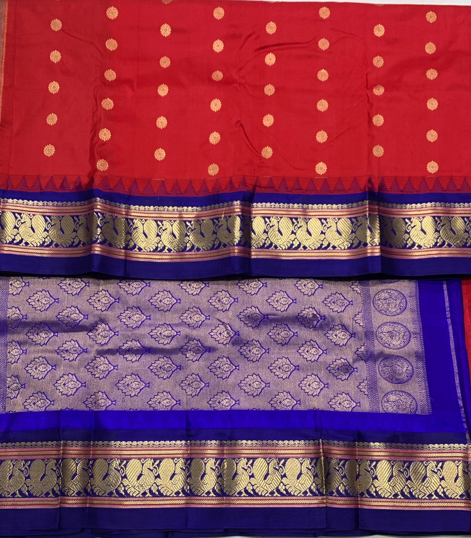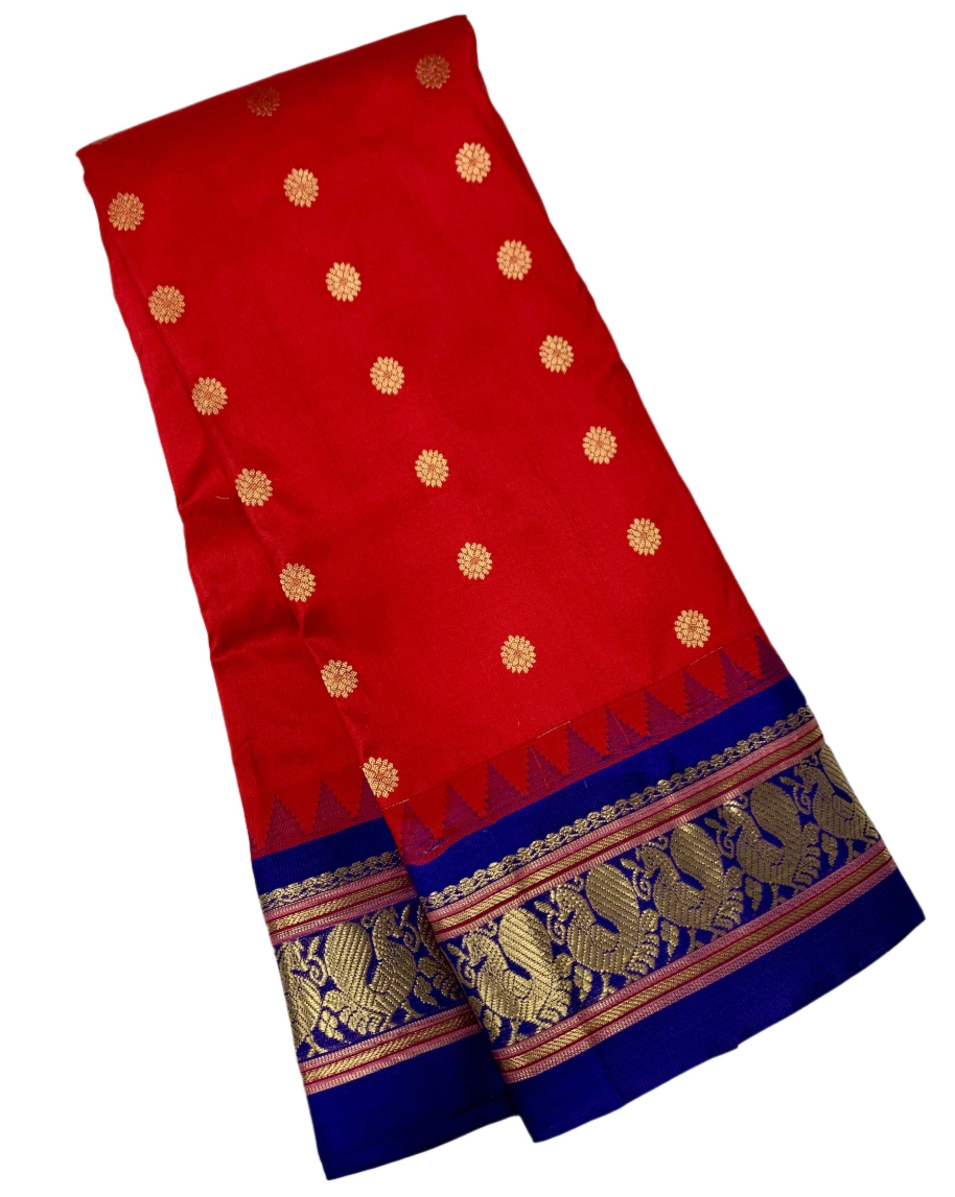 Pure Kanchipuram Silk Red Colour with Contrast Blue Annam Border