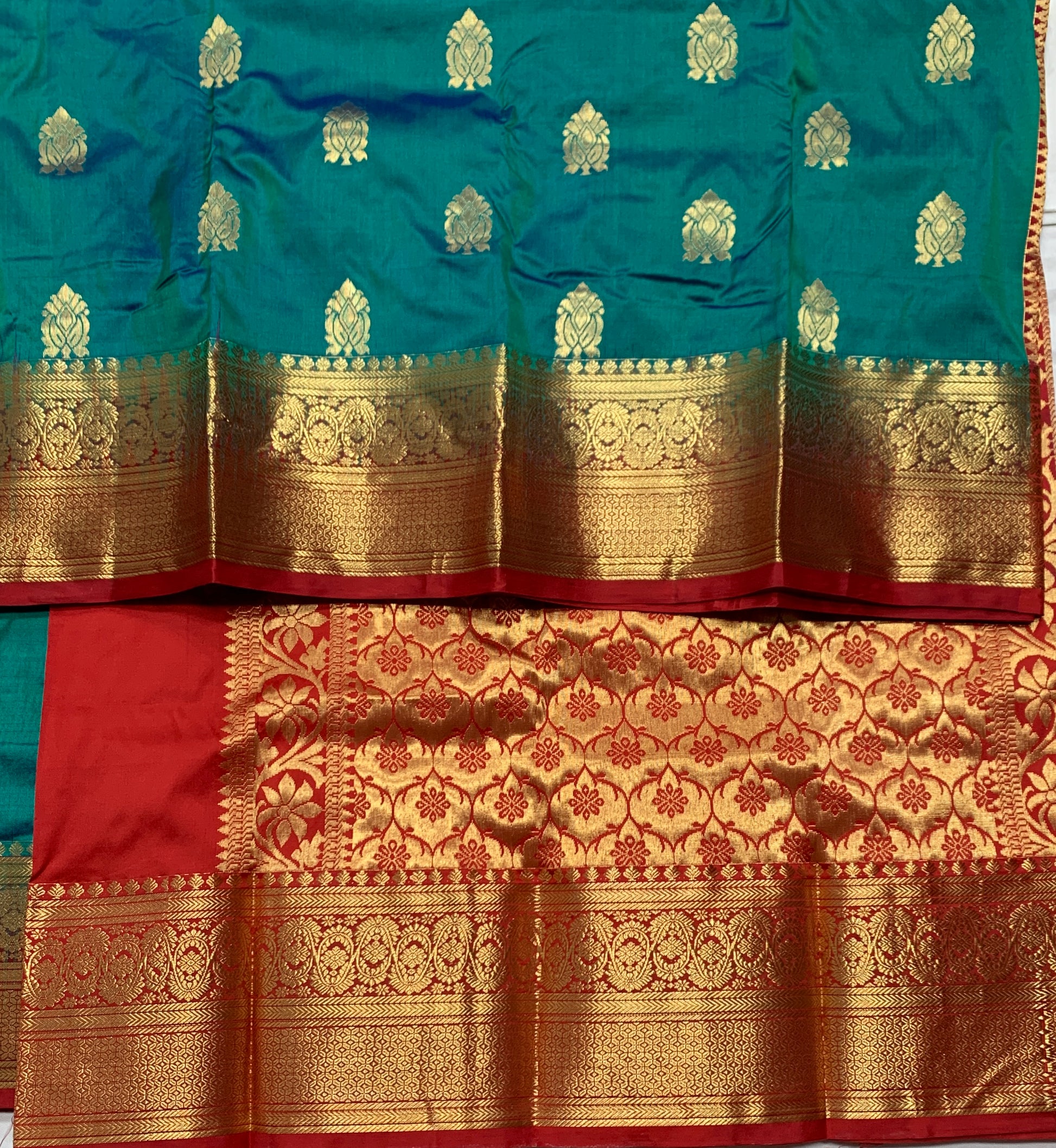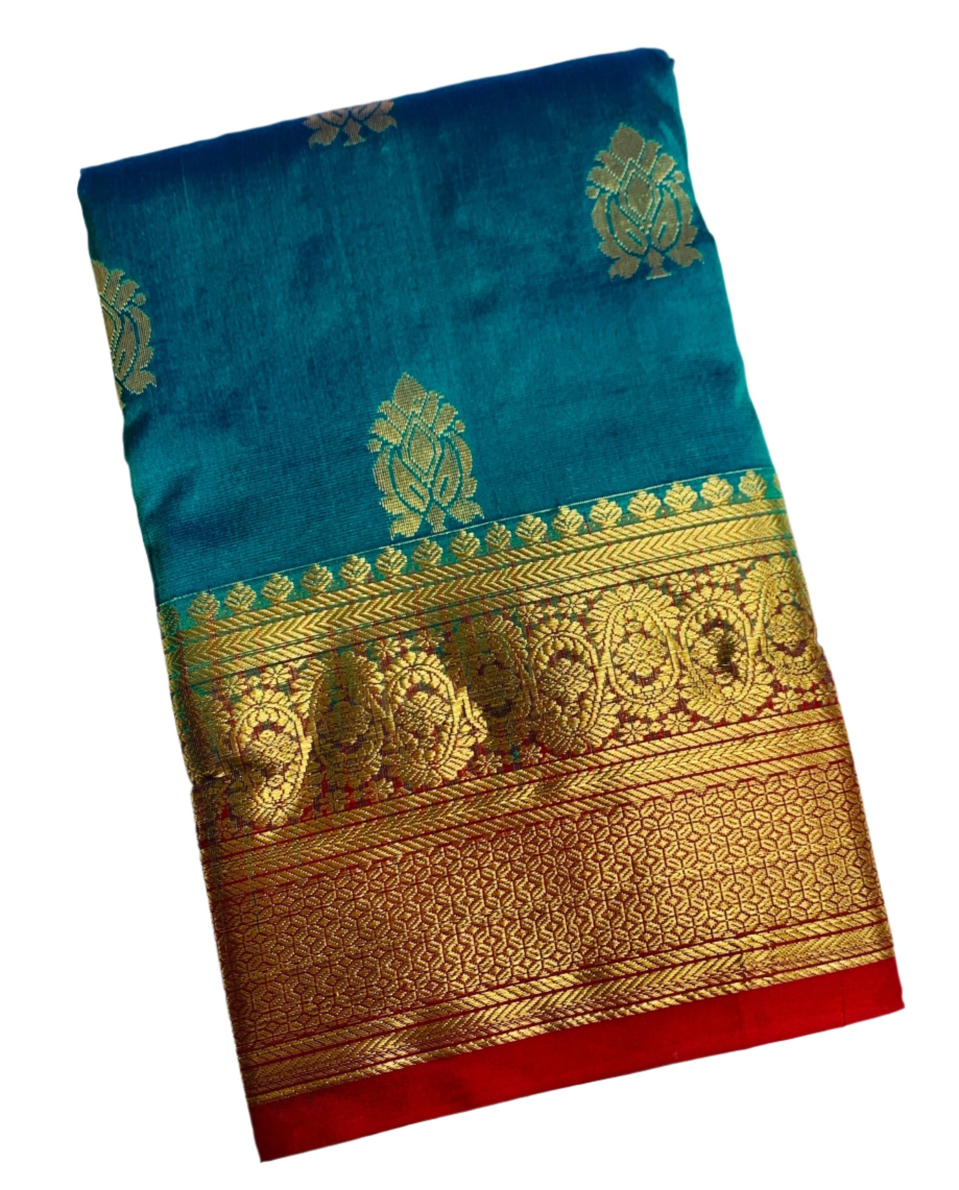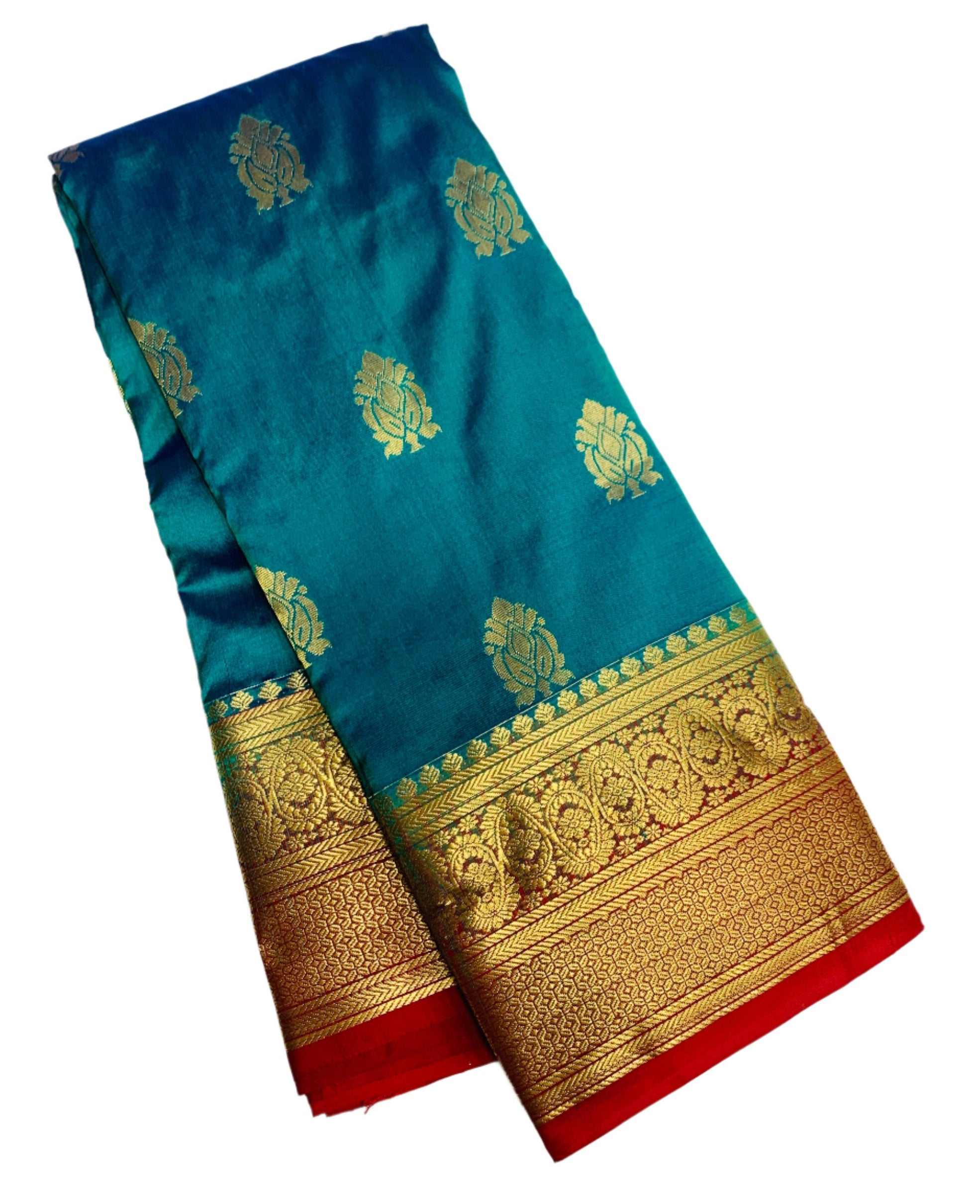 Pure Kanchipuram Sapphire Colour with Red Border. Soft and Light weight to Easy drape.