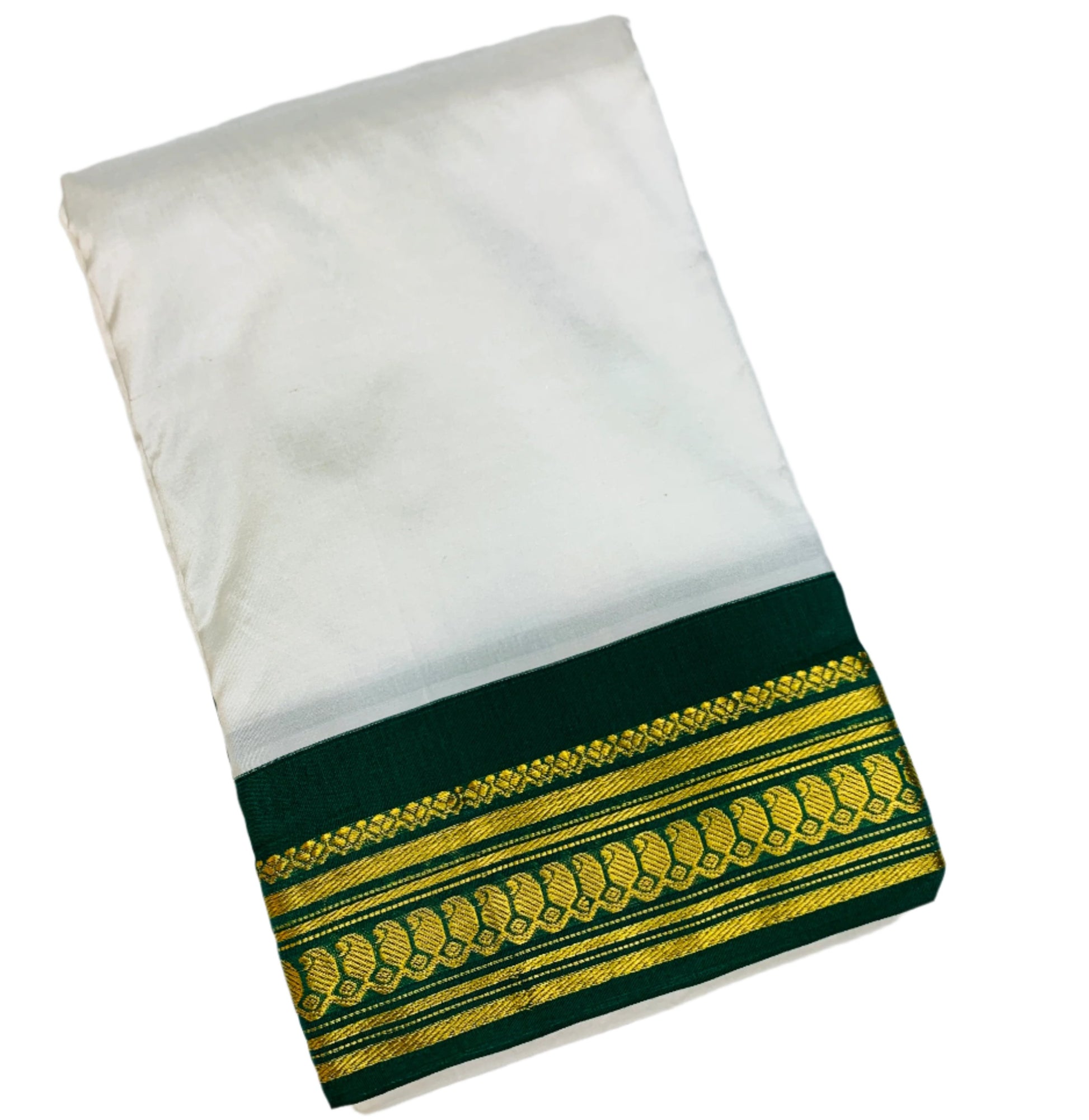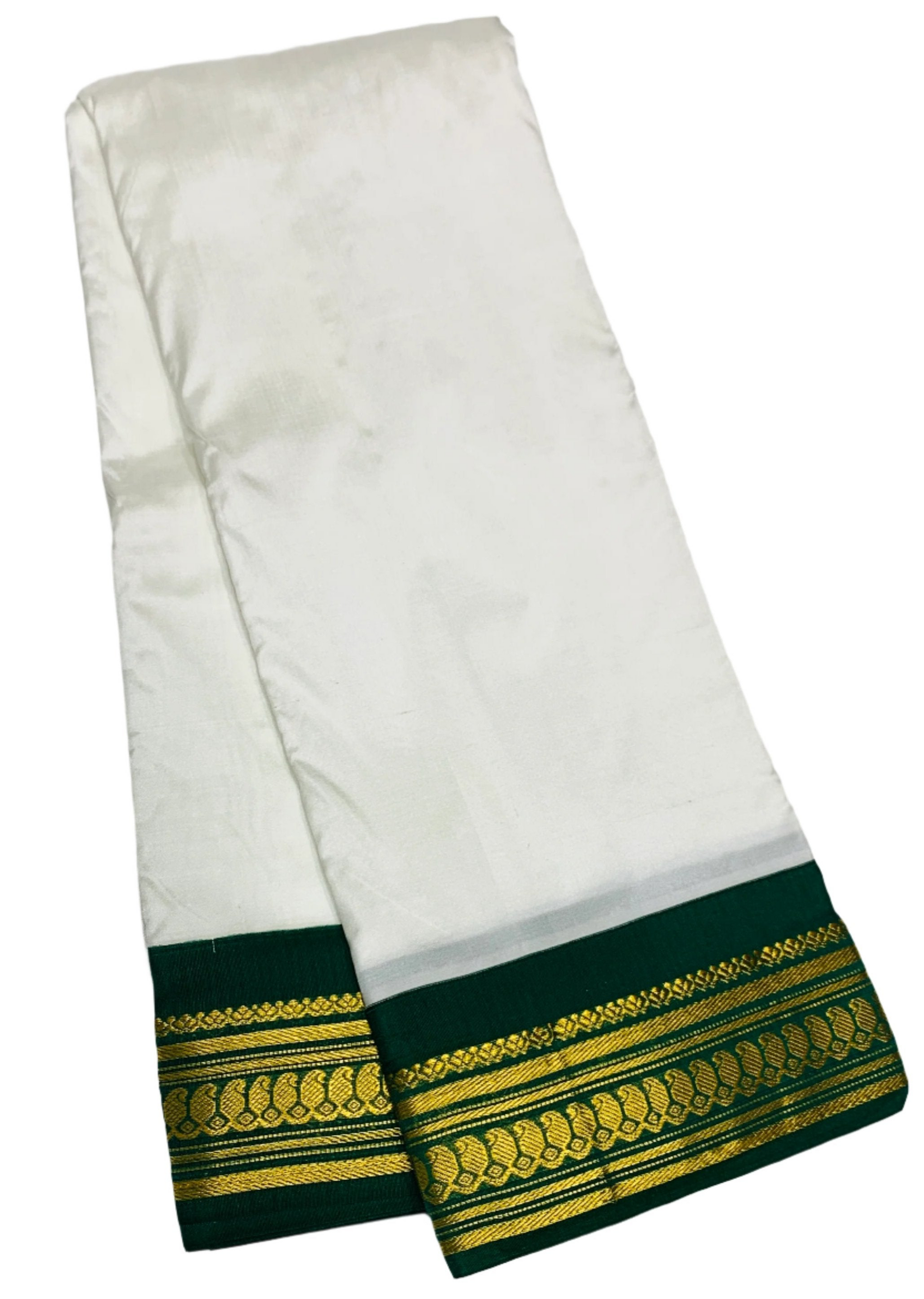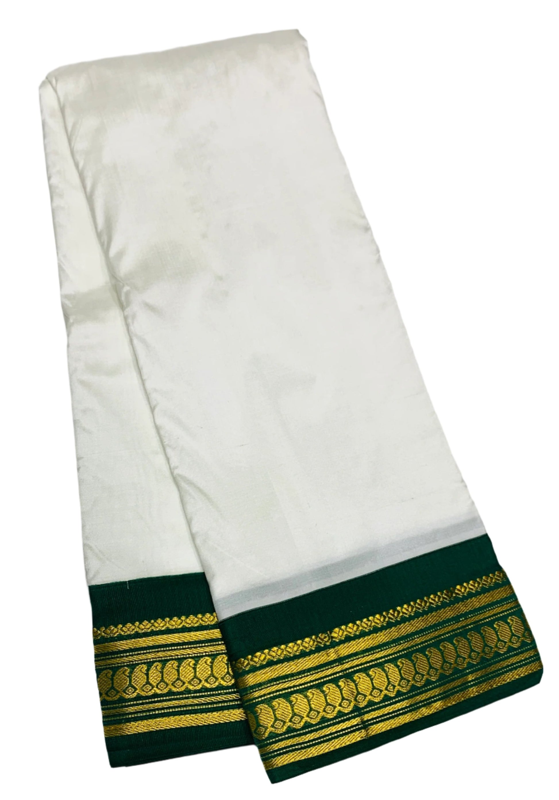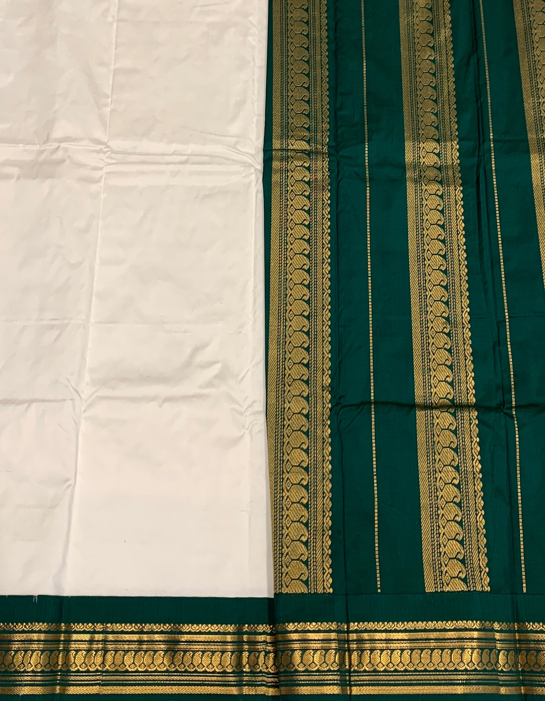 Pure Kanchipuram Silk White Colour with Green Border. Soft and Light weight to Easy drape.