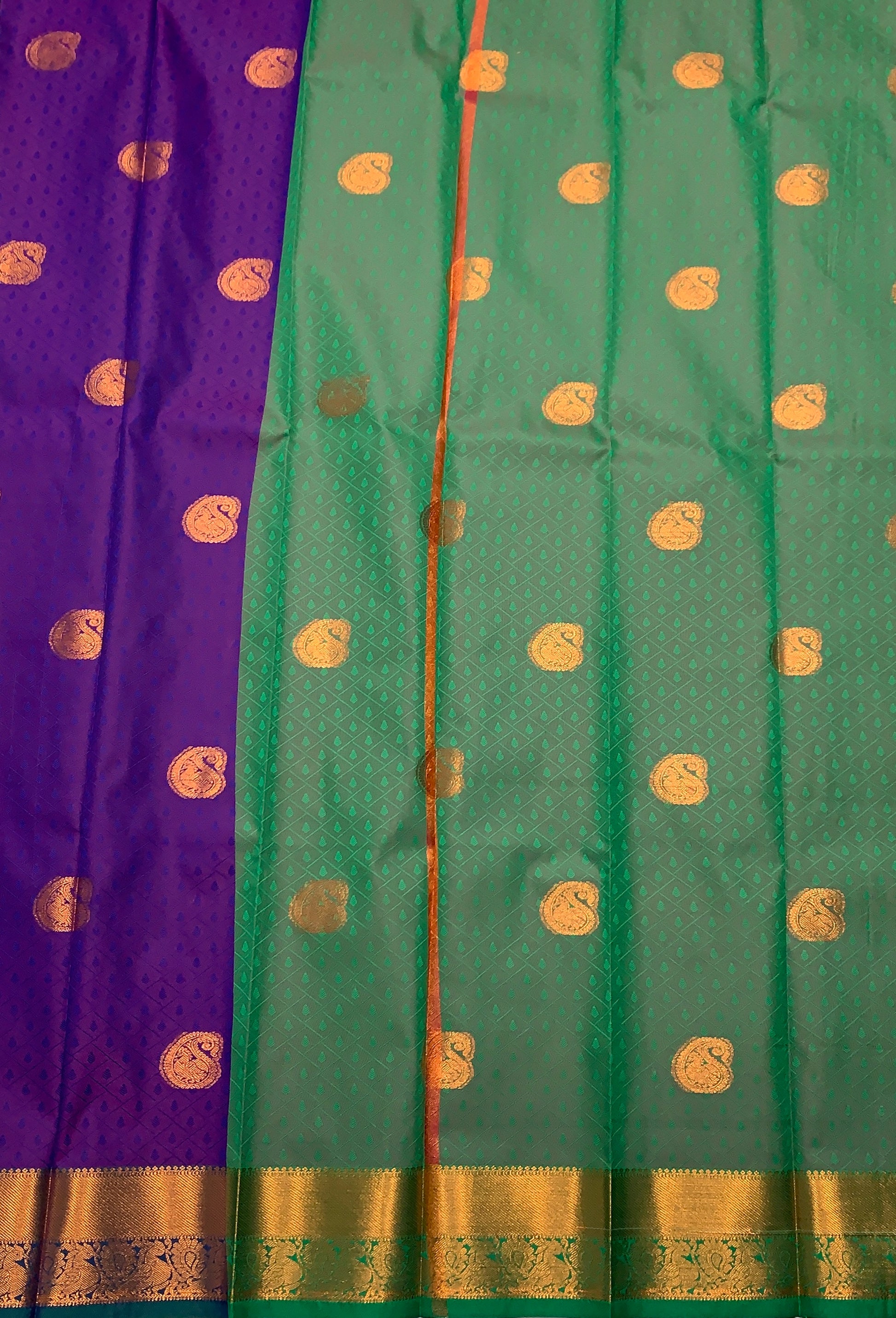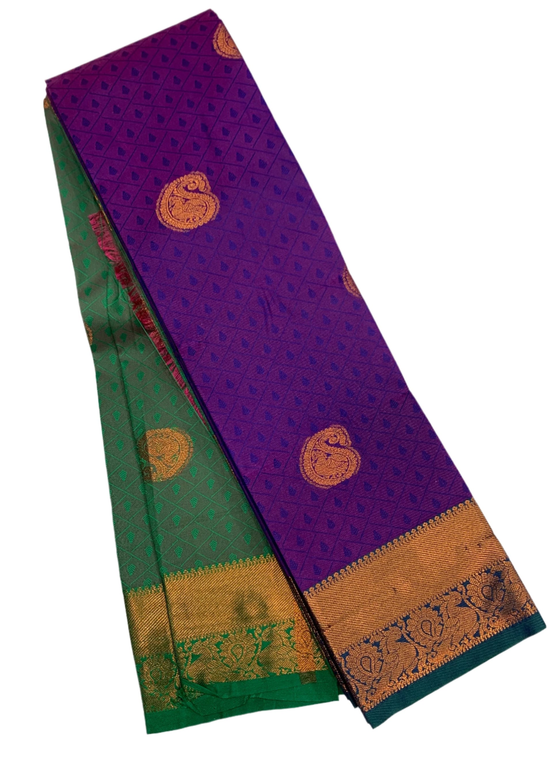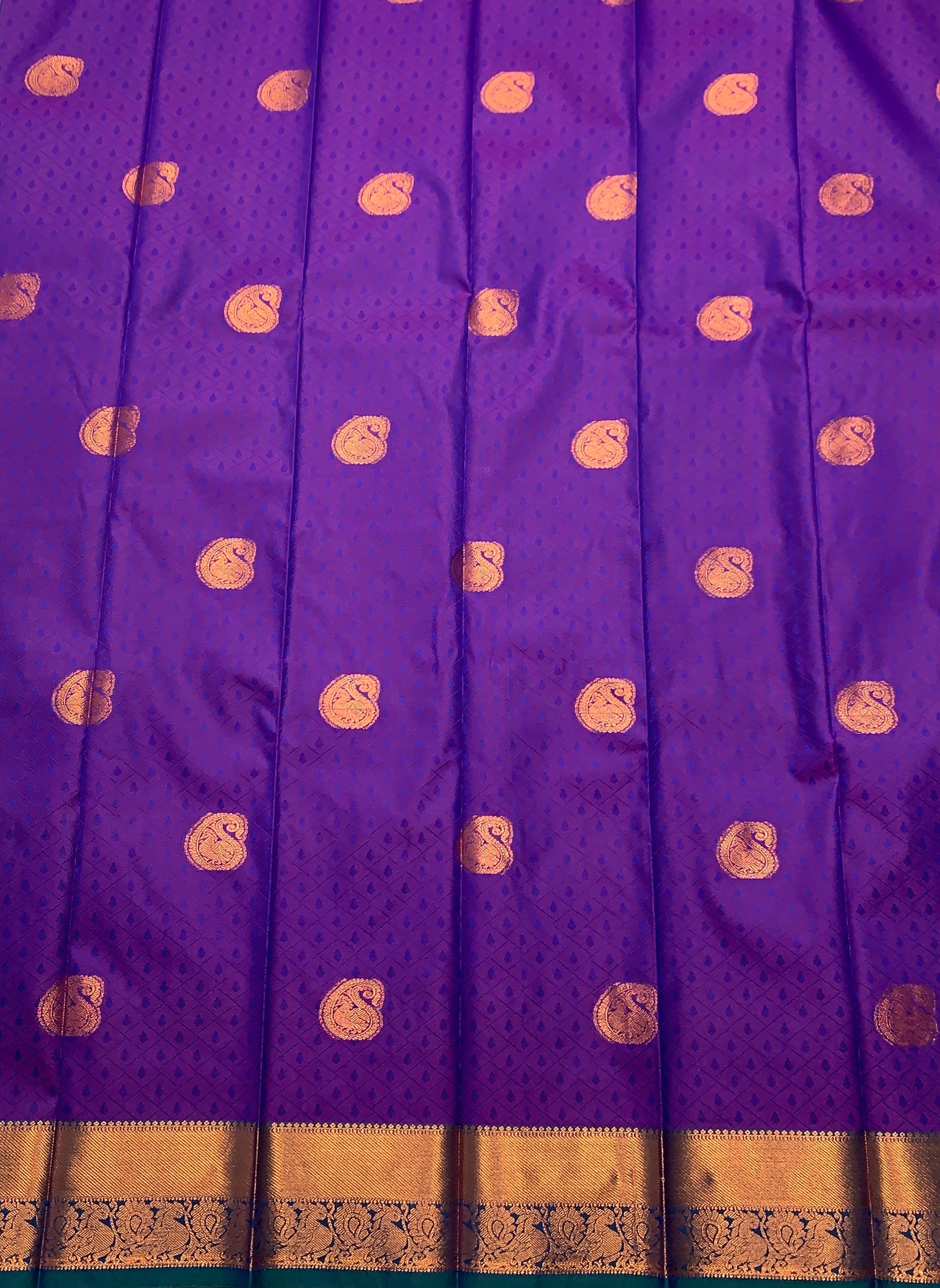 Purple Colour silk cotton with Copper Zari Border and Birds, Mango Design . Light weight and easy to drape.