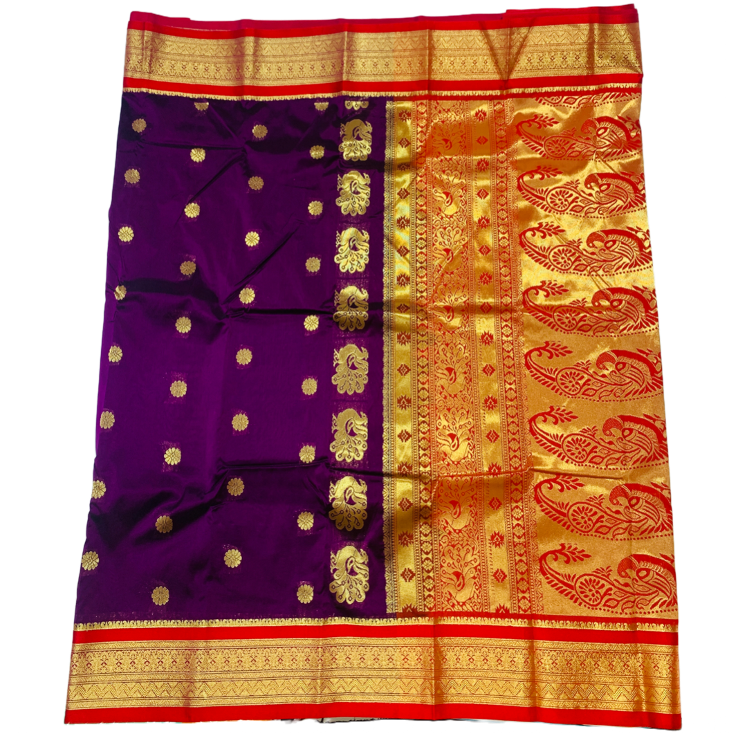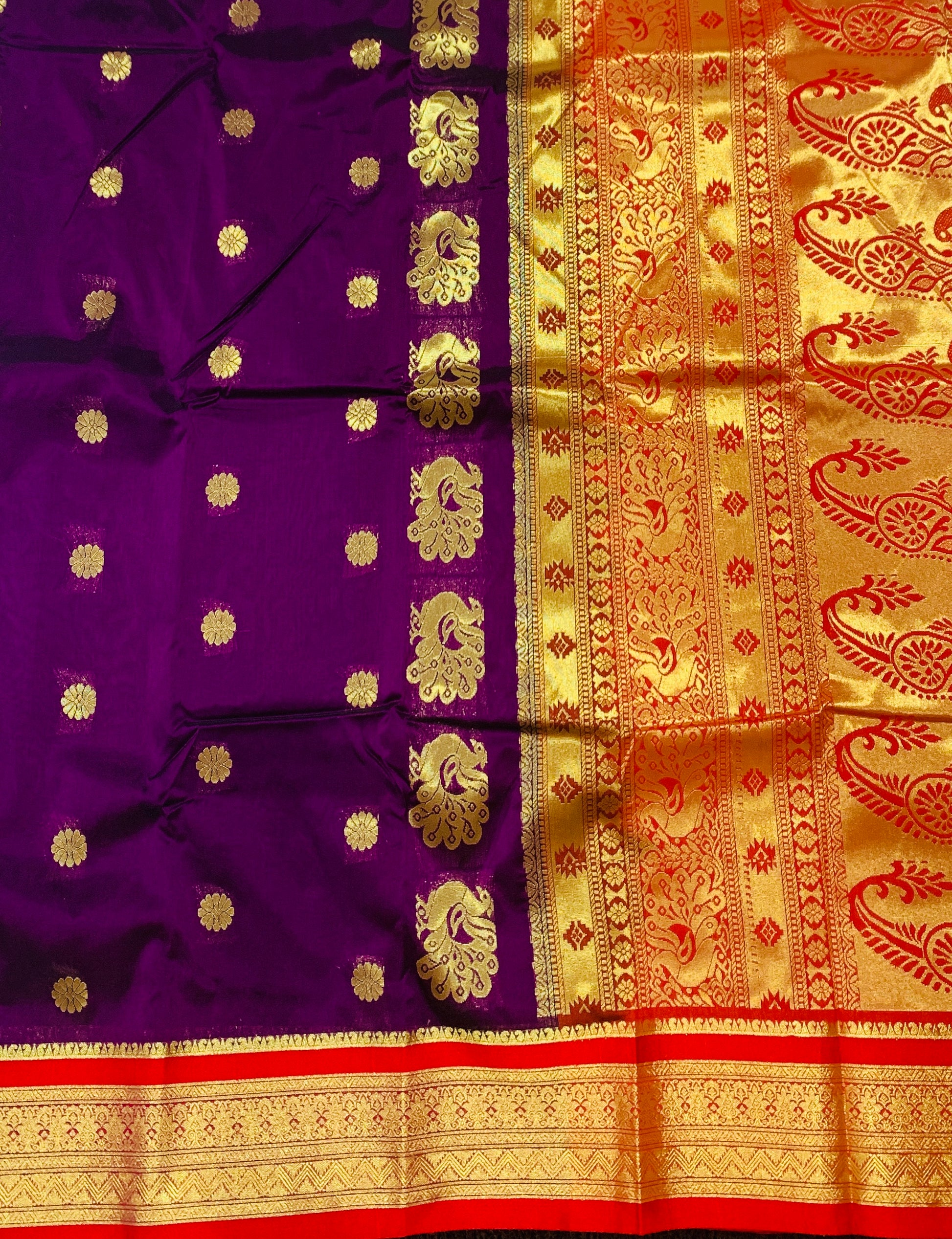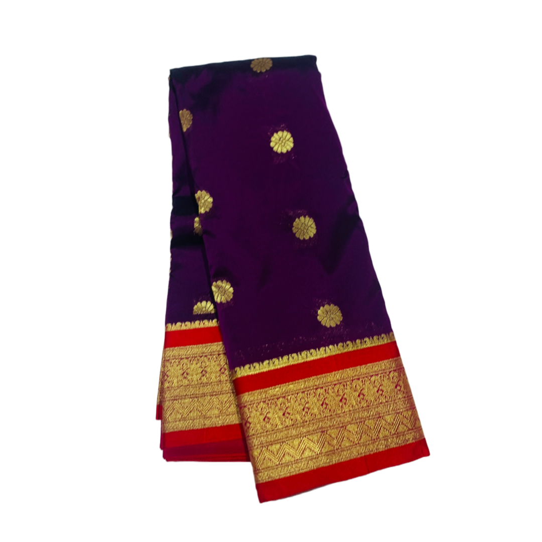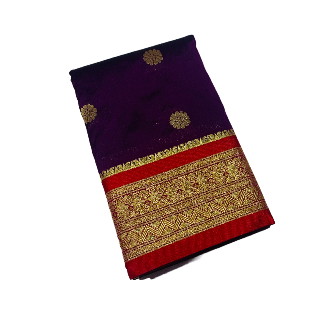 Purple shade saree with Sliver and Red Border.Light weight & easy to wash.